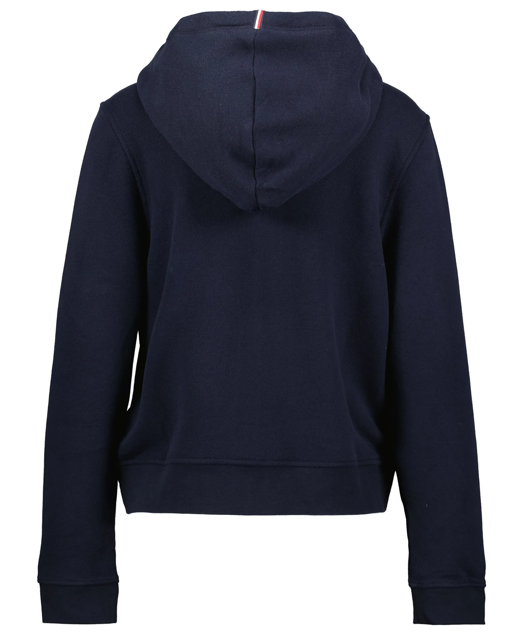 Morkbla Zip-Up Hoodie I Frotte Fran Tommy Hilfiger. Tillverkad I En Ekologisk Bomullsblanding. Huva Med Dragsko. Delad Kanguruficka. Tommy Hilfiger-Logga Pa Brostet Samt Tommy Hilfiger Flaggabroderi Vid Mudd. Normal Passform Med Nagot Tappade Axlar.