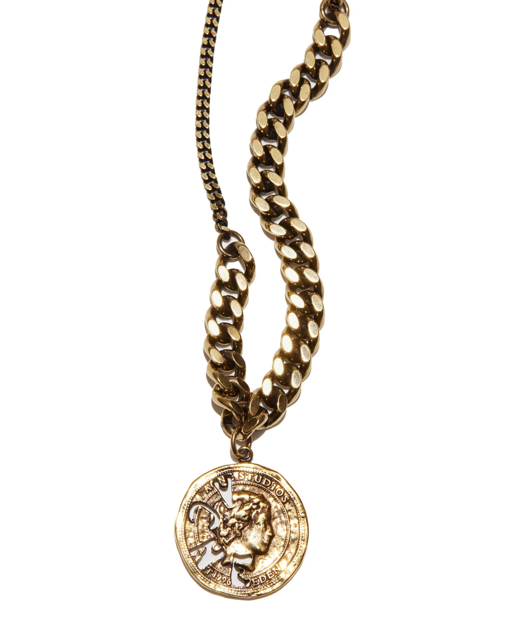 Guldfargat Halsband Med Mynt Med Utstansad Logotyp. Grovre Kedja Framtill. Tillverkad I Brass.