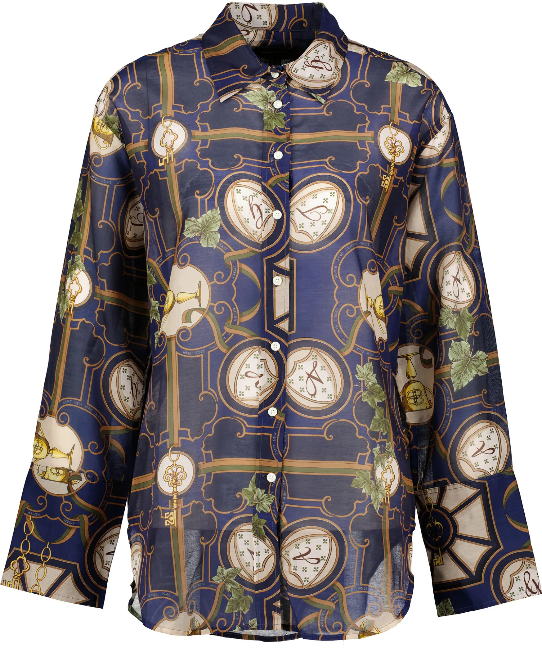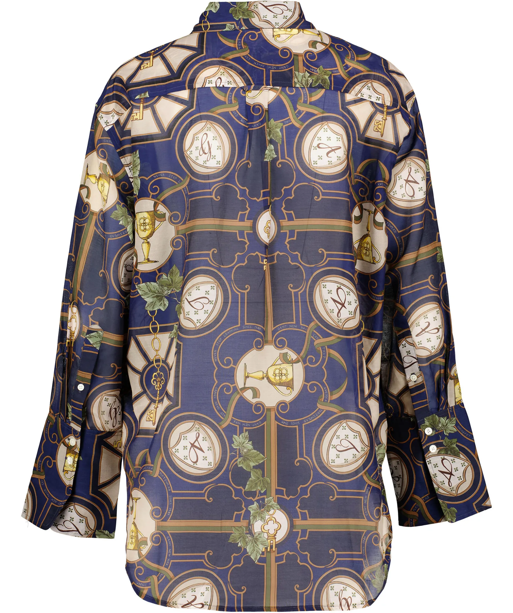 Morkbla, Brun Och Gron Monstrad Skjorta Fran Gant. Tillverkadi Bomull Och Silkes Blandning. Skjortan Har En Klassisk Silhuett, Enkel Krage, Breda Manschetter. Locker Loop Och Boxpleat I Ryggen.