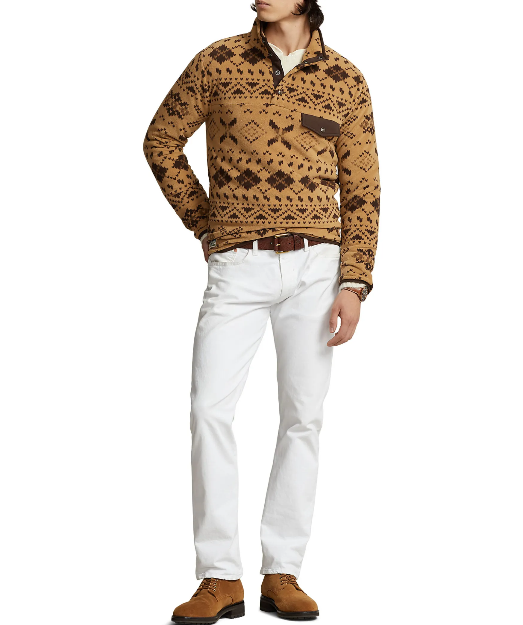 Beige Och Brun Monstrad Fleece Troja Fran Polo Ralph Lauren. Hog Krage Med Tryckknappar. Smal Elastisk Mudd Vid Arm- Och Plaggslut. Brostficka Pa Vanster Sida Som Stangs Med Tryckknappar Och Lock I Vavt Material. Patch Med Logotyp Pa Hoger Sida Vid Plaggslut.