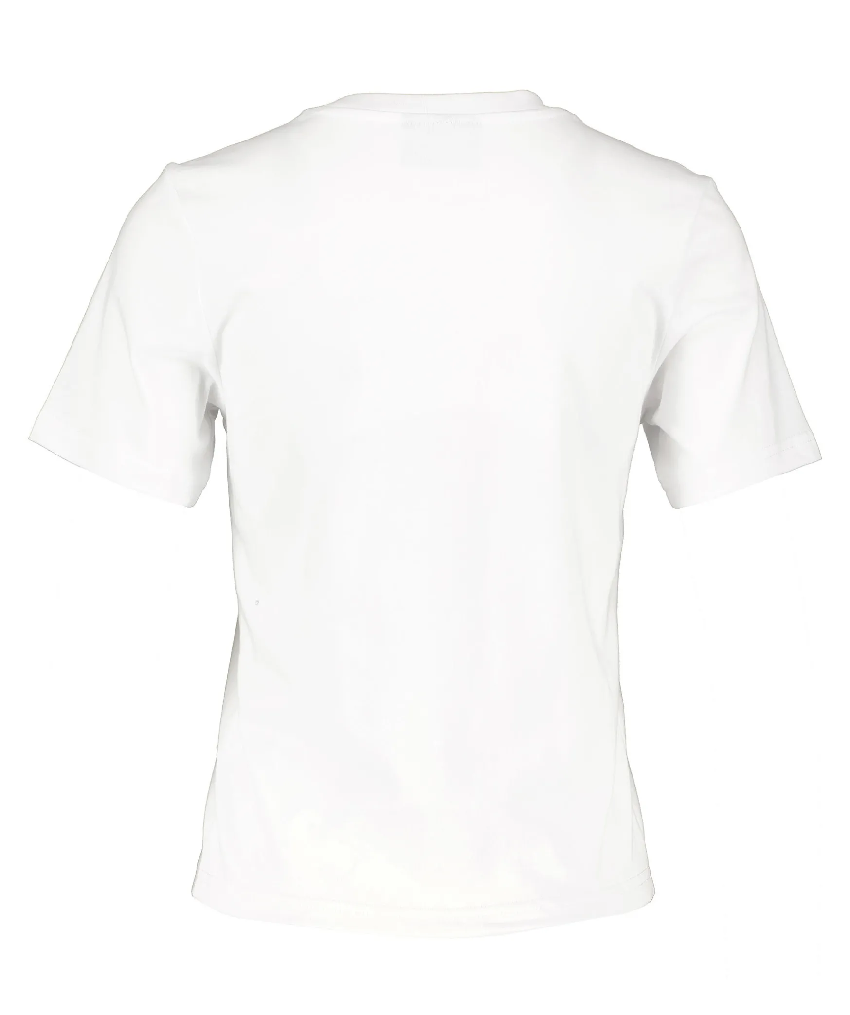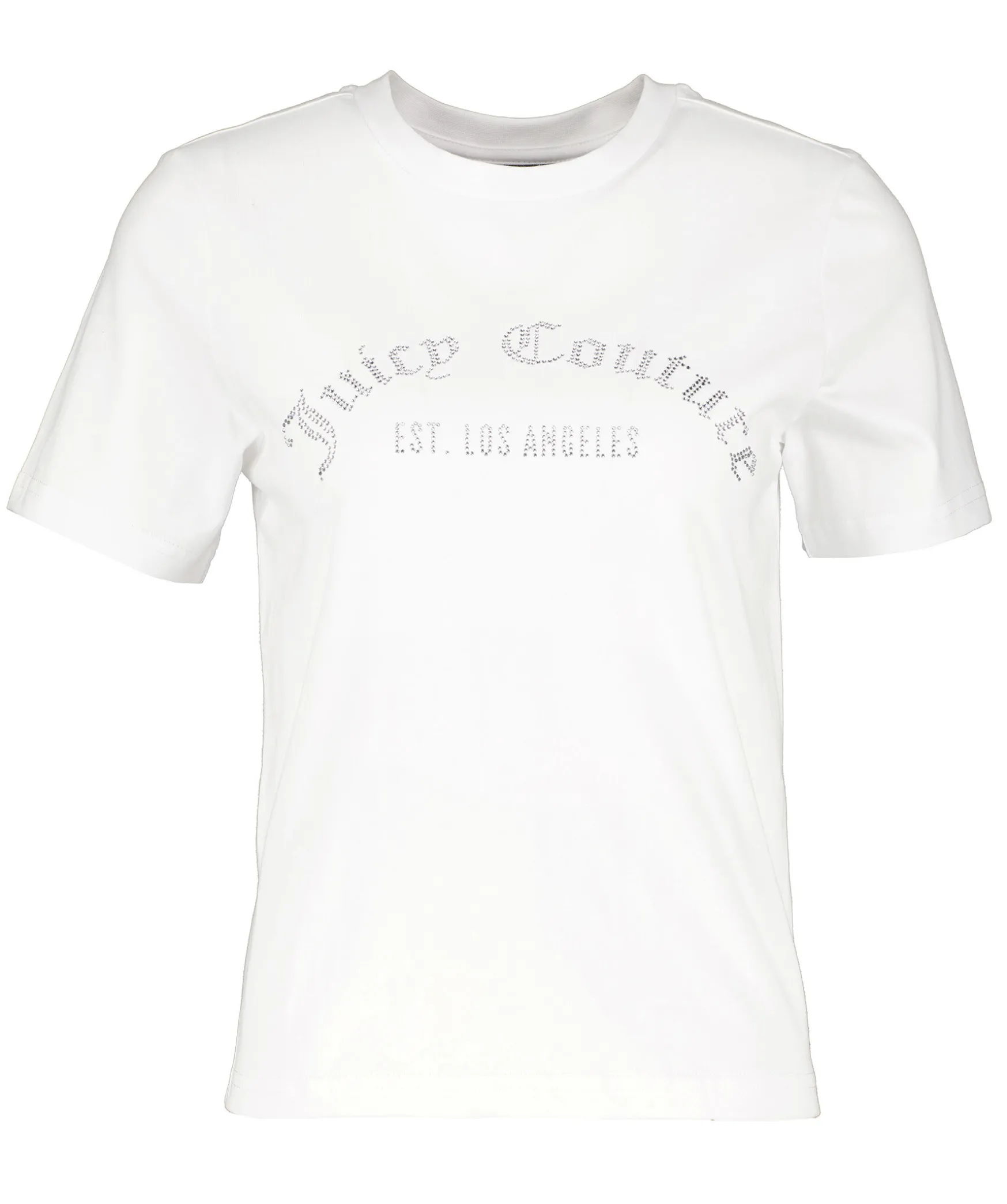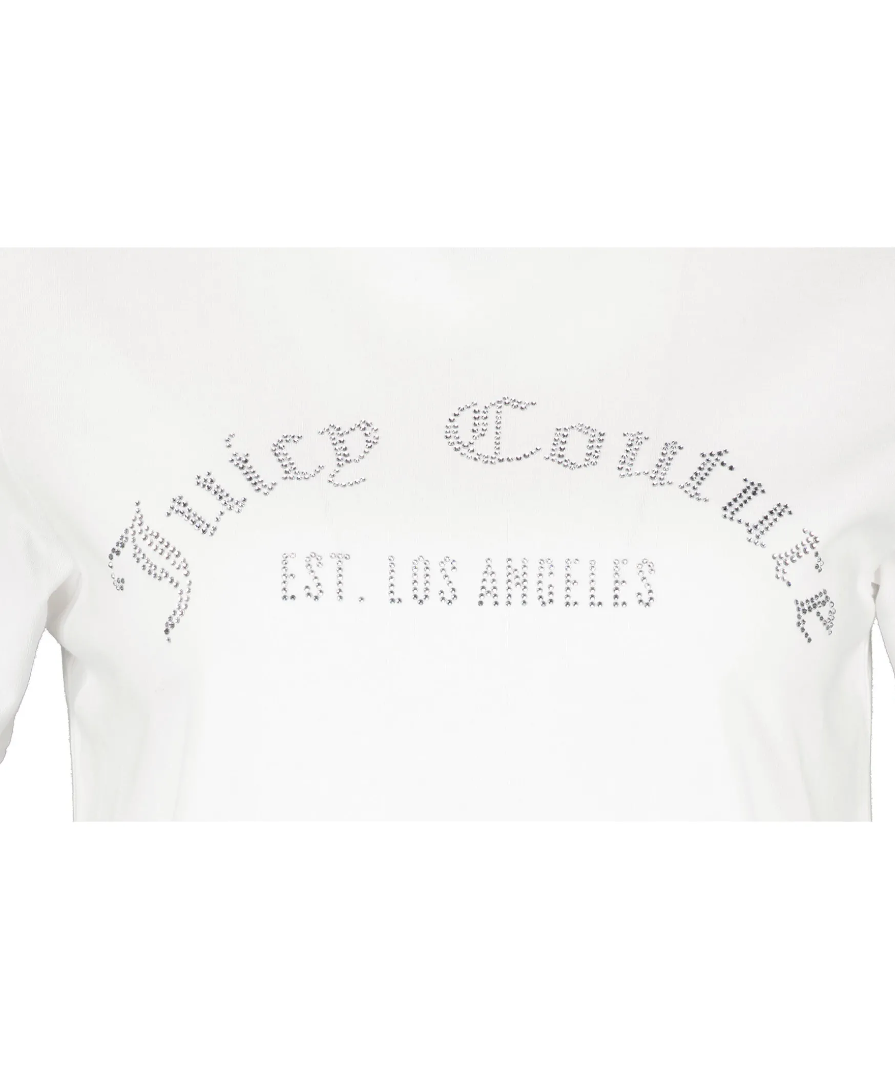 Vit T-Shirt Fran Juicy Couture. Loogtyp I Strass Over Brostet. Rundad Halsringning Med Ribbstickad Mudd. Tillverkad I 100% Bomull