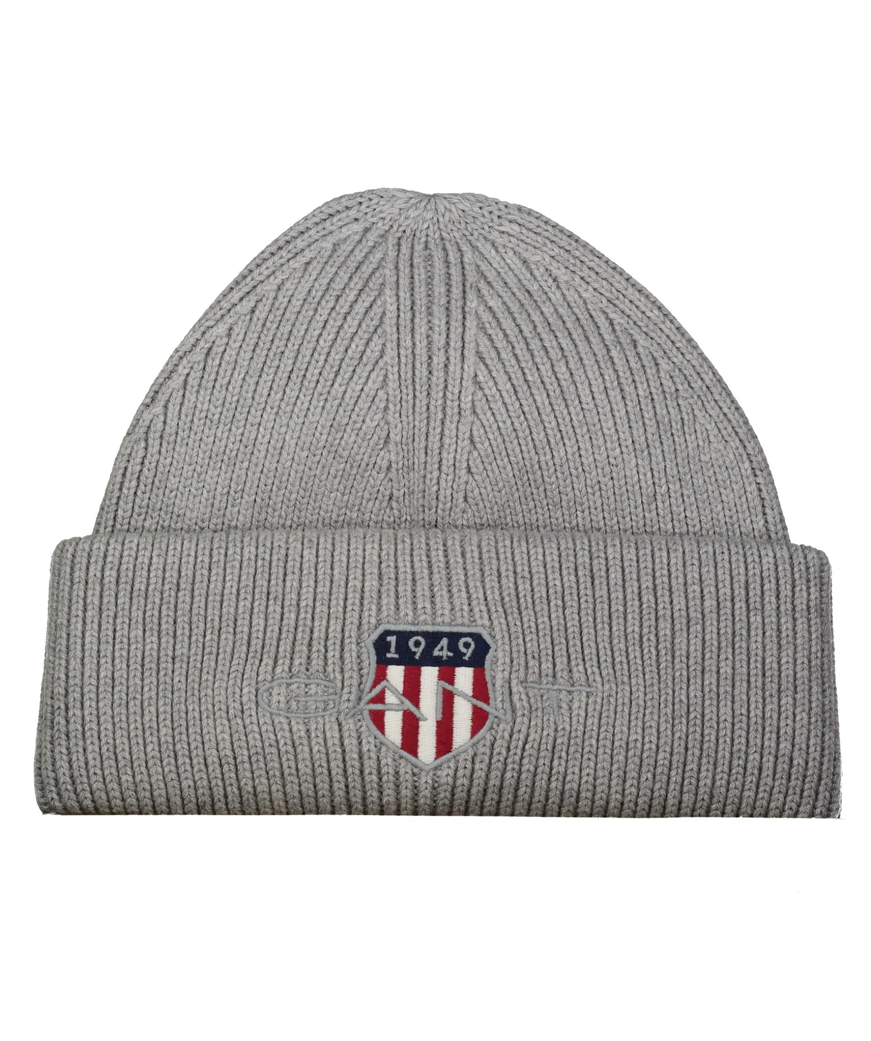 Gra Ribbstickad Mossa Fran Gant. Uppvikt Kant Med Broderad Logotyp Och Skold. Tillverkad I Bomulls Och Ull Blandning.