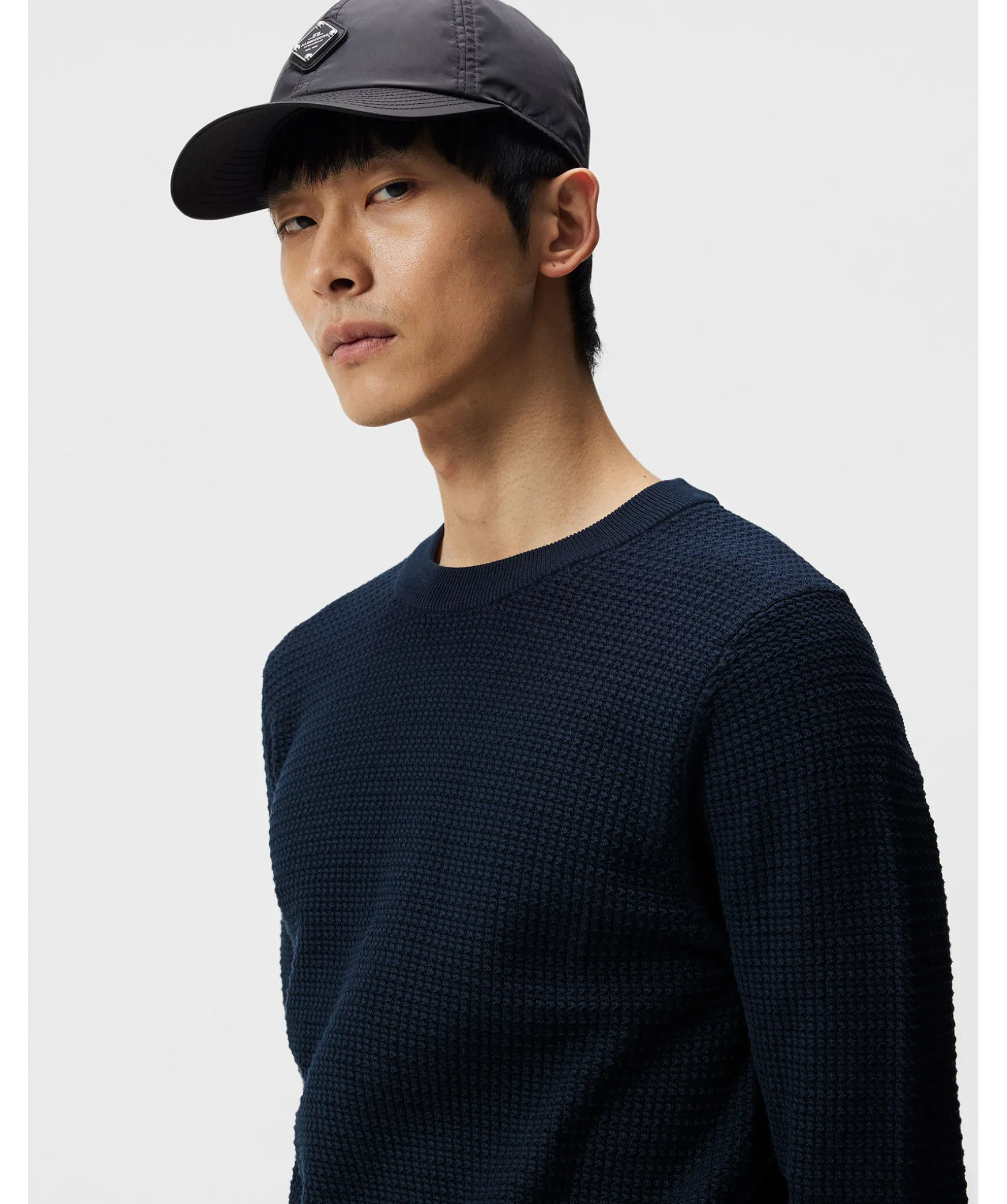 Morkbla Stickad Troja Fran J Lindeberg. Ribbstickade Muddar Vid Arm- Och Plaggslut. Rundad Halsringning. Tillverkad I 100% Bomull.
