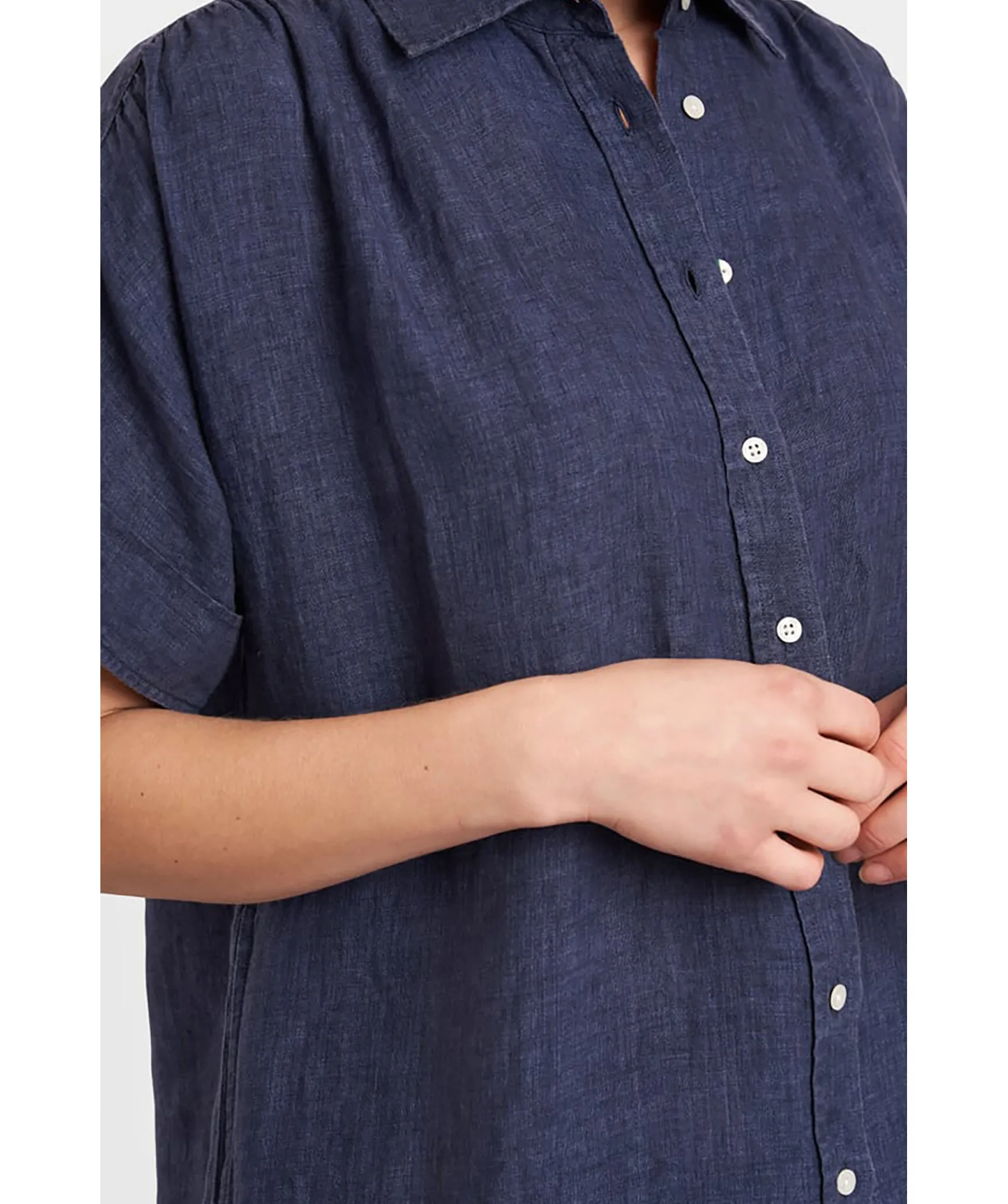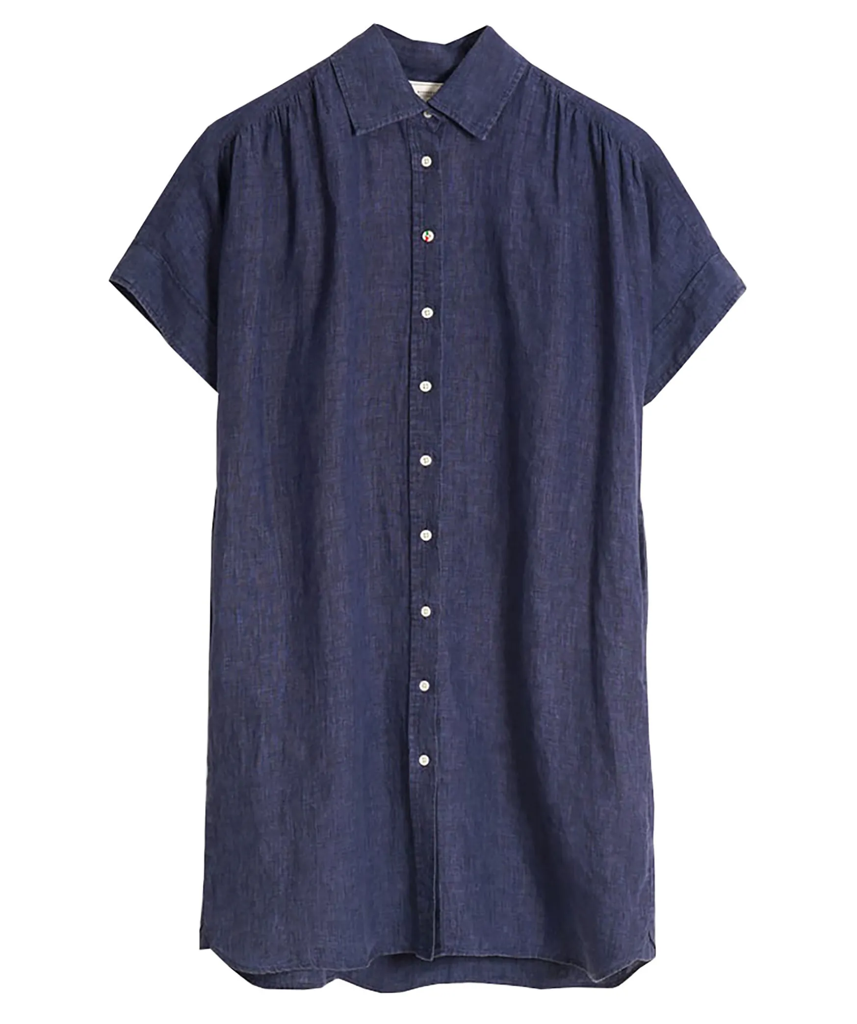 Morkbla Linneklanning Med Kort Arm Fran Boomerang. Rak Ledig Passform Med Rynk Pa Axeln Och I Ryggen. Handmalad Boomerang-Knapp Som Tredje Knapp. Tillverkad I 100% Linne. Stor I Storleken.