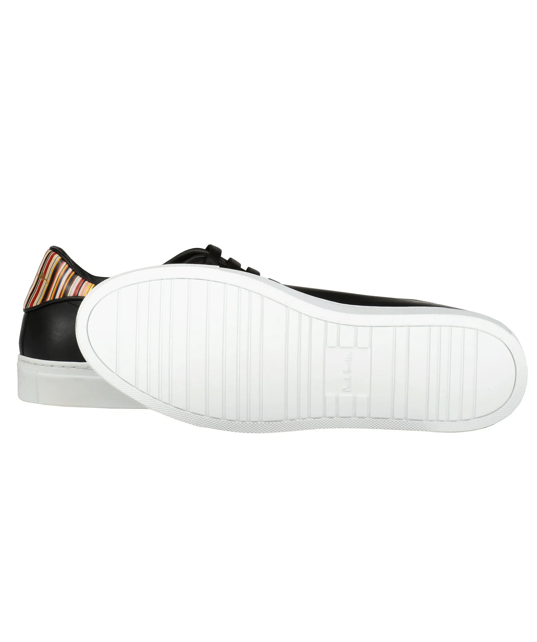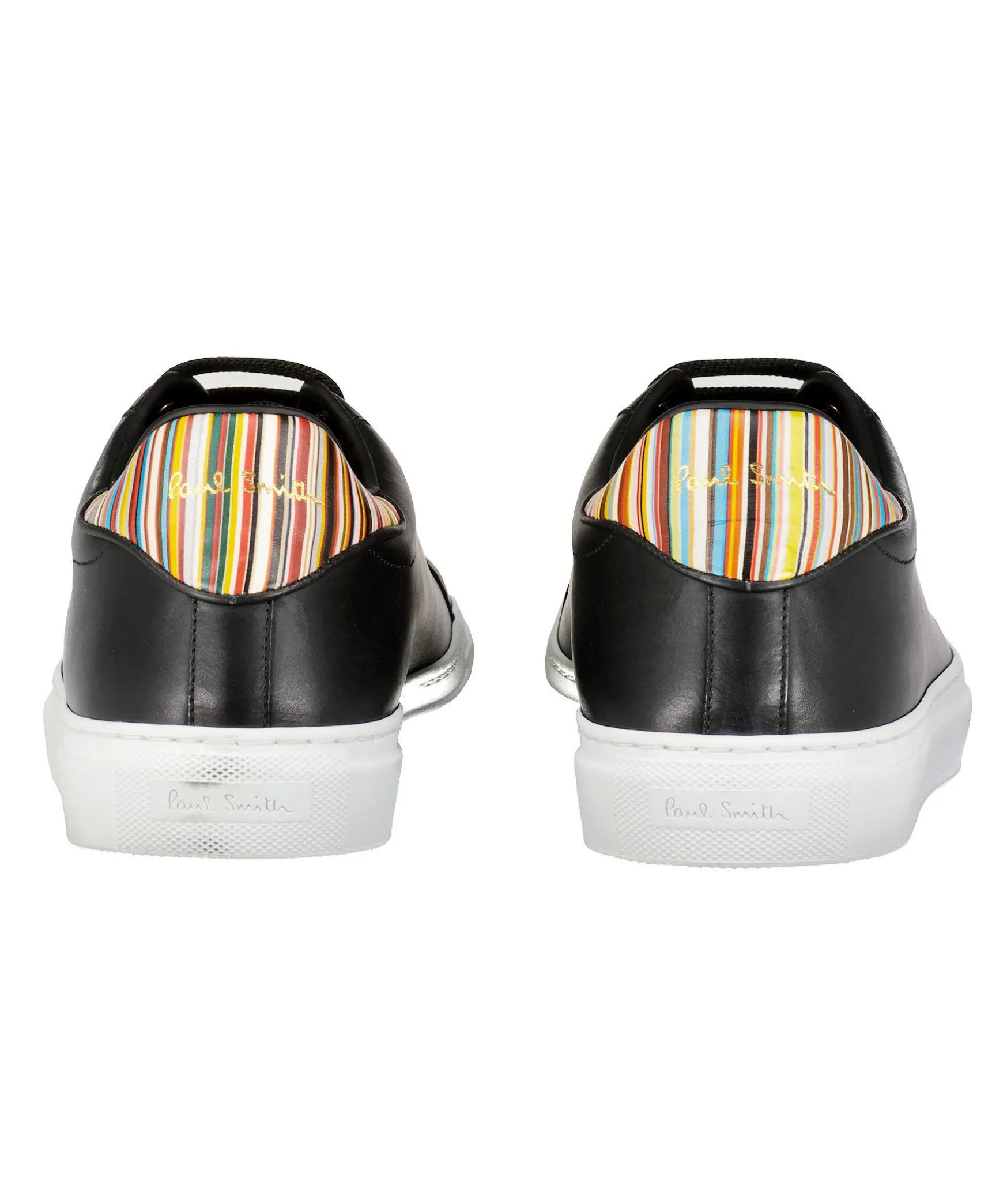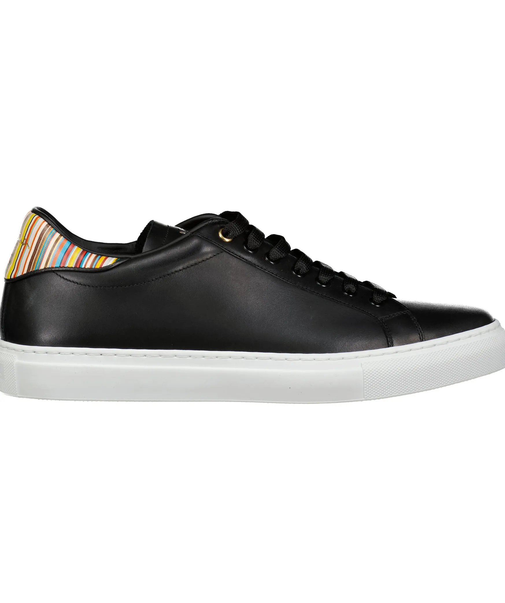 Svarta Sneakers I Lader Fran Paul Smith. Randig Detalj Pa Halen. Guldfargad Logotyp Pa Plosen Och Halen, Stansad Logotyp Pa Sulans Hal. Vit Hog Sula I Gummi. Platta Skosnoren. Guldfargad Snorningshal Upptill.