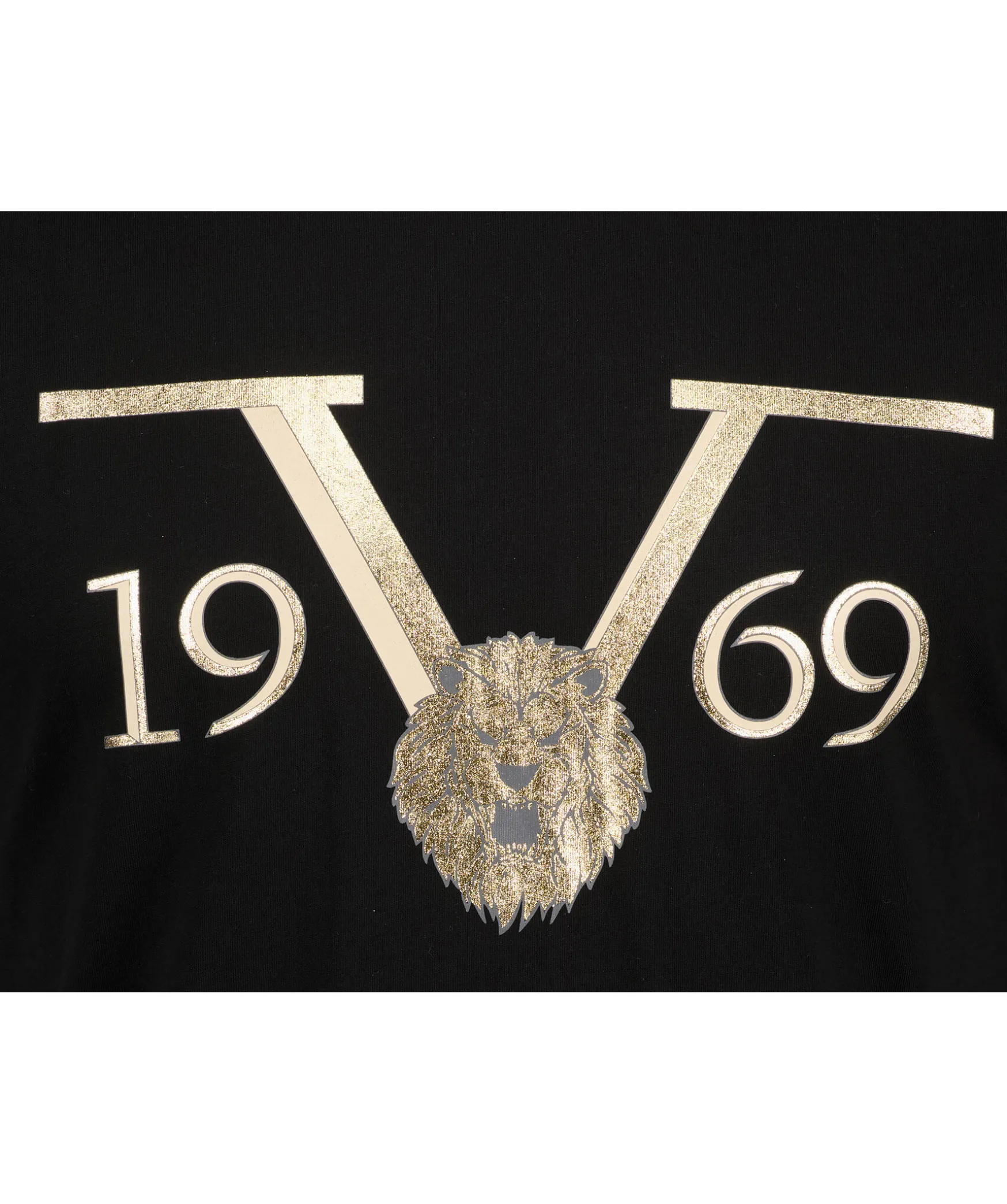 Svart T-Shirt Fran 19V69 Italia By Versace. Tillverkad I 100% Bomull. Guldglittrig Logotyp Pa Brostet. Ribbstickad Halsringning.