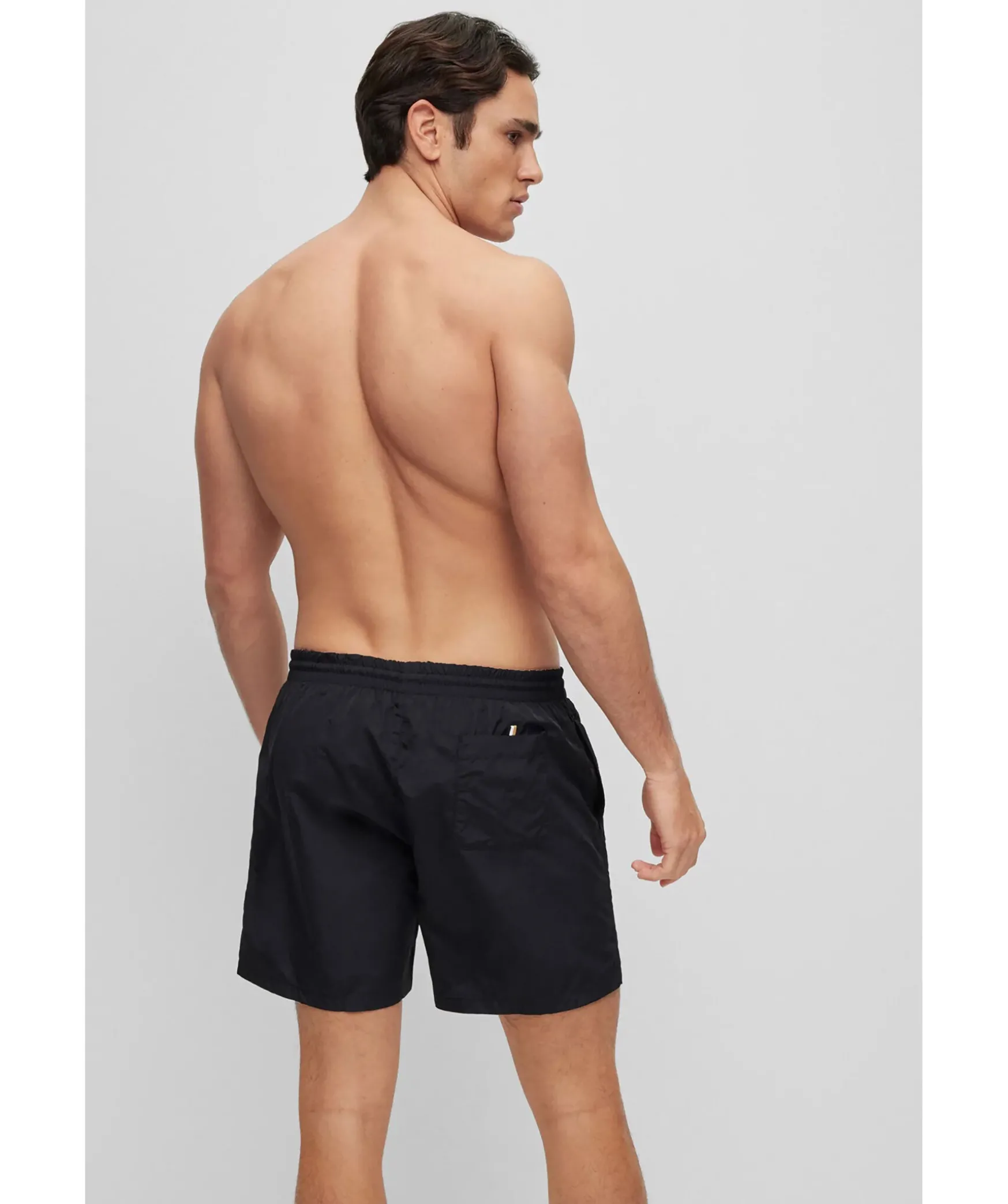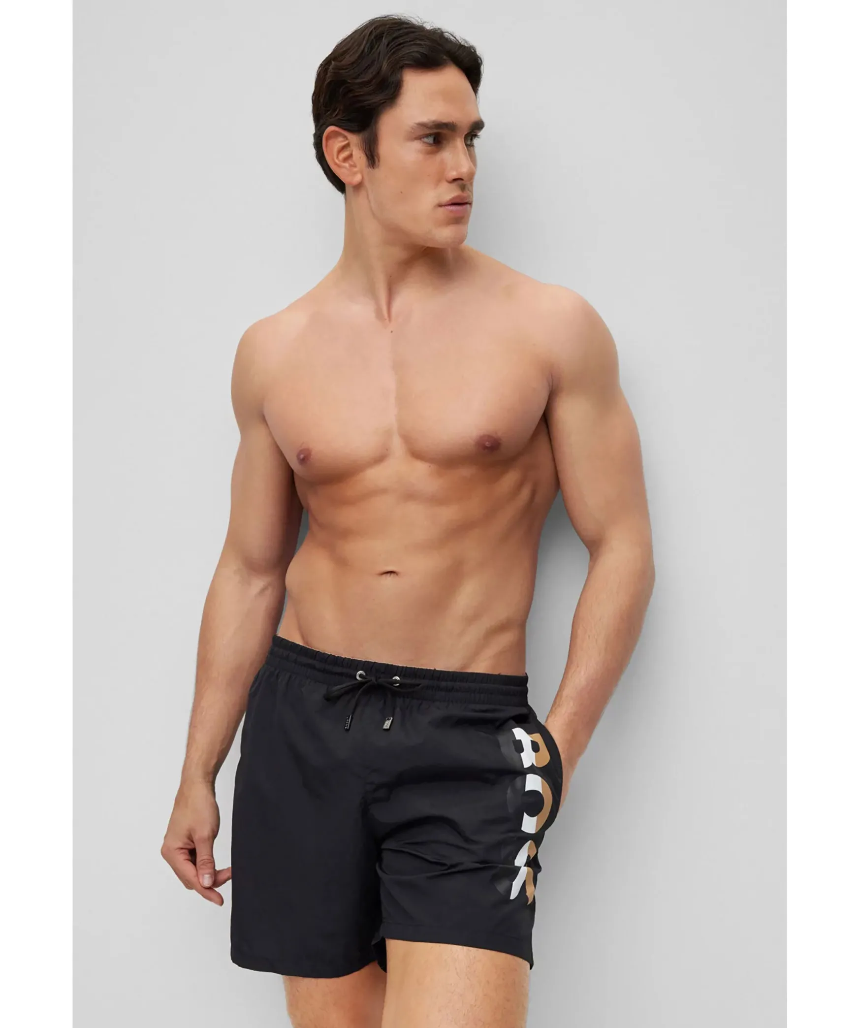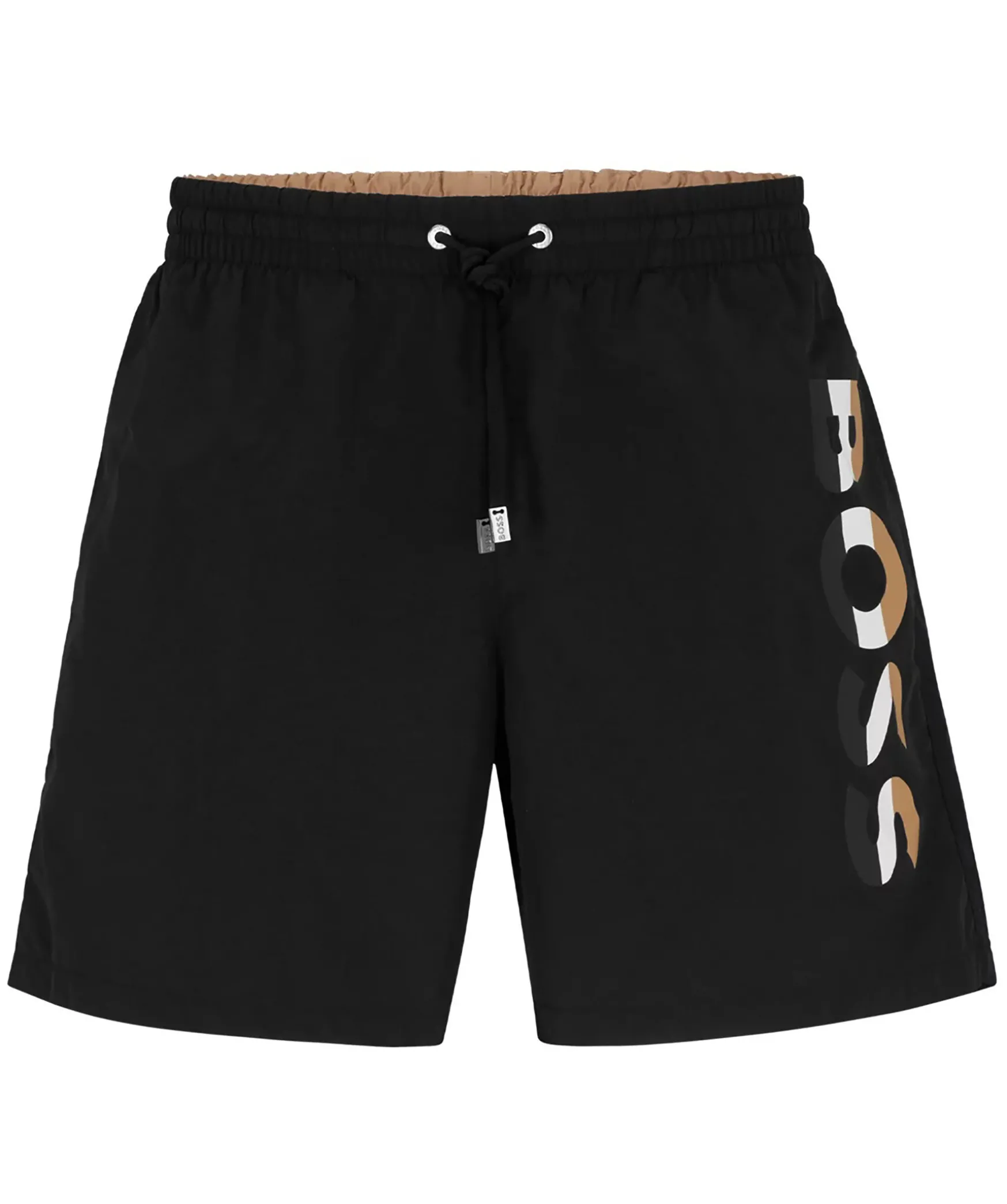 Svarta Badshorts Fran Boss Black. Dragsko Och Resar I Midjan. Tryckt Logotyp Pa Vanster Lar I Guld, Vitt Och Svart. Tva Fickor Framtill, En Bakficka Som Stangs Med Kardborre.