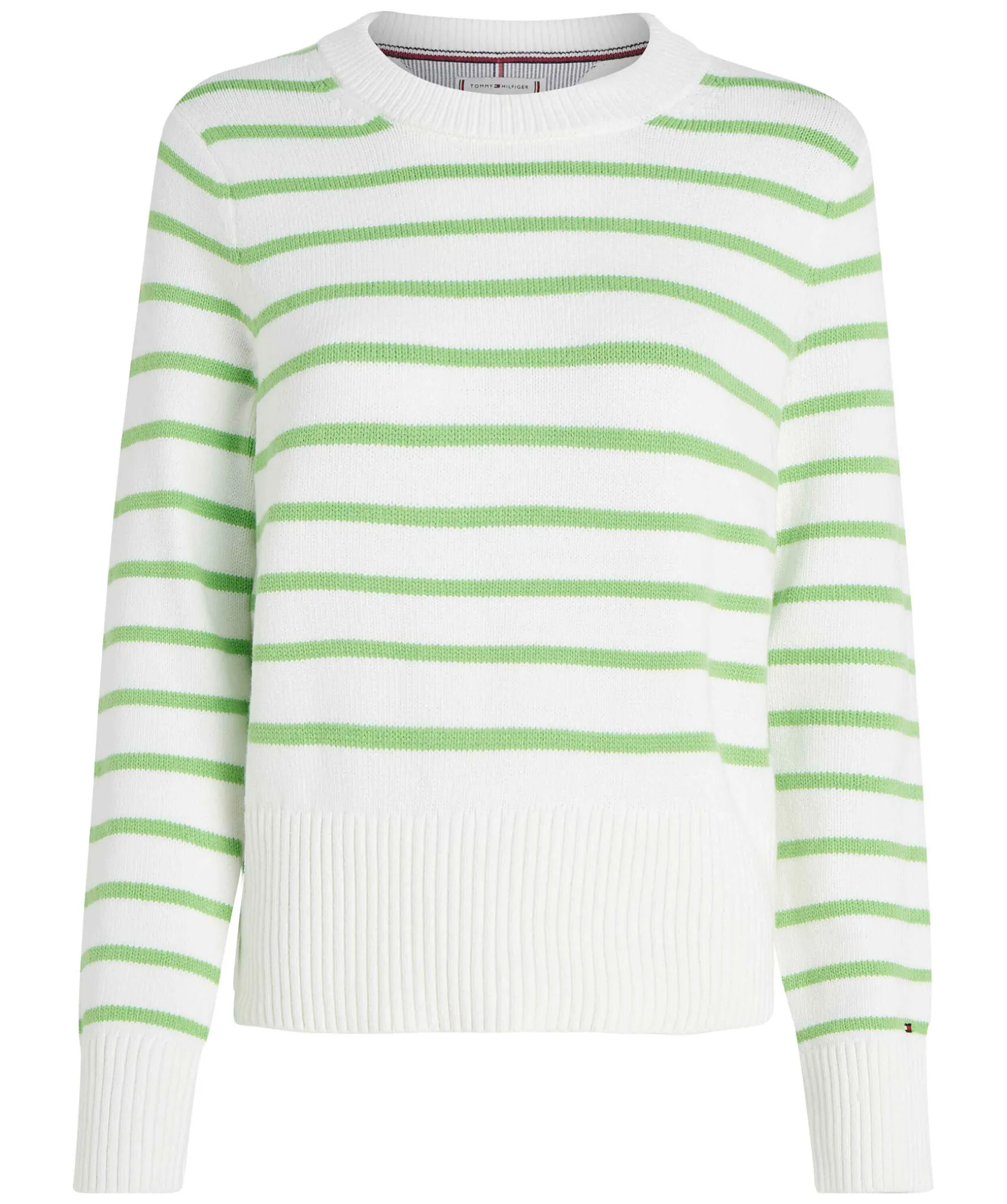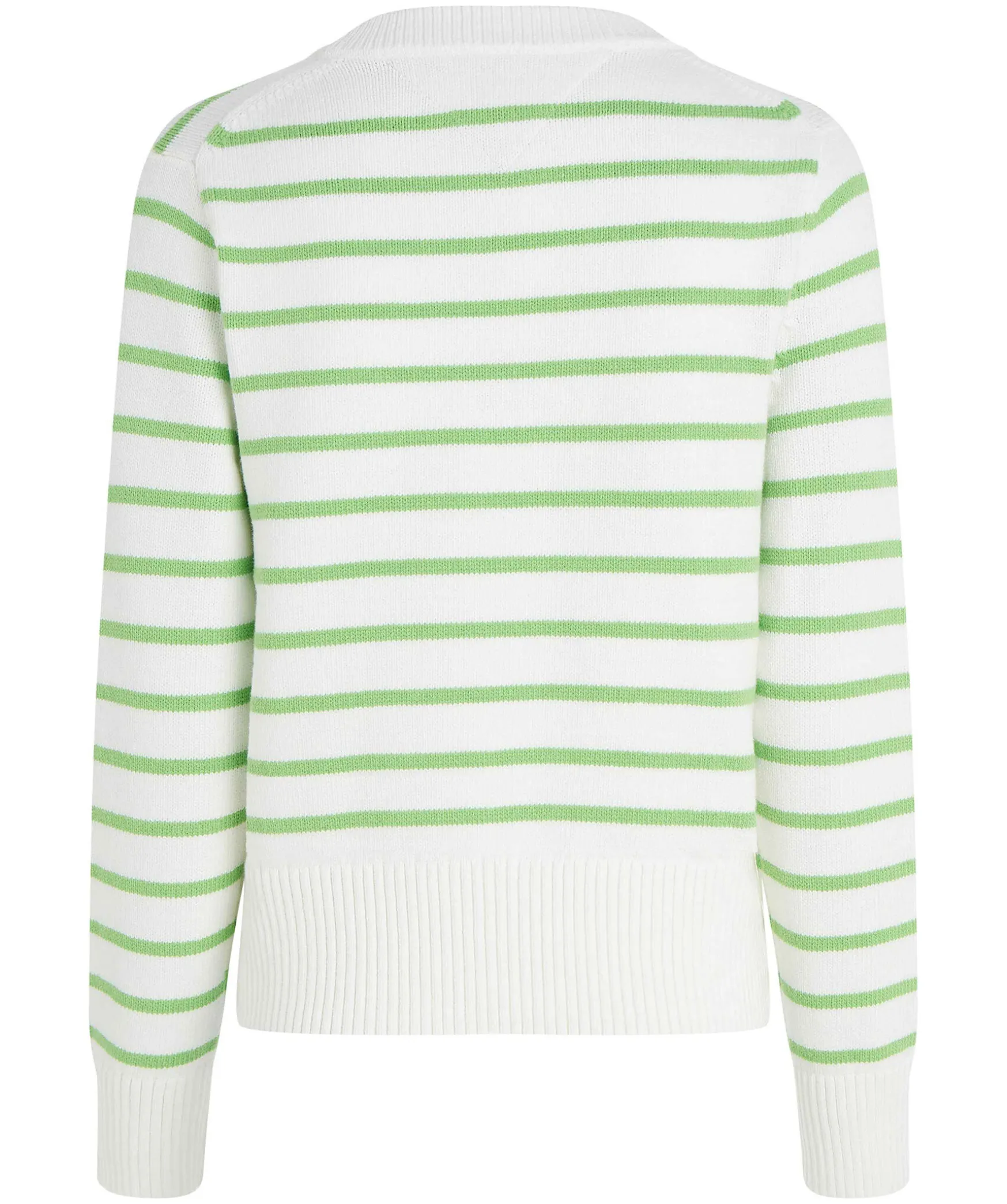 Vit, Stickad Troja Med Grona Rander Fran Tommy Hilfiger. Tillverkad I Ekologisk Bomullsblandning. Rundad Halsringnig Samt Har En Ribbstickad Ringning, Armslut Och Fall. Liten, Tommy Hilfiger Flagga Broderad Vid Mudden Pa Vanster Armslut.