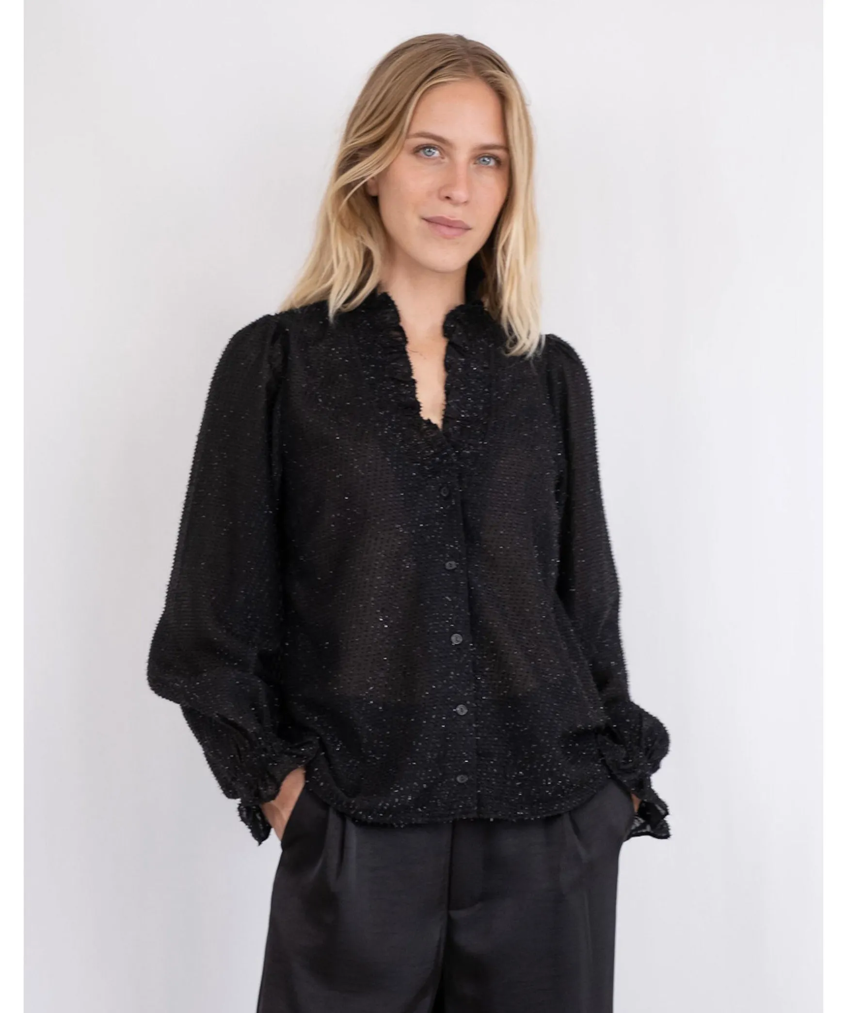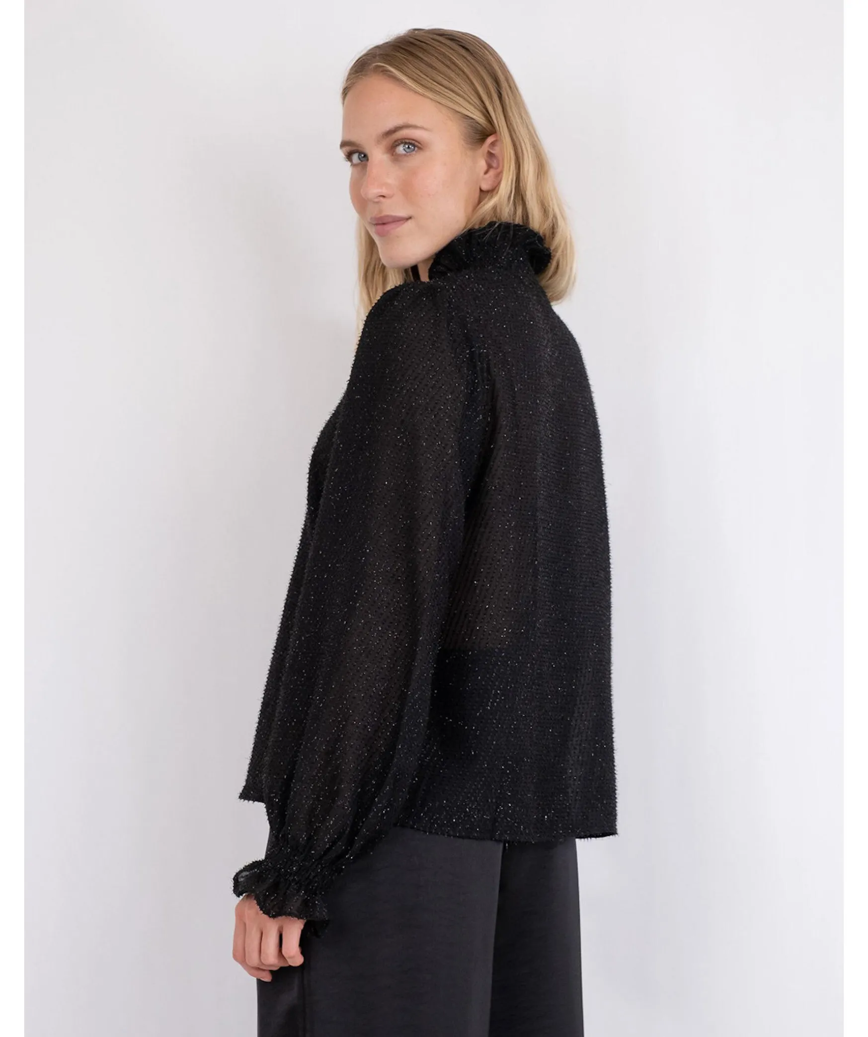 Svart Glittrig Blus Fran Neo Noir. Stangs Framtill Med Knappar. Volangkrage, Volanger Och Resar Vid Armslut. Blusen Har Ett Halvtransparent Tyg.