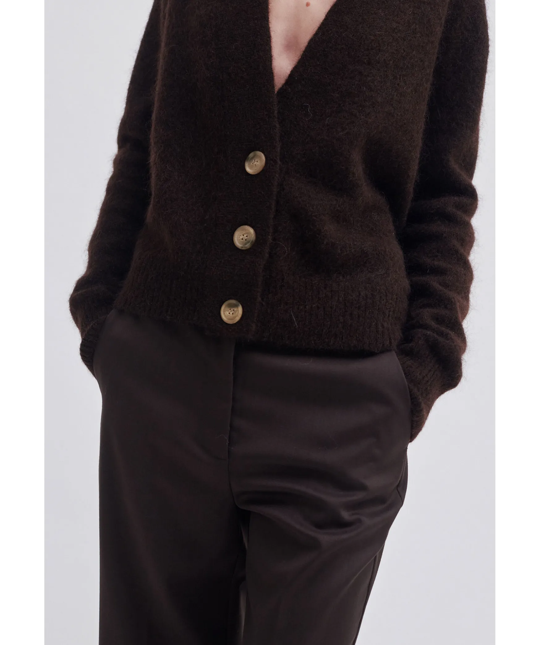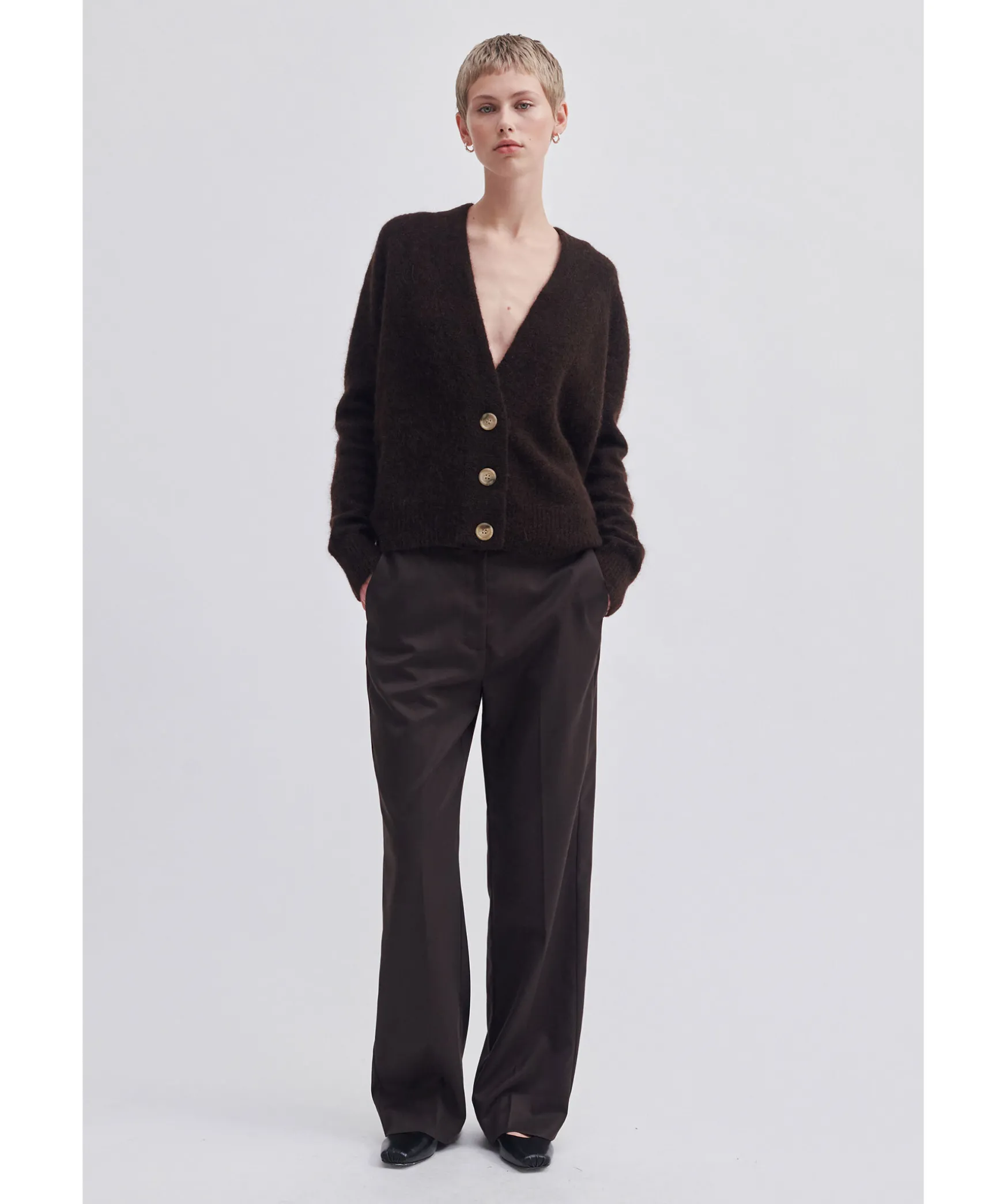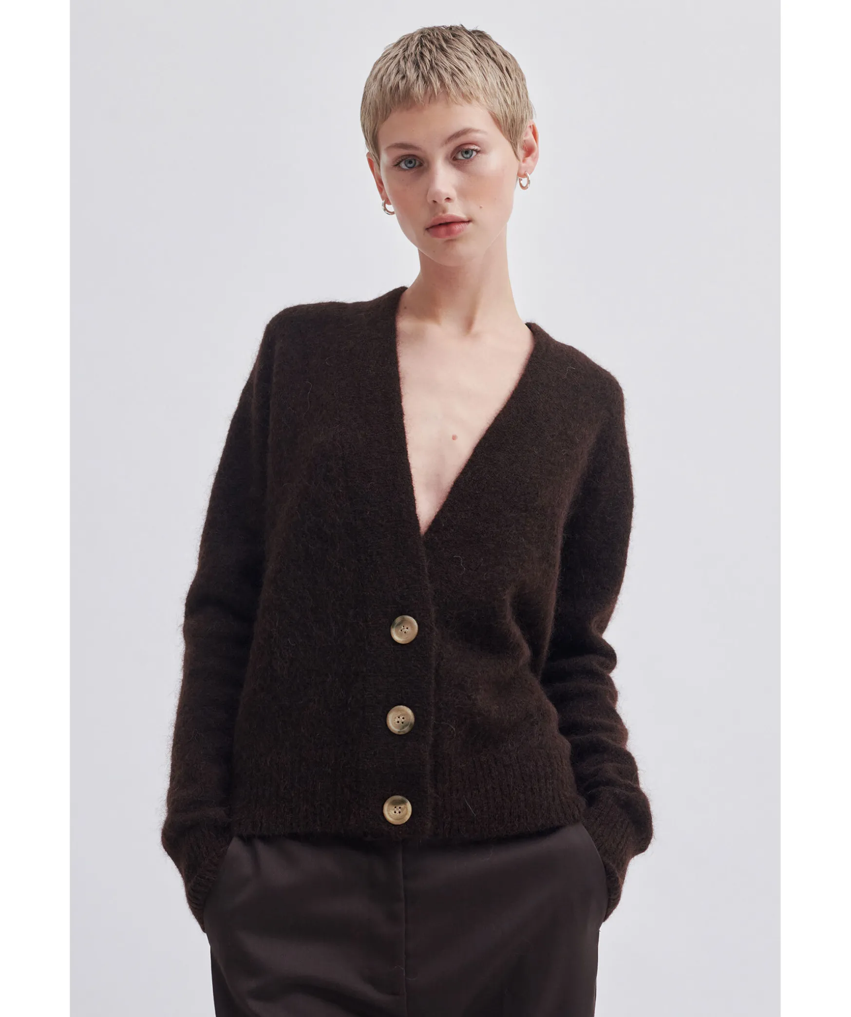 Morkbrun Cardigan Fran Second Female. Koftan Har En Djup V-Ringning Och Stangs Med Tre Knappar Framtill. Ribbstickade Muddar. Gjord I En Mjuk Mohair-Blandning Med En Fluffig Textur. Droppade Axlar Och Har En Oversized Passform.
