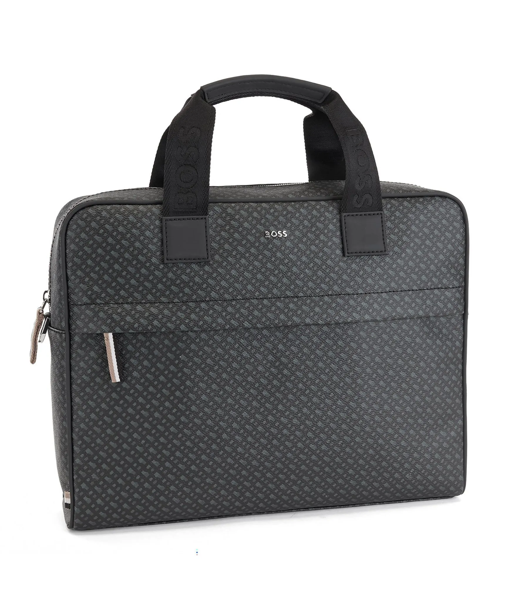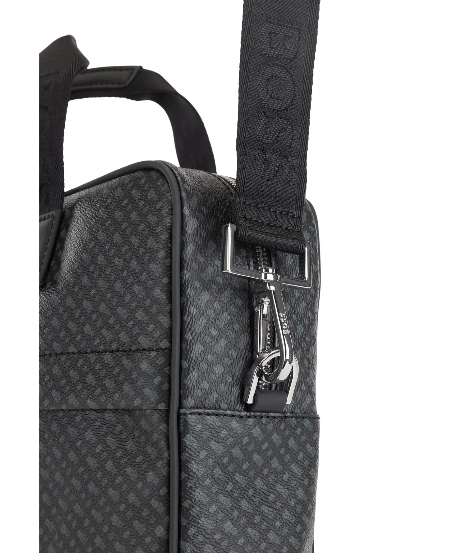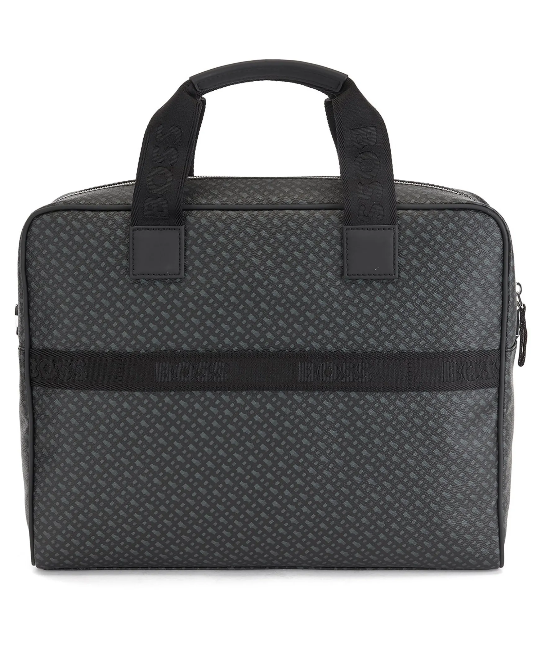 Svart, Monstrad Datorvaska I Laderimitation Fran Boss. Inre Datorficka Och Smart Ficka Pa Baksidan Sa Att Vaskan Enkelt Kan Fastas Pa Ett Rullvaskhandtag. Monogramtryck Och Justerbar, Avtagbar Axelrem Med Boss-Markning. Ficka Med Dragkedja Med Signaturrander Fram Och Liten Silverfargad Logotyp I Metall Fram. Dubbelhandtag Och Stangning Med Dragkedja Upptill. Matt: 30 X 39 X 9 Cm.