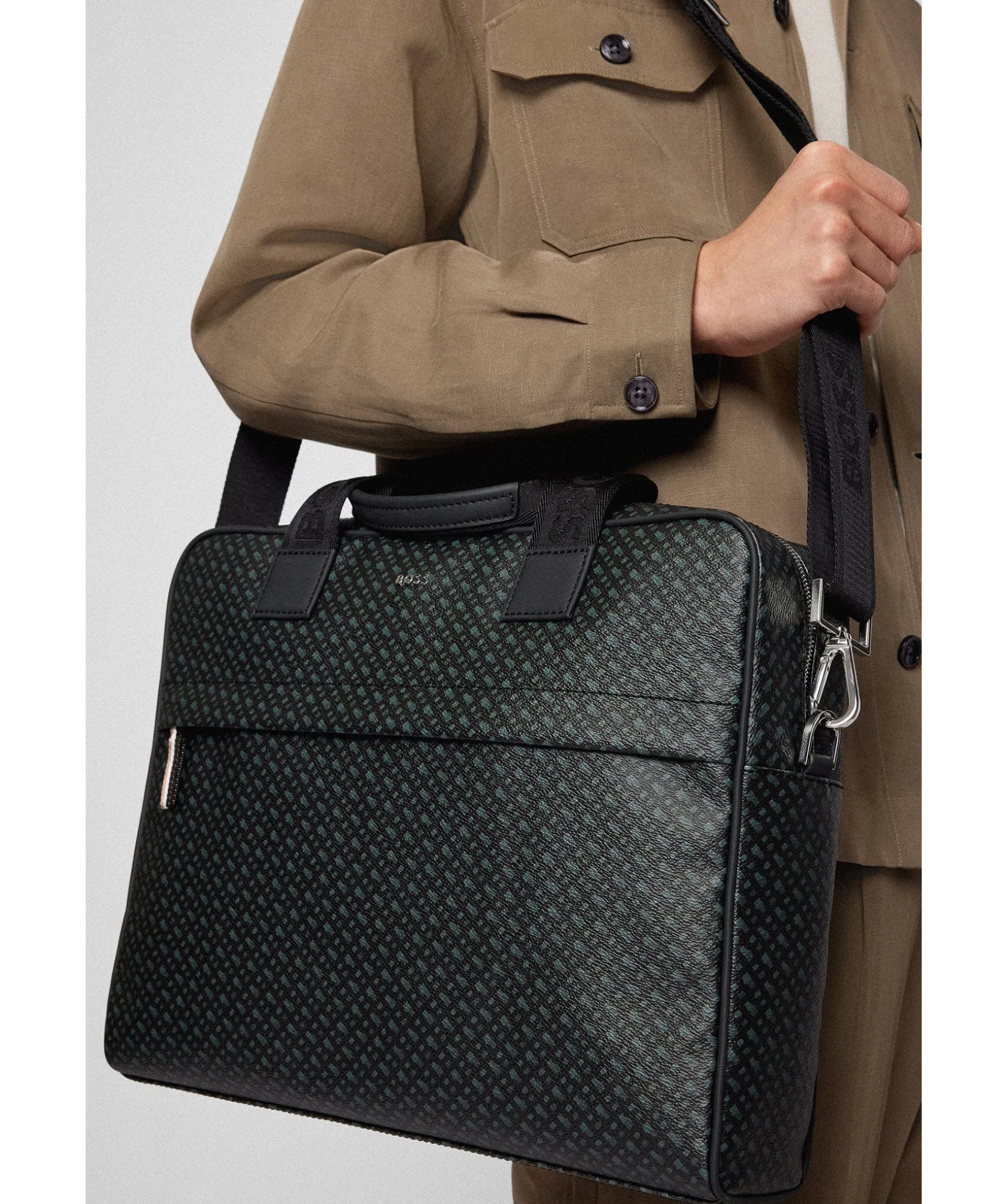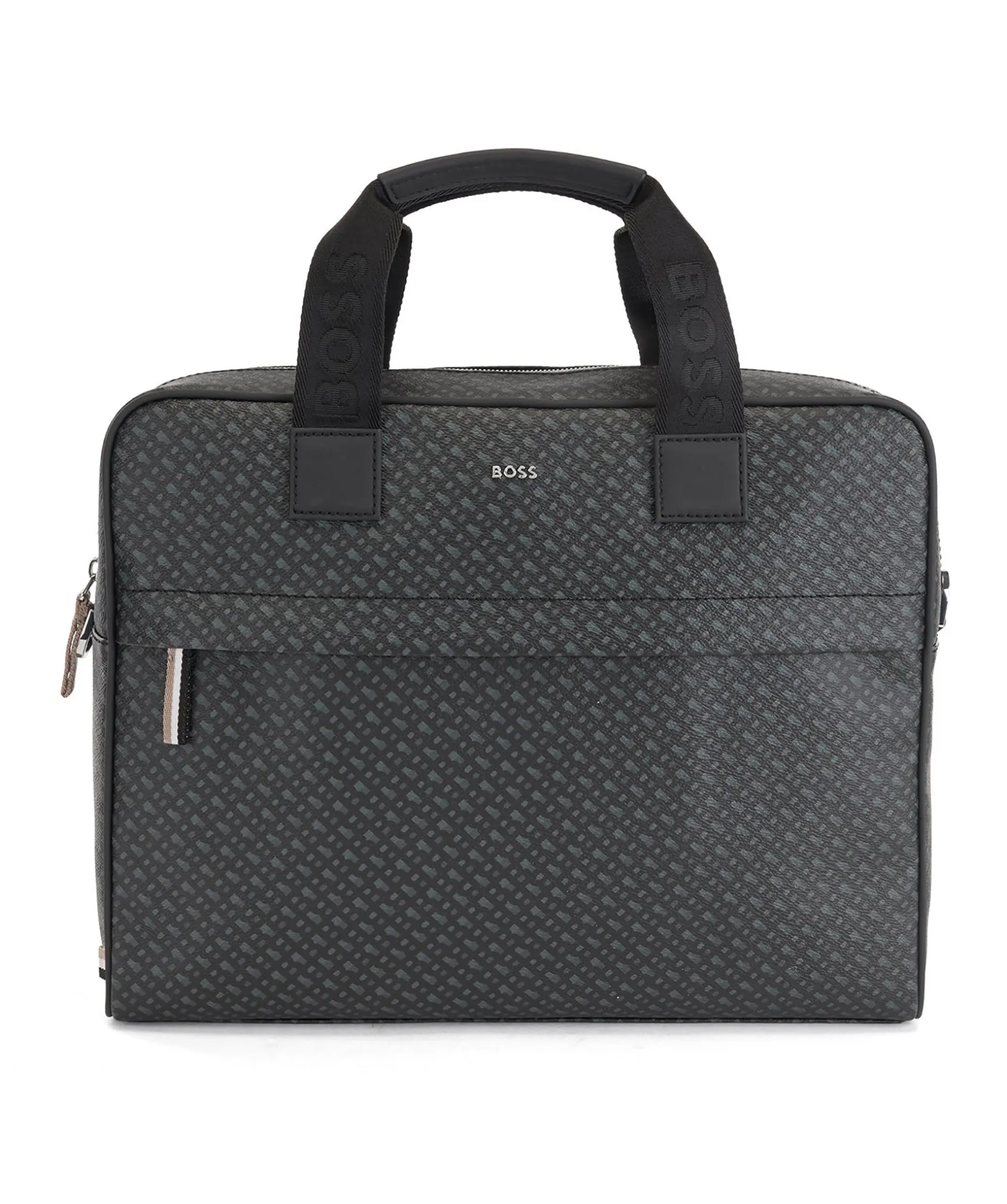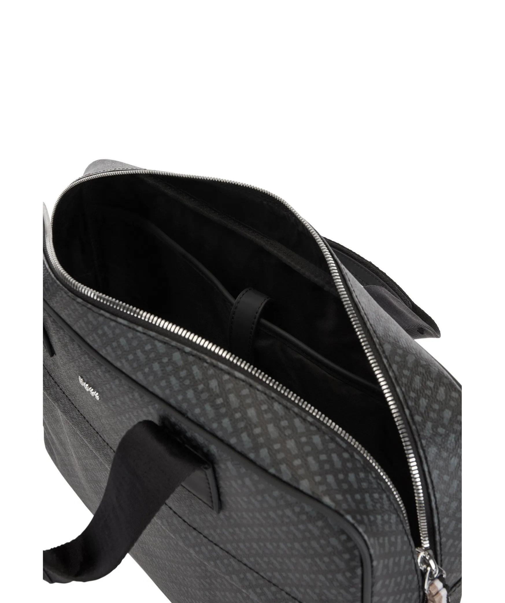 Svart, Monstrad Datorvaska I Laderimitation Fran Boss. Inre Datorficka Och Smart Ficka Pa Baksidan Sa Att Vaskan Enkelt Kan Fastas Pa Ett Rullvaskhandtag. Monogramtryck Och Justerbar, Avtagbar Axelrem Med Boss-Markning. Ficka Med Dragkedja Med Signaturrander Fram Och Liten Silverfargad Logotyp I Metall Fram. Dubbelhandtag Och Stangning Med Dragkedja Upptill. Matt: 30 X 39 X 9 Cm.
