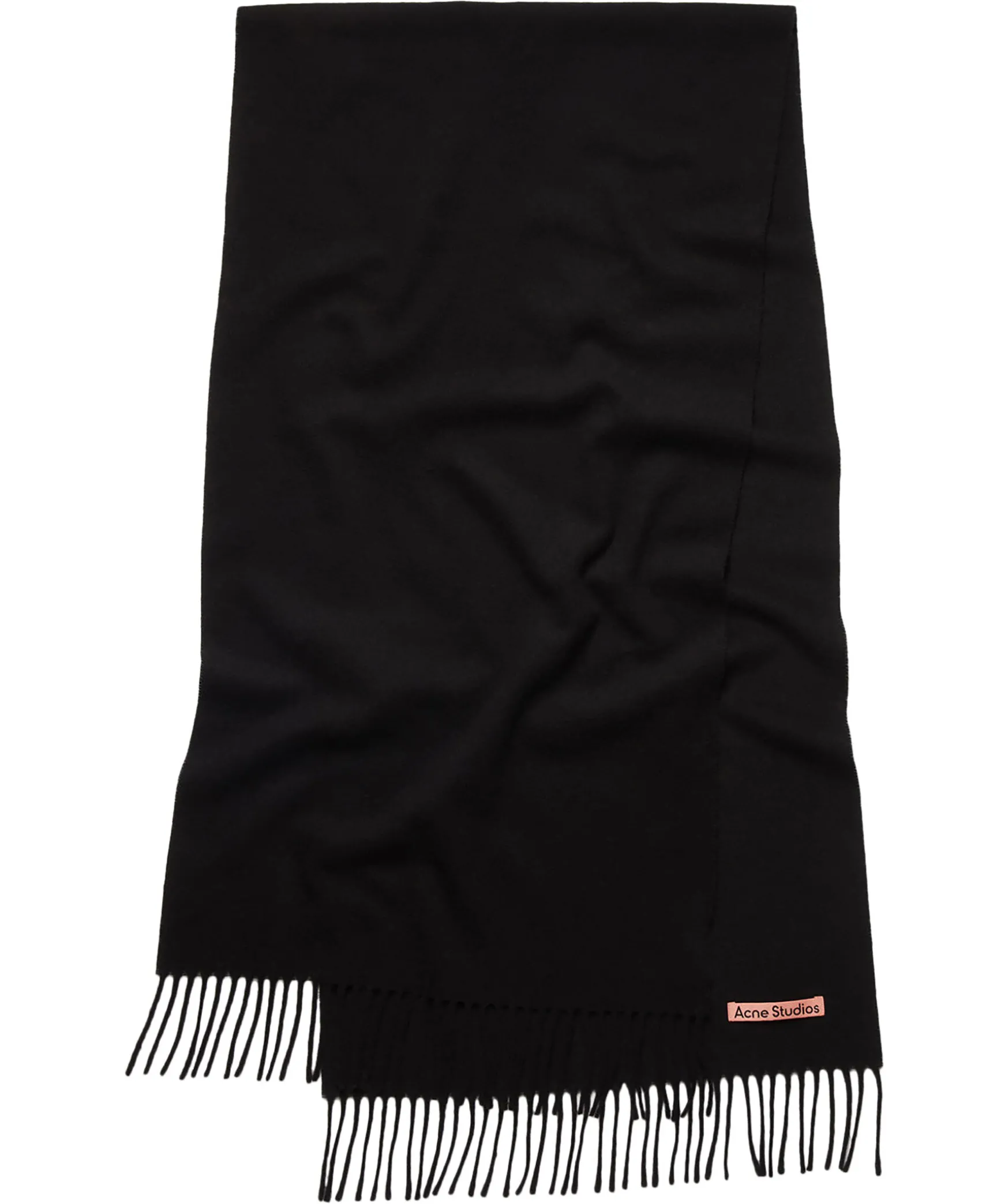 Svart Halsduk Fran Acne Studios. Tillverkad I 100% Ull. Kanter Med Fransar. Rosa Patch Med Logotyp. Halsduken Ar 70Cm Bred Och 200Cm Lang.