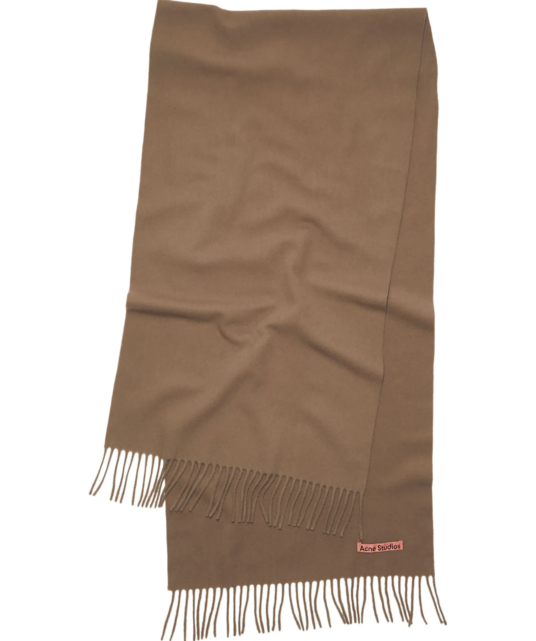 Brun Halsduk Fran Acne Studios. Tillverkad I 100% Ull. Kanter Med Fransar. Rosa Patch Med Logotyp. Halsduken Ar 70Cm Bred Och 200Cm Lang.
