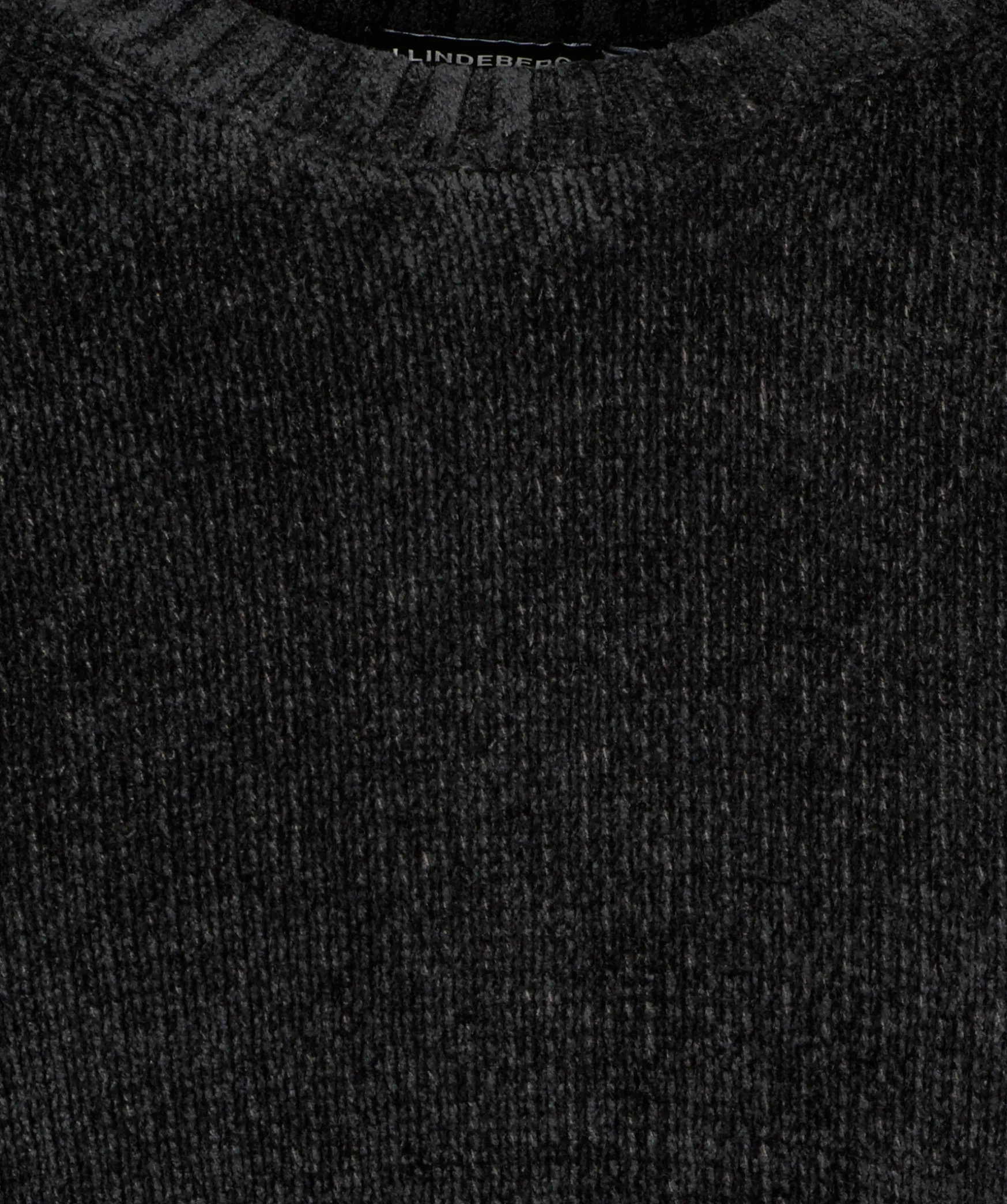 Svart Ratstickad Troja I Sammetsliknande Material Fran J Lindeberg. Rundad Halsringning. Ribbstickad Mudd Vid Krage, Arm- Och Plaggslut. Tillverkad I Bomullsblandning.
