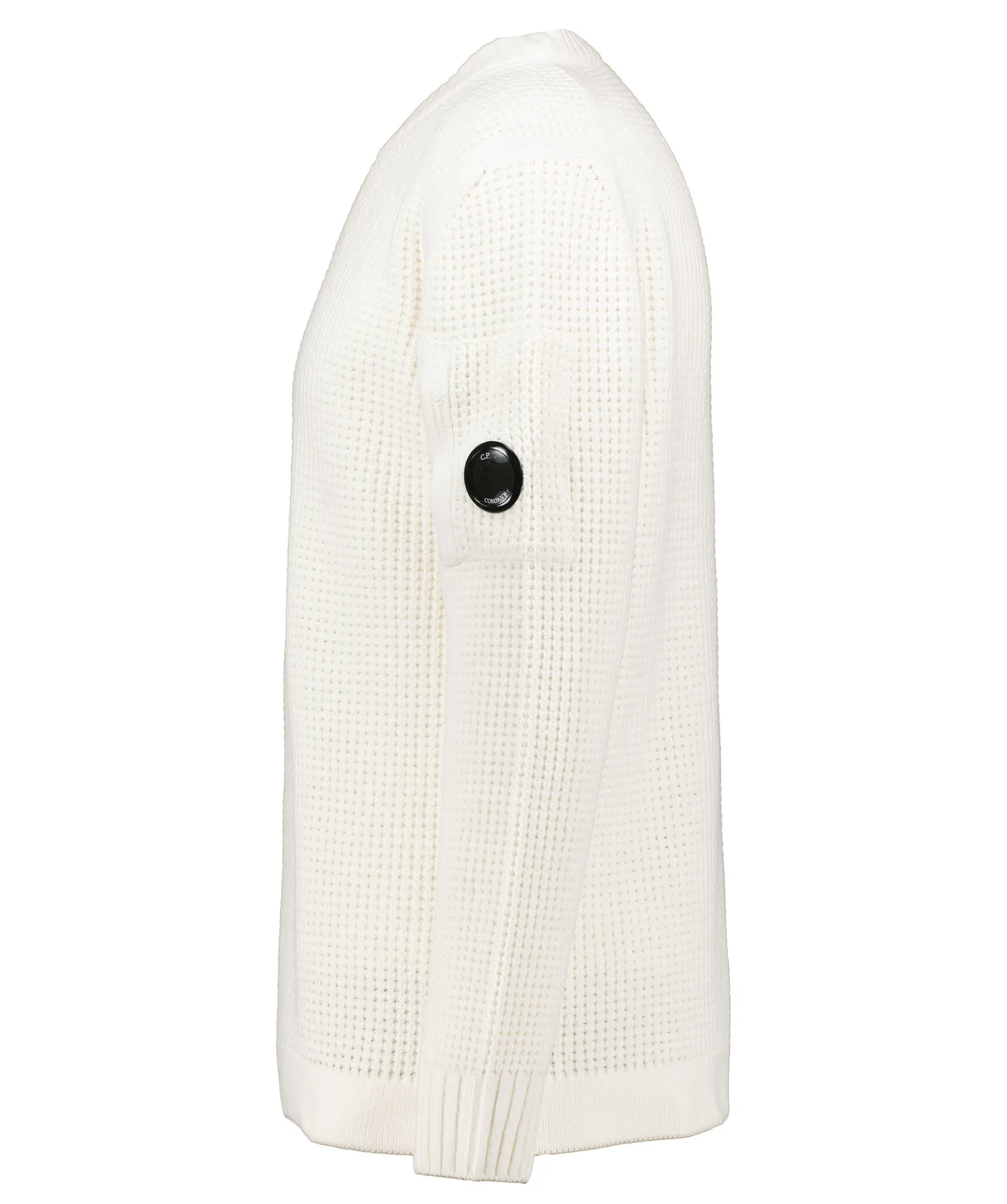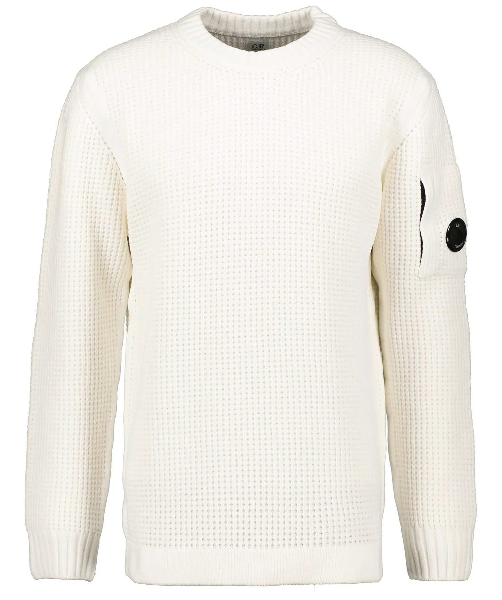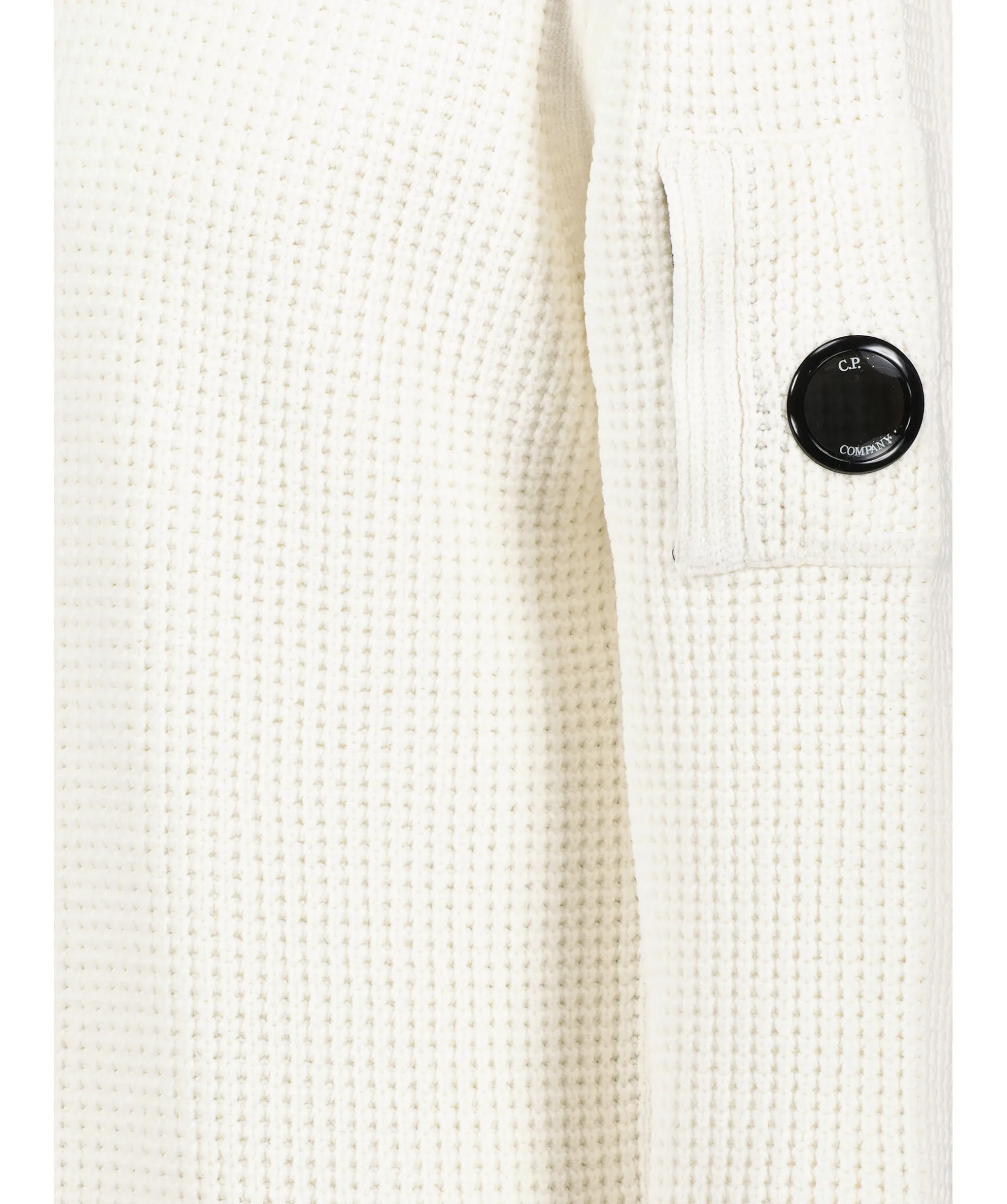 Vit Stickad Sweatshirt Fran C.P Company. Gjord I 100% Mjukt Bomulls Chenille-Garn. Ficka Med Dragkedja Och Logotyp Pa Vanster Overarm. Ribbade Muddar.