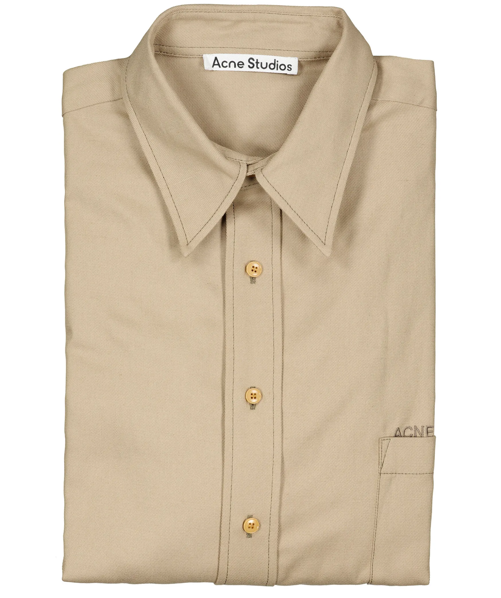 Beige Skjorta Fran Acne Studios. Brostficka Pa Vanster Sida Med Broderad Logotyp. Spetsig Krage. Manschetter. Tillverkad I Bomull Och Linne Blandning. Kontrast Sommar I Gratt.