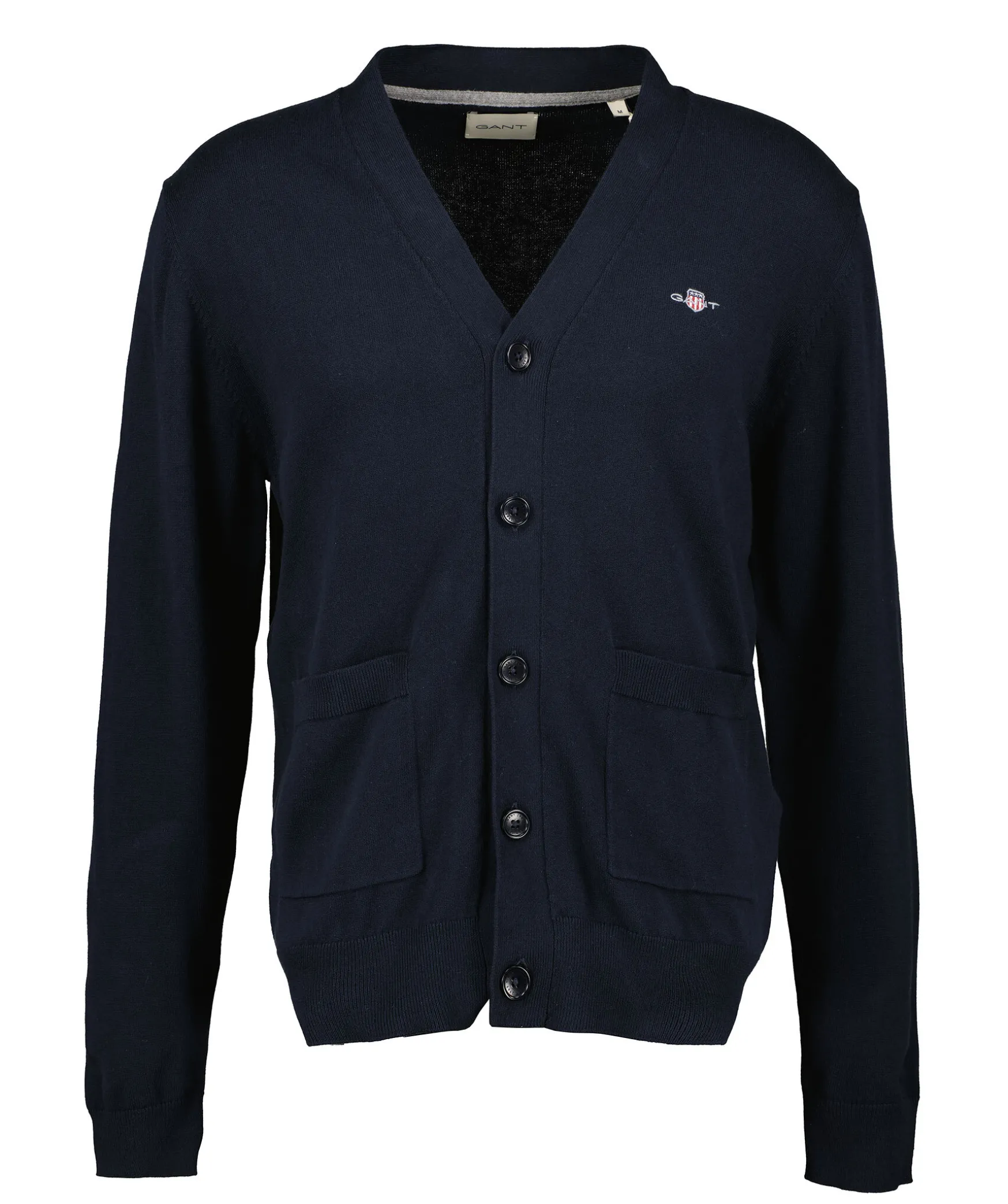 Marinbla, Klassisk Och Mangsidig Cardigan I Bomull Med V-Ringning Och Normal Passform Fran Gant. Den Har Detaljer Som Ribbstickade Muddar, Corozoknappar Med Logotyp, Tva Fickor Och En Liten Gant-Skold Broderad Pa Brostet. Bar Over En Skjorta Med Valskurna Byxor Och En Elegant Sko For En Tidlos Stil.