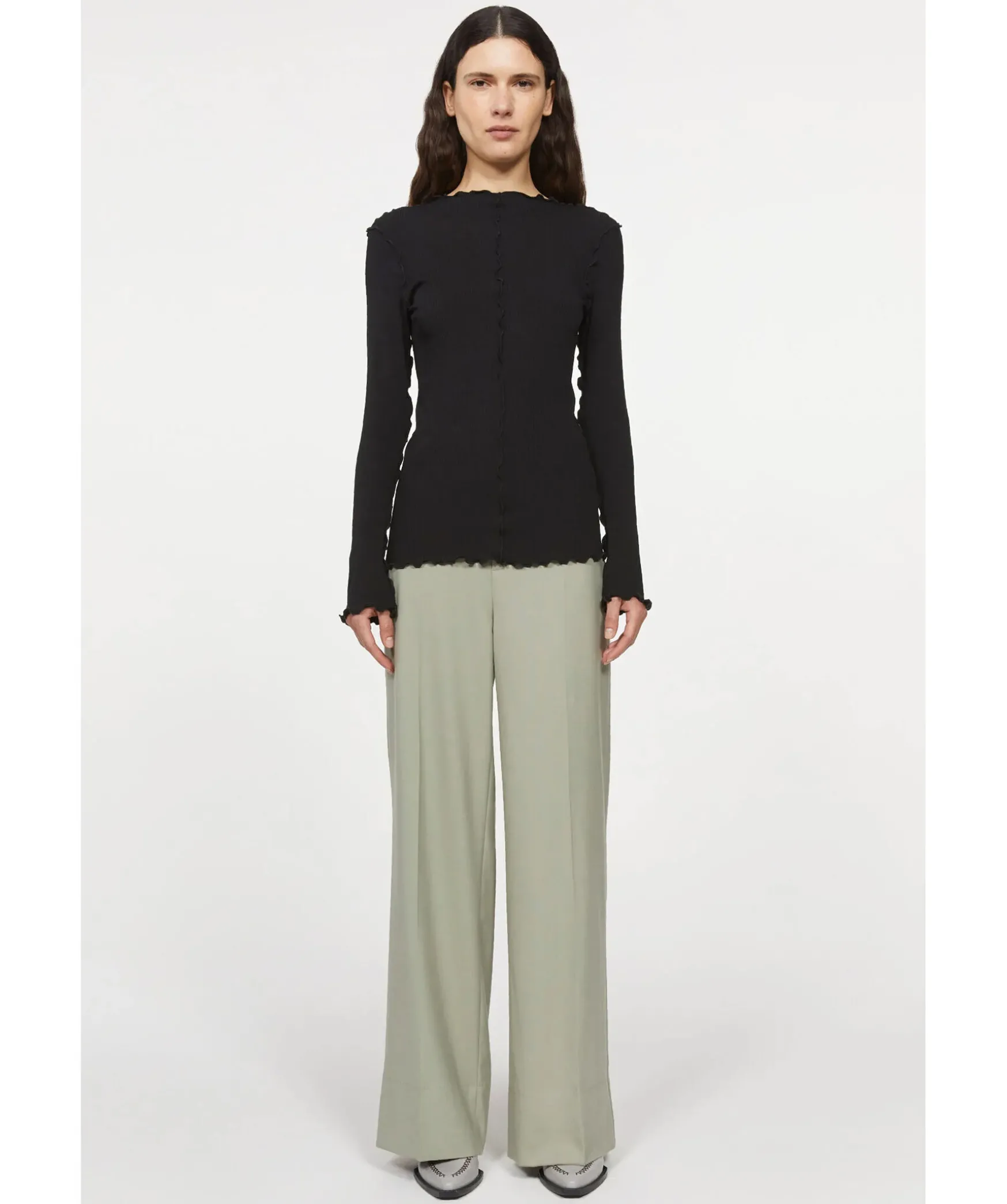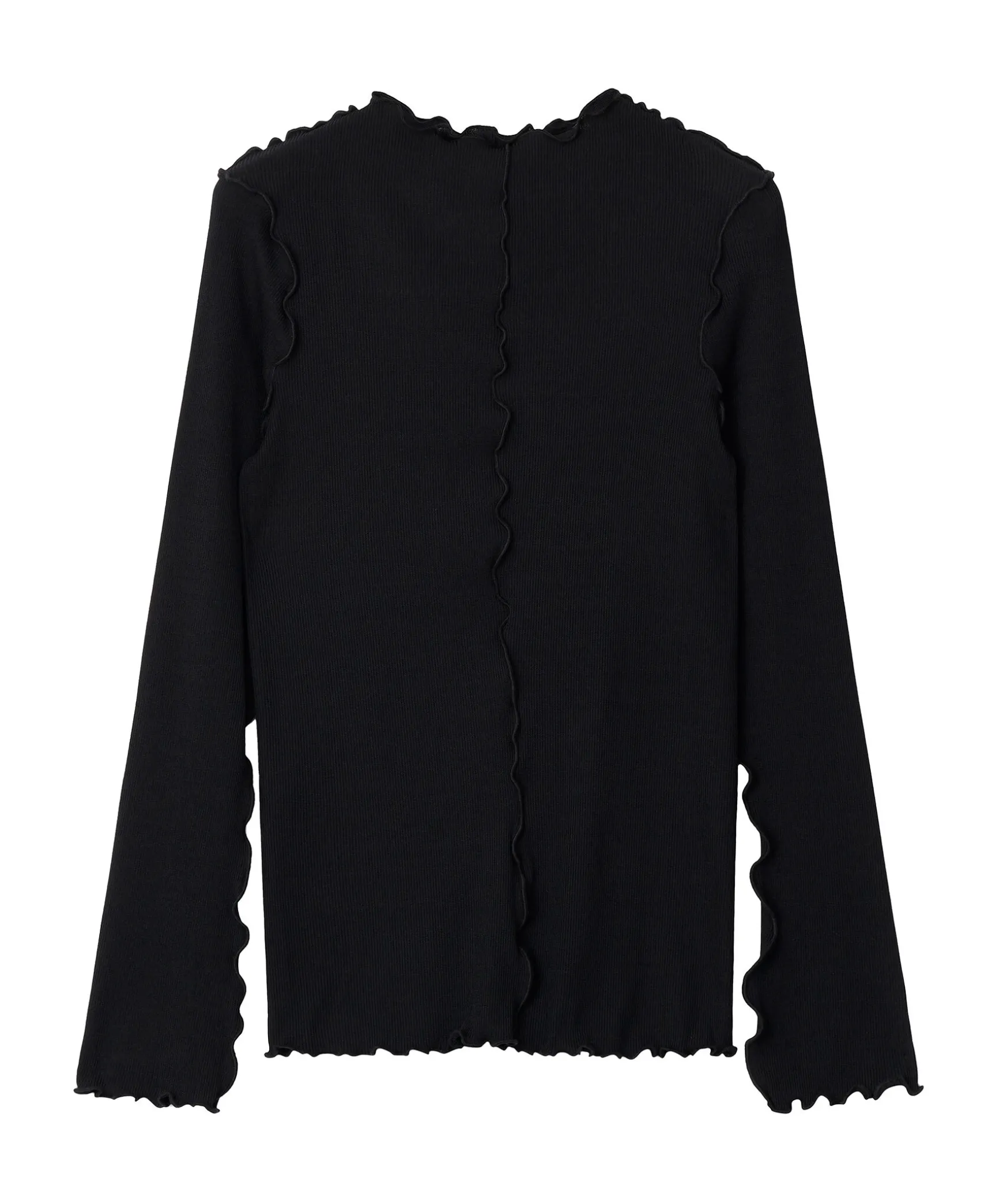 Svart Topp Fran Rodebjer Sydd I En Figursydd Passform. Kontrastsommar Med Volang Runt Om Plagget. Nagot Langre Armar. Modellen Ar 176Cm Lang Och Har Pa Sig Storlek S.