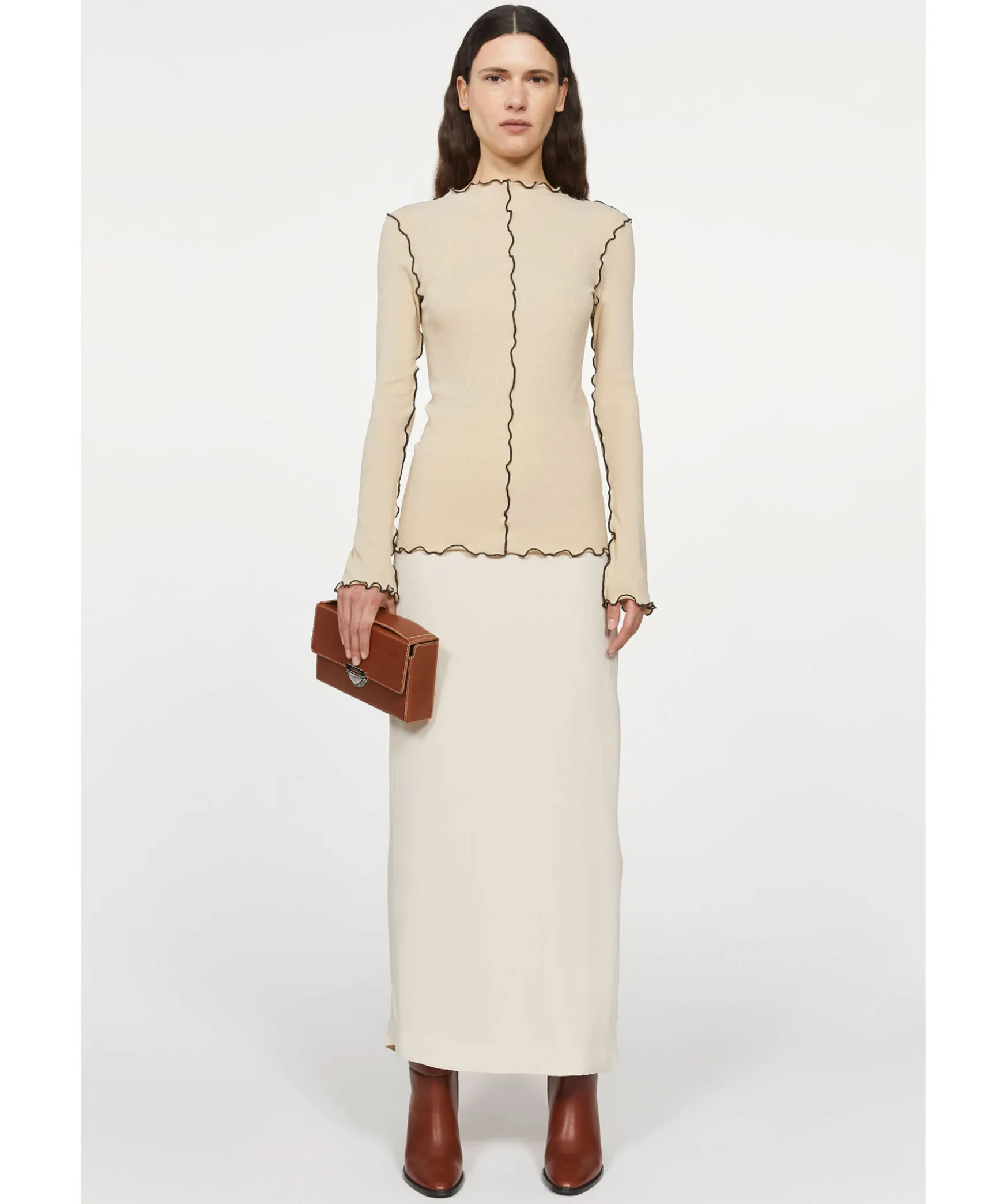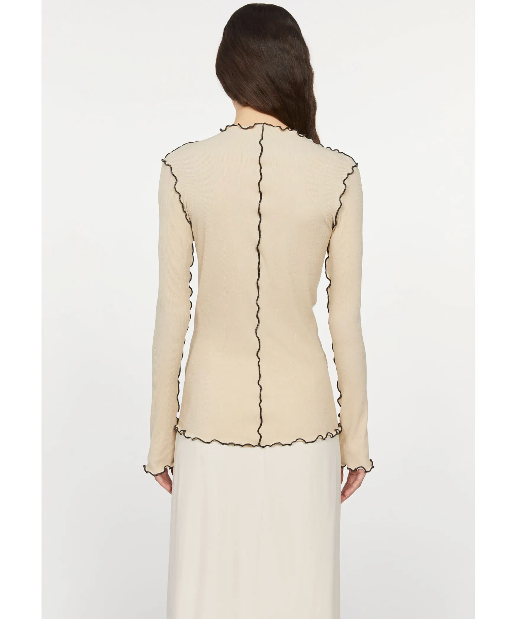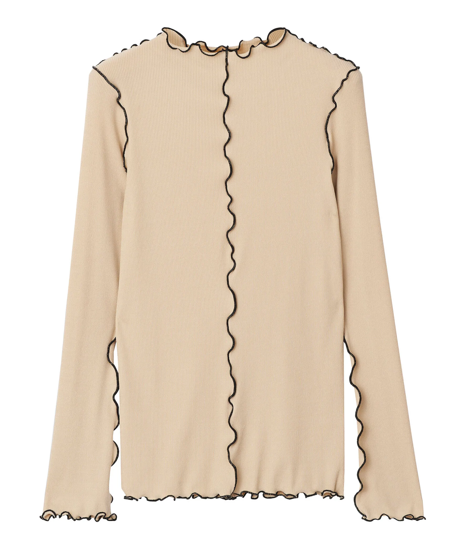 Beige Topp Fran Rodebjer Sydd I En Figursydd Passform. Svarta Kontrastsommar Med Volang Runt Om Plagget. Nagot Langre Armar. Modellen Ar 176Cm Lang Och Har Pa Sig Storlek S.