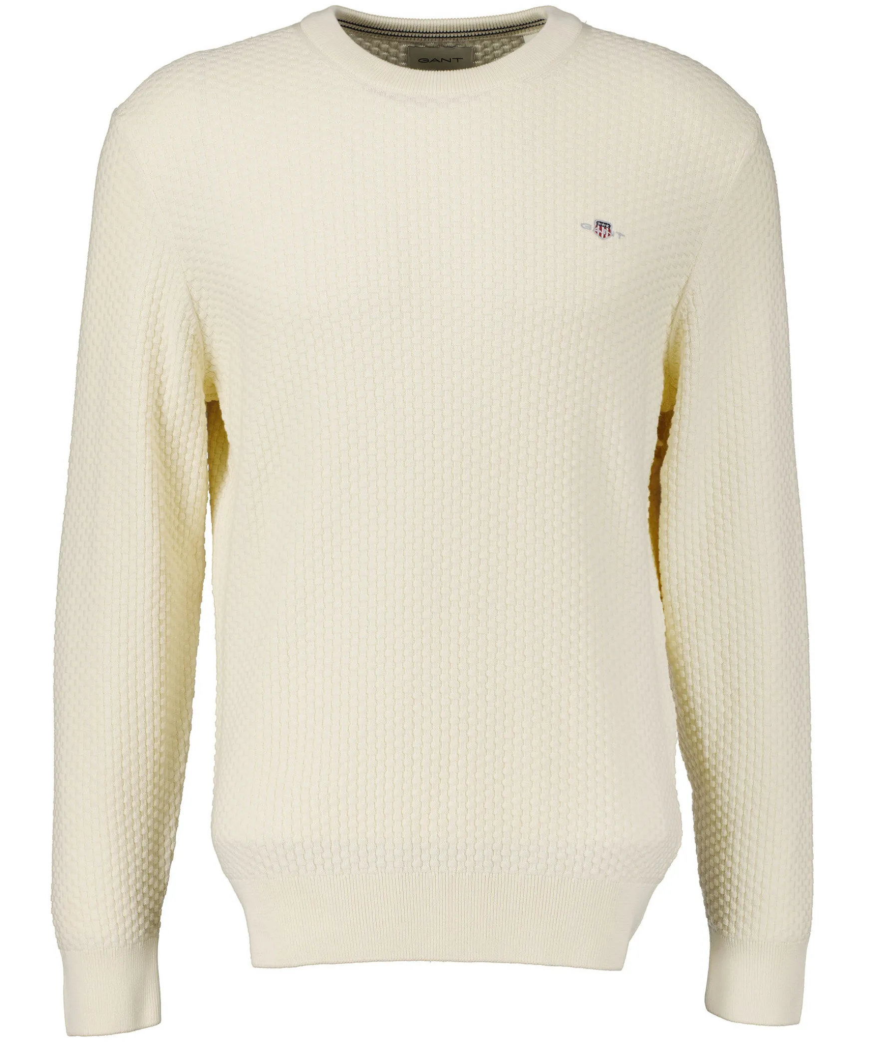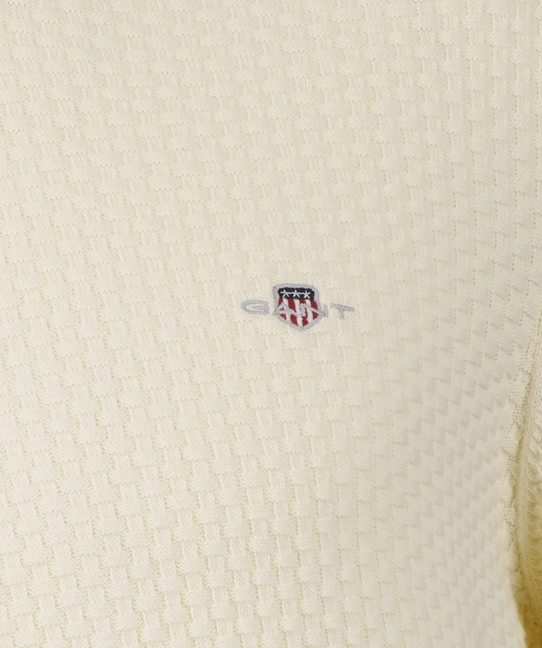 Kramvit Strukturstickad Troja Fran Gant. Rundad Halsringning. Ribbstickad Mudd Vid Kragen, Arm- Och Plaggslut. Tillverkad I 100% Bomull. Broderad Logotyp Pa Vanster Brost.