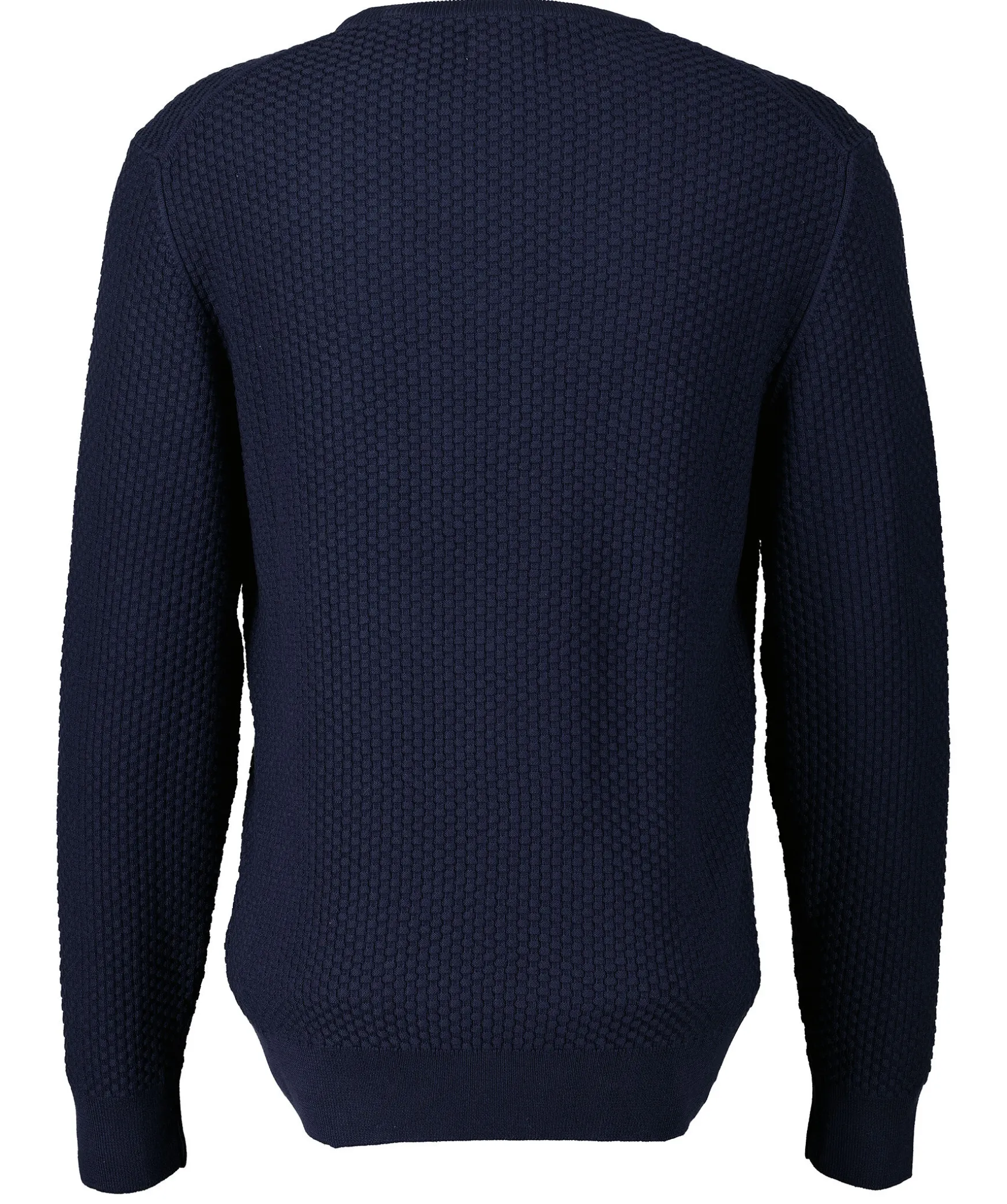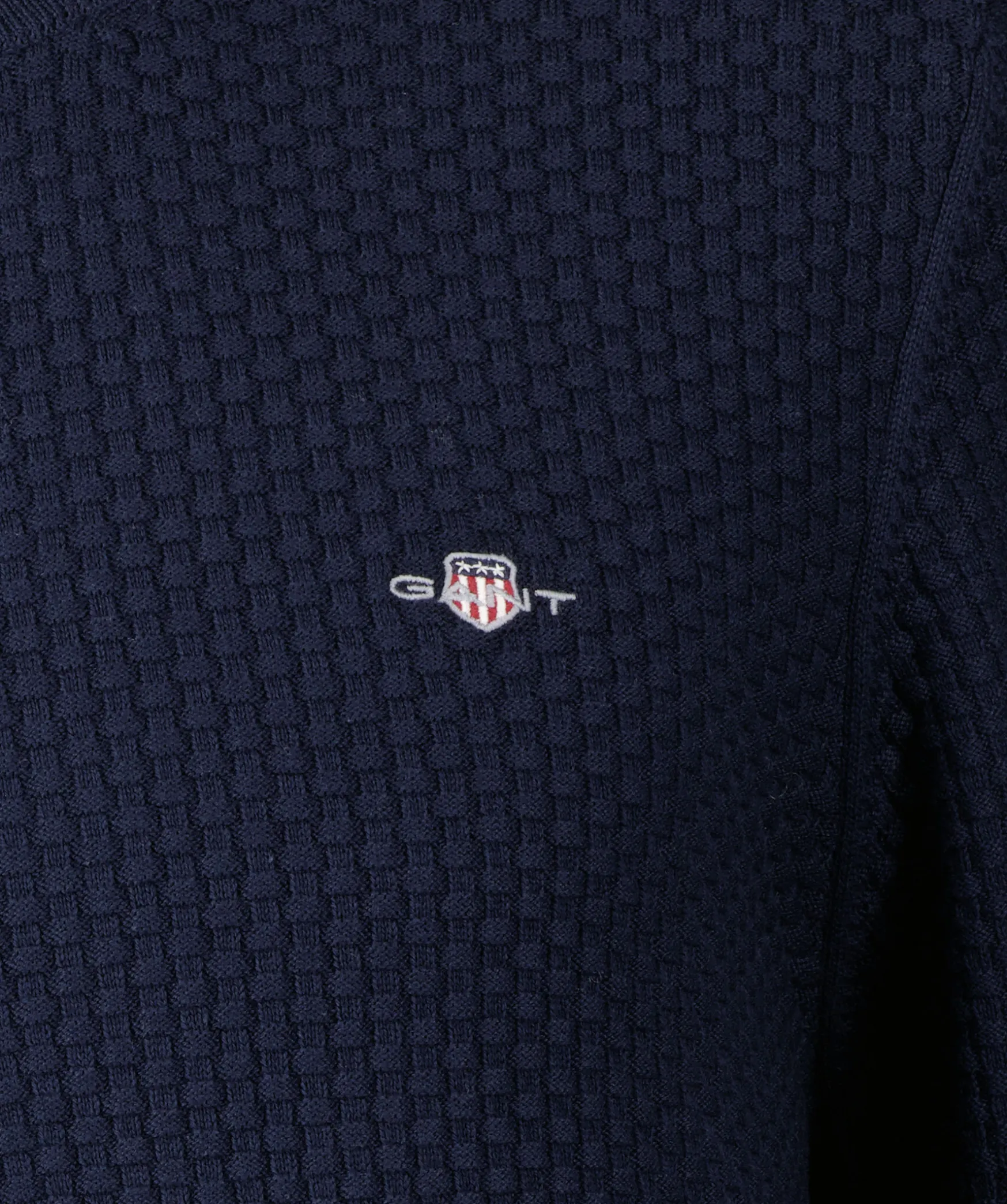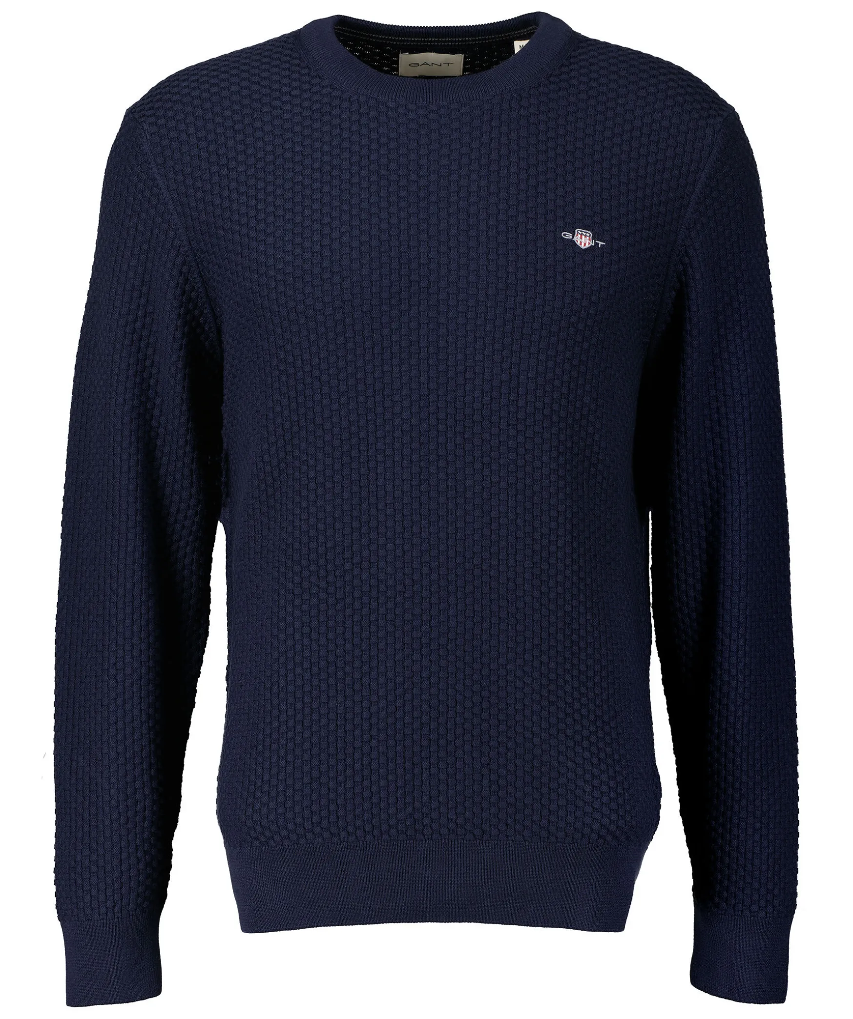 Morkbla Strukturstickad Troja Fran Gant. Rundad Halsringning. Ribbstickad Mudd Vid Kragen, Arm- Och Plaggslut. Tillverkad I 100% Bomull. Broderad Logotyp Pa Vanster Brost.