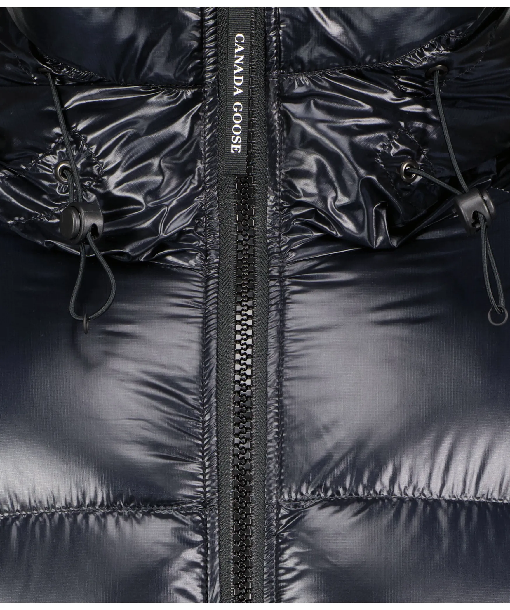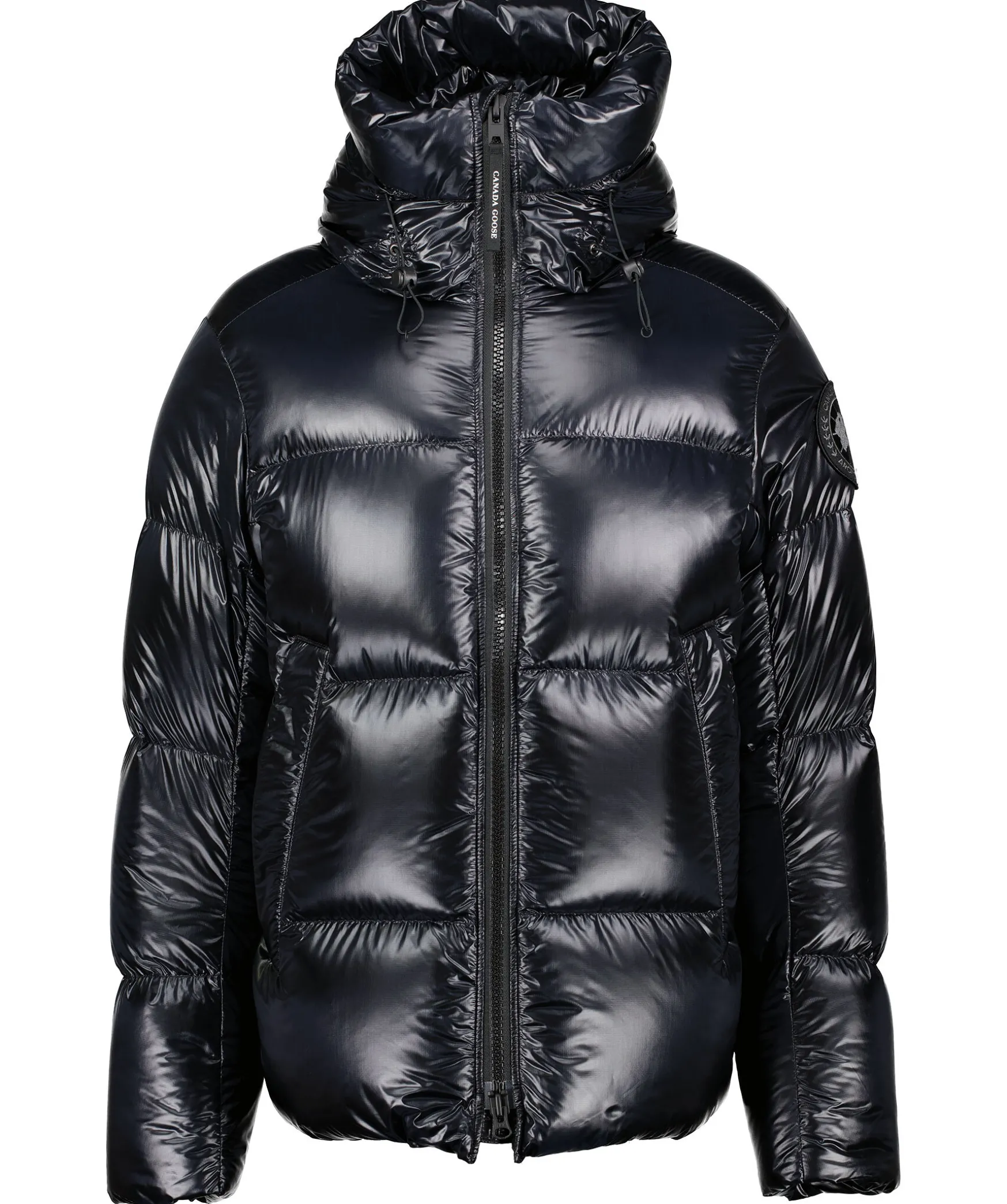Svart, Semi Glansig Dunjacka I Puffermodellfran Canada Goose. Jackan Stangs Med En Tvavagsdragkedja Och Har Elastiska Band Pa Insidan Som Man Kan Satta Over Axlarna Och Lata Jackan Hanga Fritt Om Man Vill Ha Den Oppen. Tva Stora Framfickor Med Fleecefoder. Hog Krage Och Luva Med Dragsko. Svart Broderad Tygpatch Med Logotyp Pa Vanster Arm.