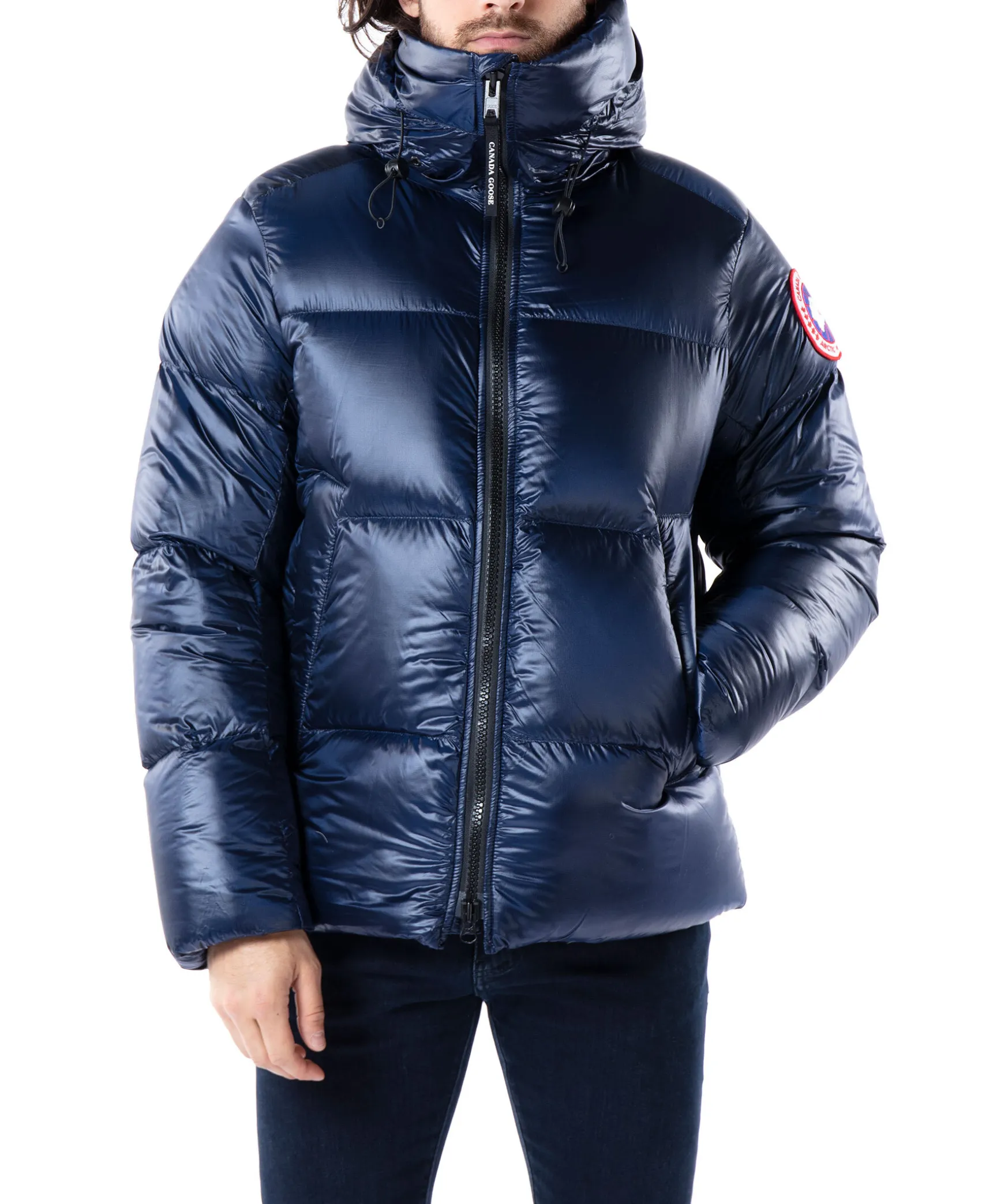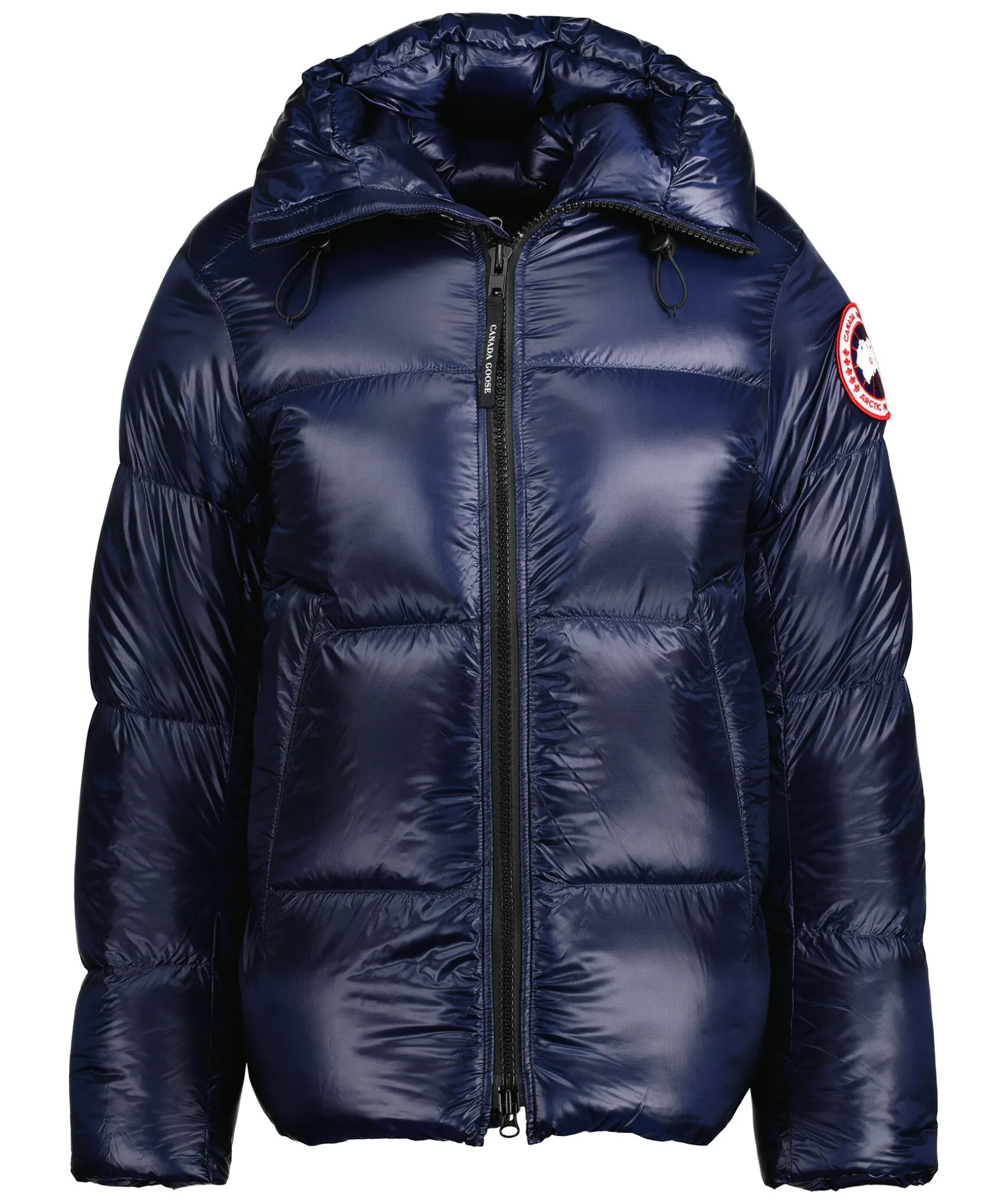Morkbla Dunpuffer Fran Canada Goose. Tre Stora Innerfickor. Hog Krage Och Luva Med Dragsko. Jackan Stangs Med En Tvavagsdragkedja Och Har Elastiska Band Pa Insidan Som Man Kan Satta Over Axlarna Och Lata Jackan Hanga Fritt Om Man Vill Ha Den Oppen. Klassisk Canada Goose Logga Pa Vanster Arm. Modellen Ar 185Cm Lang Och Har Pa Sig Storlek M.