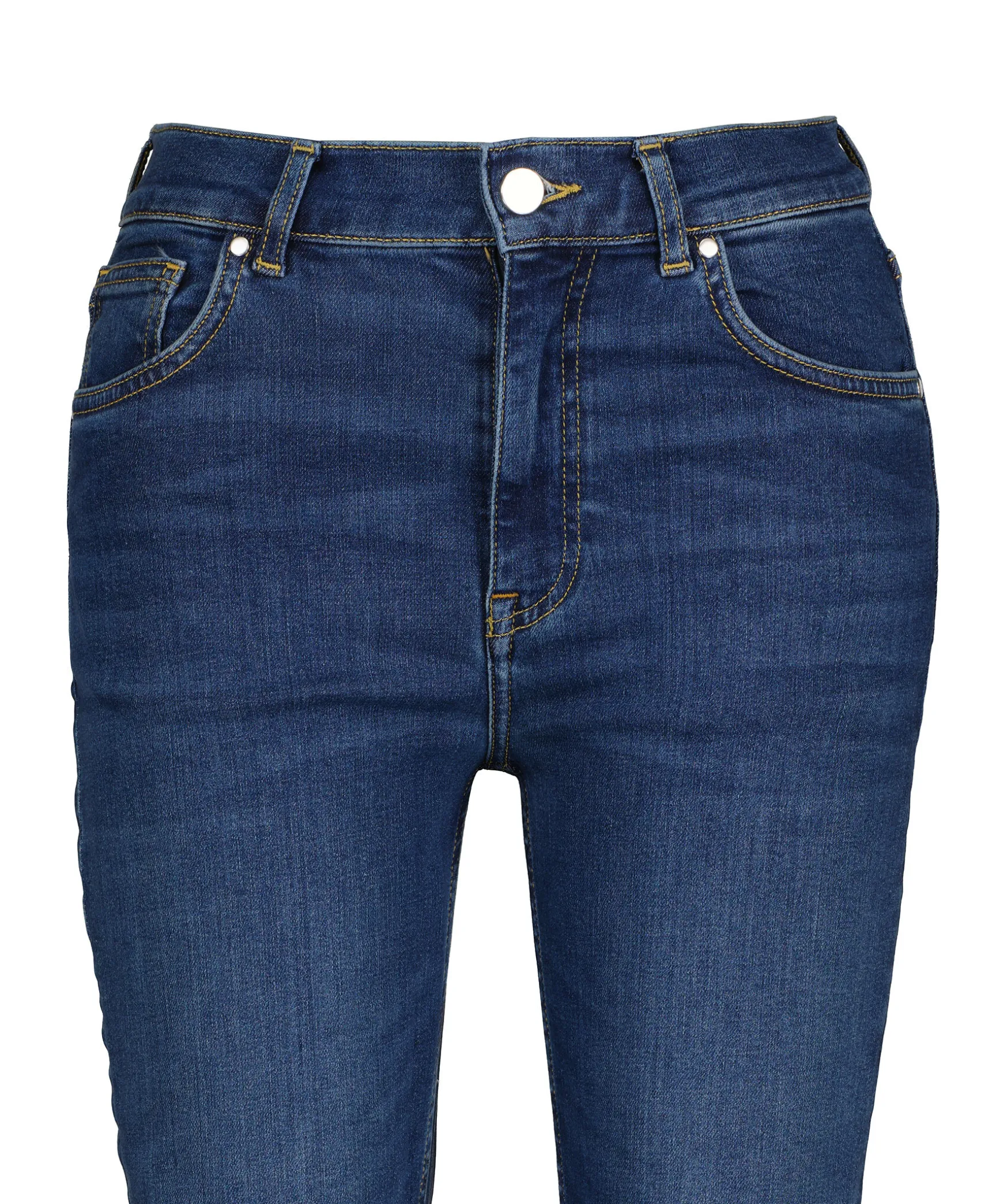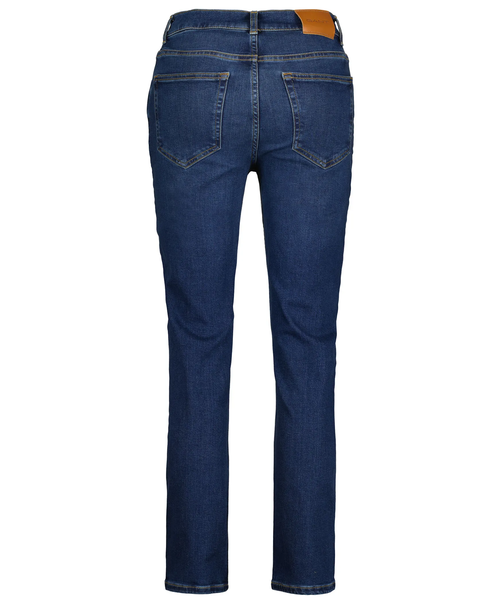Jeans I Mork Indigobla Till Mellanbla Indigo Fran Gant. Byxorna Har Vintagenyanser Och Uttrycksfulla Detaljer, Hog Midja, Smal Passform Och Nagot Kortare Ben. Fem Fickor. De Innehaller Mycket Stretch Sa Att De Behaller Sin Form Och Sitter Skont, Passar Bra Bade Pa Kontoret Och En Ledig Dag Pa Stan.