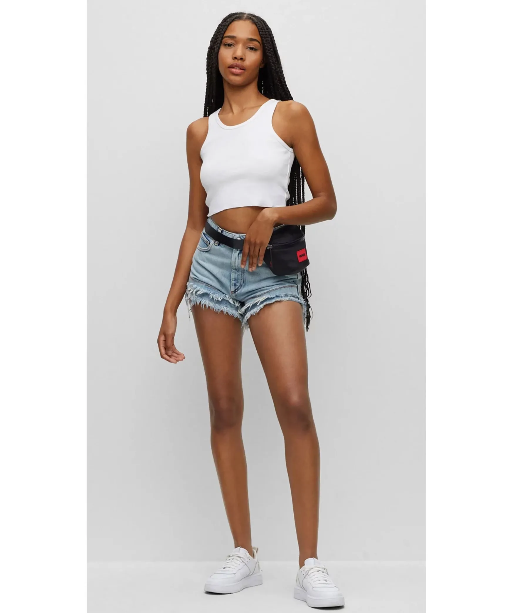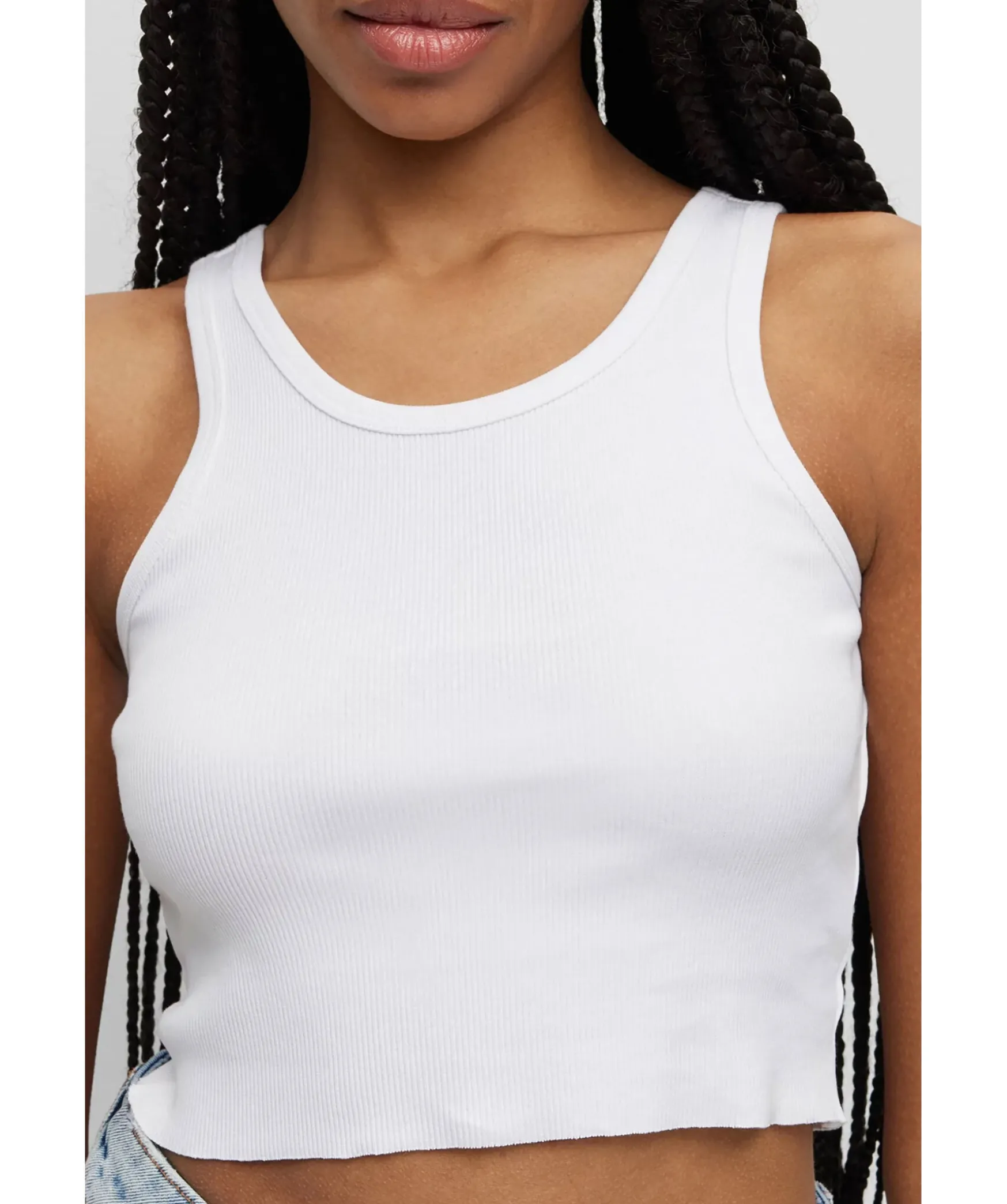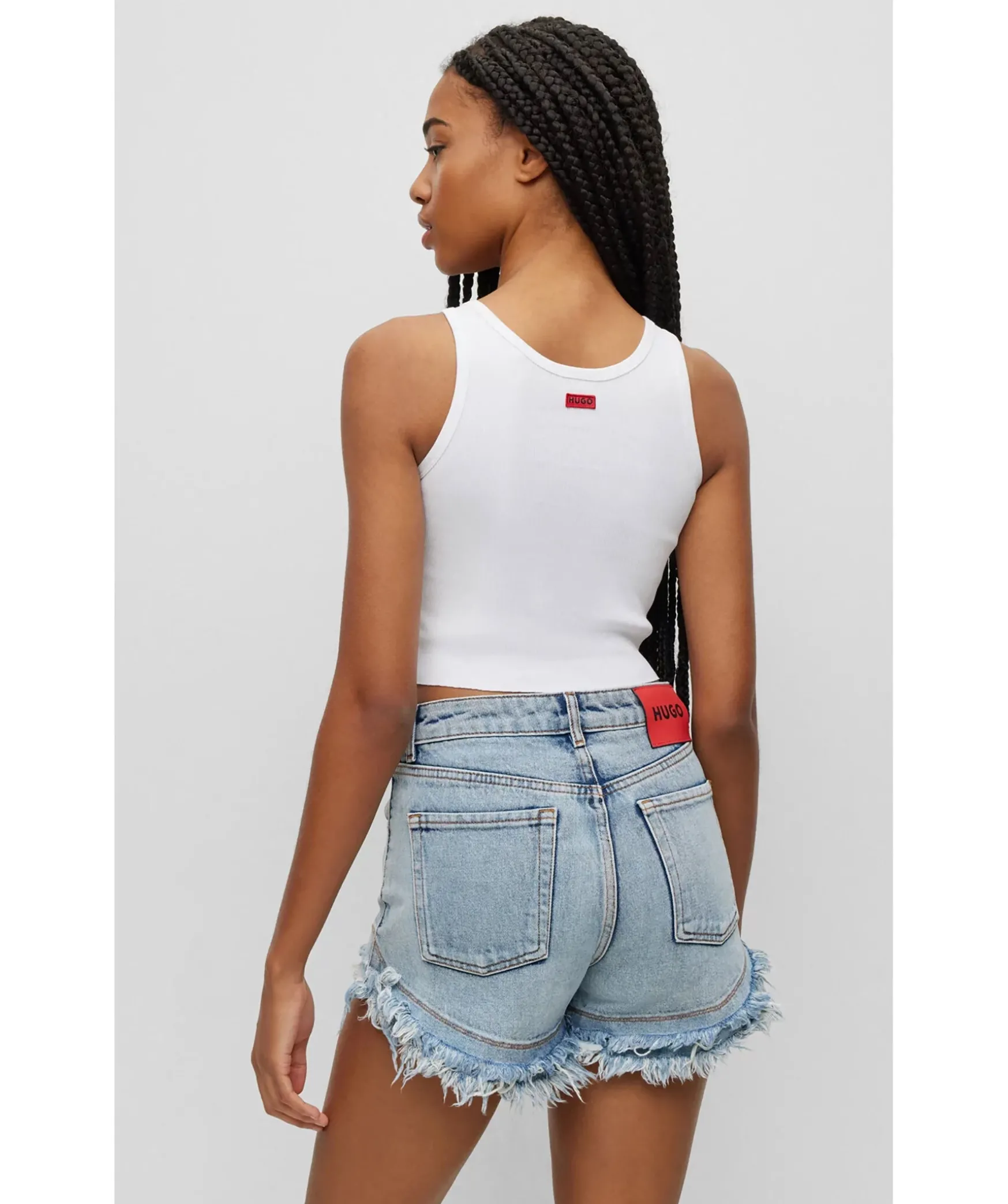 Vitt Ribbat Linne I Cropad Modell Fran Hugo. Rundad Halsringning. Rod Patch Med Logotyp Baktill I Nacken. Tillverkad I Bomullsblandning.