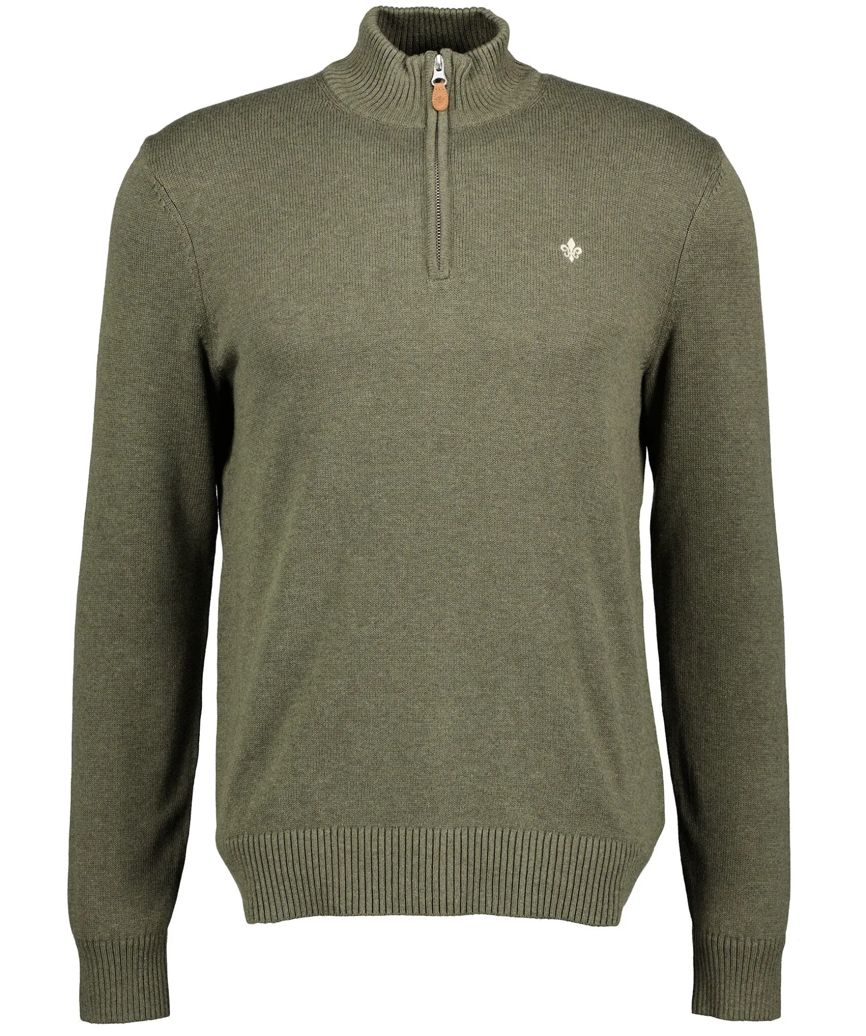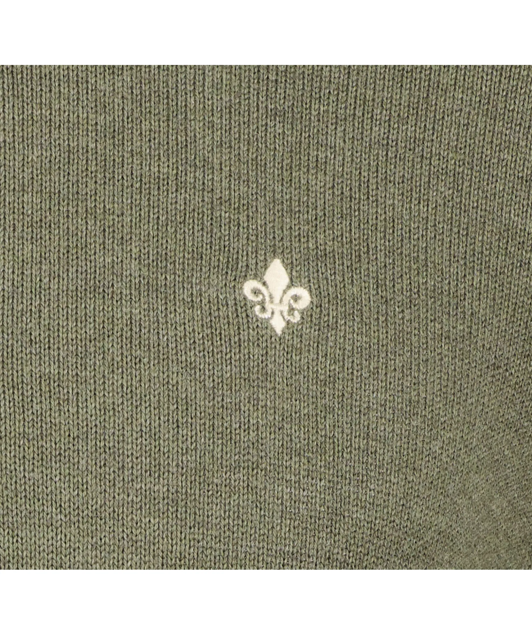 Gron Finstickad Half Zip Troja Fran Morris. Liten Broderad Fransk Lilja Pa Brostet. Ribbstickade Krage Samt Muddar Vid Arm- Och Plaggslut. Tillverkad I 100% Bomull.