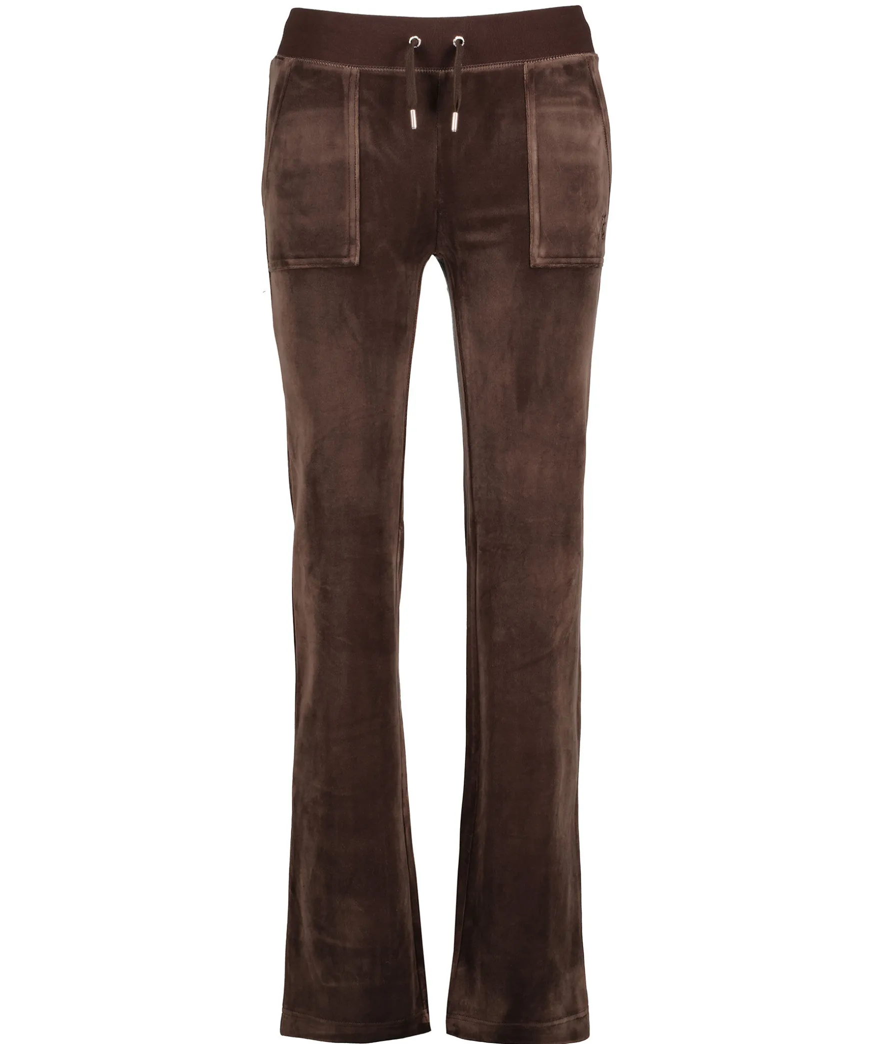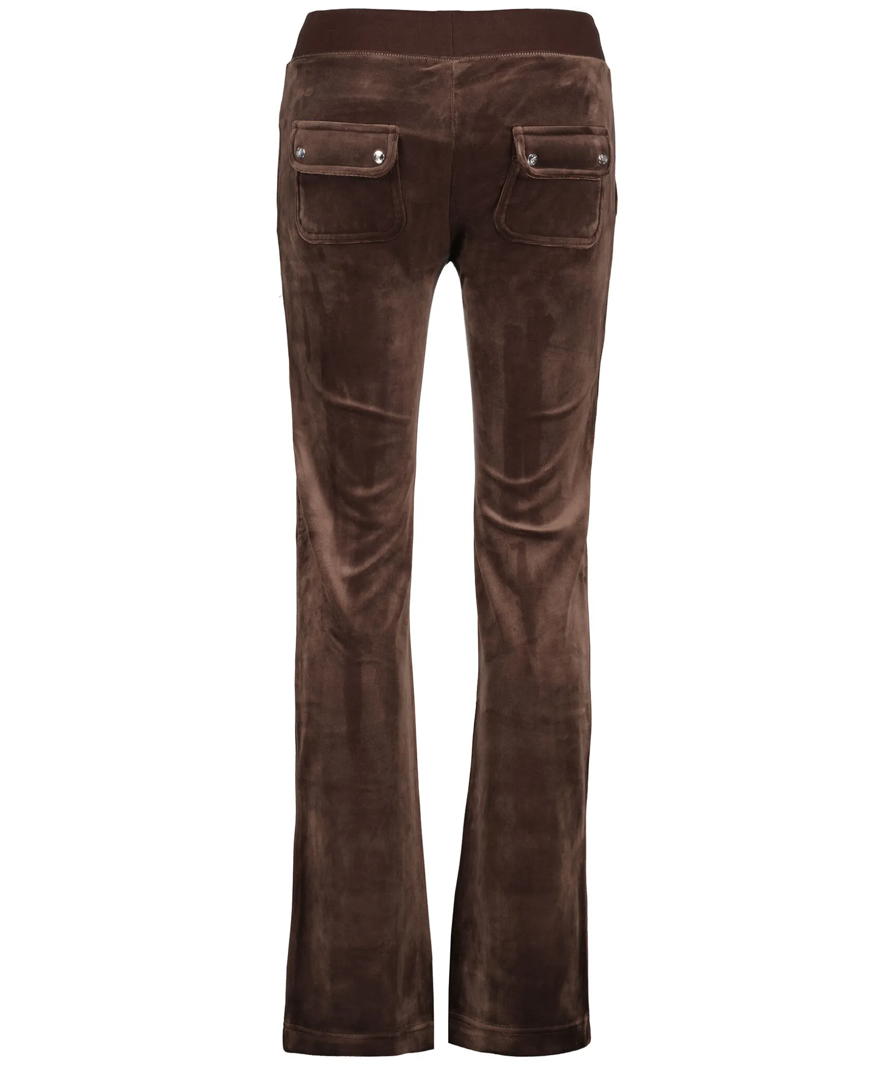 Bruna Byxor I Velour Fran Juicy Couture. Bred Resarkant I Midjan Med Snorning, Fickor I Sidorna Och Bakfickor Med Ficklock Och Tryckknappar Med Logotyp. Rak Modell Broderad Logga Framtill Pa Vanster Ficka.