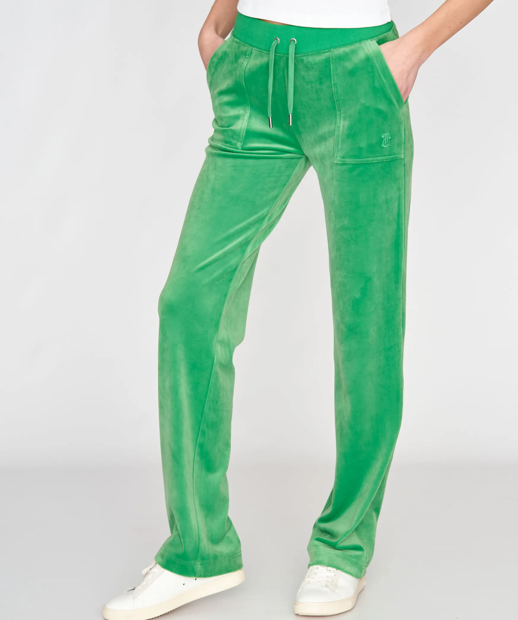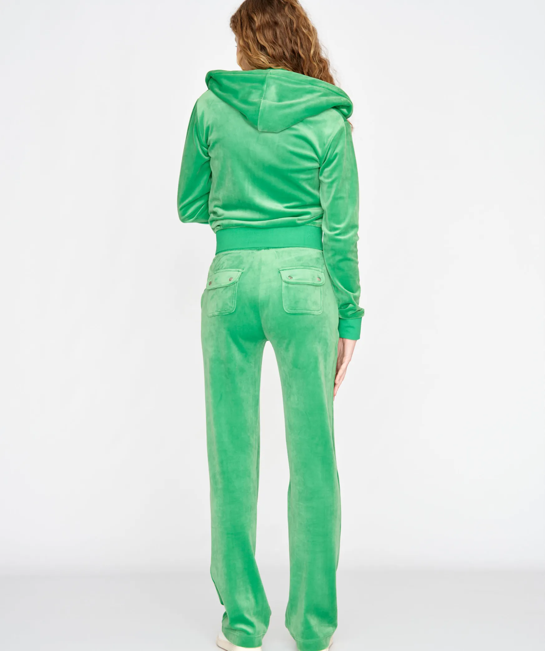 Grona Byxor I Velour Fran Juicy Couture. Bred Resarkant I Midjan Med Snorning, Fickor I Sidorna Och Bakfickor Med Ficklock Och Tryckknappar Med Logotyp. Rak Modell Broderad Logga Framtill Pa Vanster Ficka.