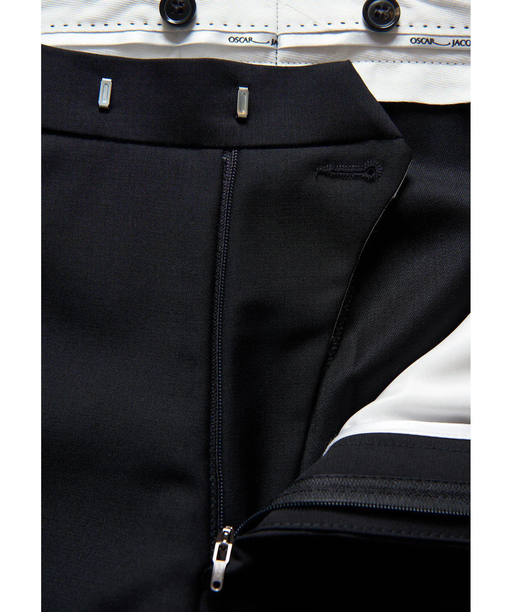 Klassiska Smokingbyxor Med Sidenrevarer. Den Har Modellen Ar Tillverkad I 100 % Ull Och Har En Smal Passform. Forsedda Med Knappar Pa Insidan Av Midjan For Att Fasta Hangslen.Byxan Har 36Cm I Fotvidd I Storlek 50