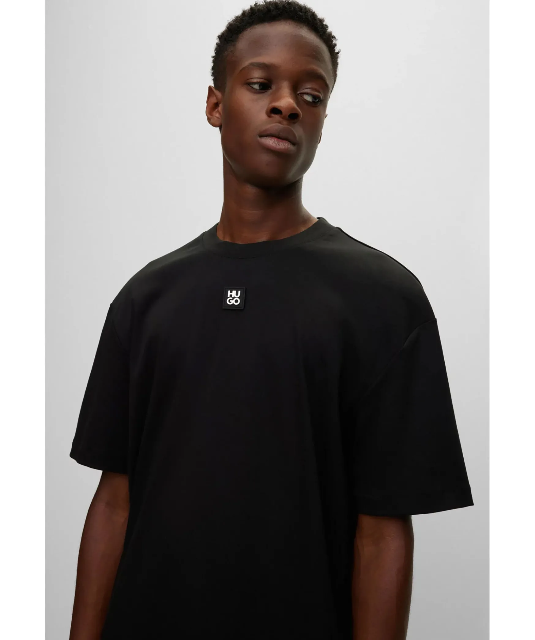Svart T-Shirt Fran Hugo. Ribbstickad Mudd Och Rundad Halsringning. Patch I Gummi Med Logotyp I Metall Mitt Pa Brostet. Tillverkad I 100% Bomull.