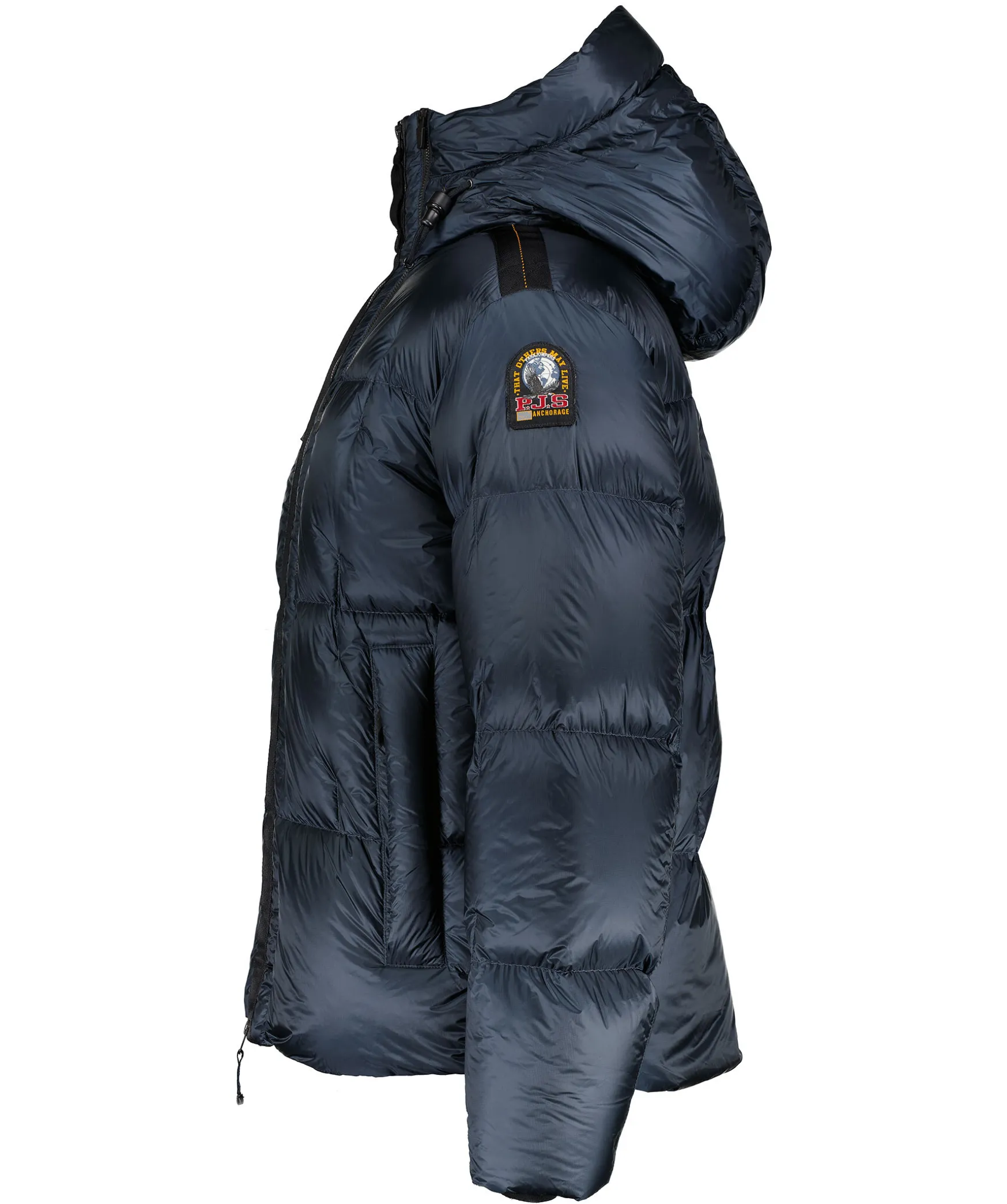 Morkbla Pufferdunjacka Med Huva Fran Parajumpers. Extremt Latt Men Anda Hogpresterande, Diran Pufferjackan Har En Stark Design Och Funktionella Detaljer. Den Stangs Med Tvavagsdragkedja, Har Tva Brostfickor Och Tva Sidfickor Som Alla Stangs Med Dragkedja. Dragsko I Huvan Samt Vid Plaggslut. Patch-Logotyp Pa Vanster Arm. Tillverkad I En Polyamid- Och Polyesterblandning.