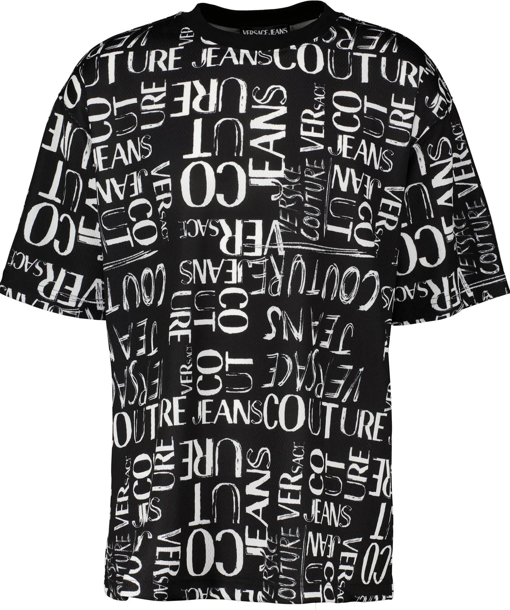 Svart T-Shirt Fran Versace Jeans Couture I Slim-Fit Modell. Vitt Doodle-Logotyptryck Over Hela. Rundad Halsring.