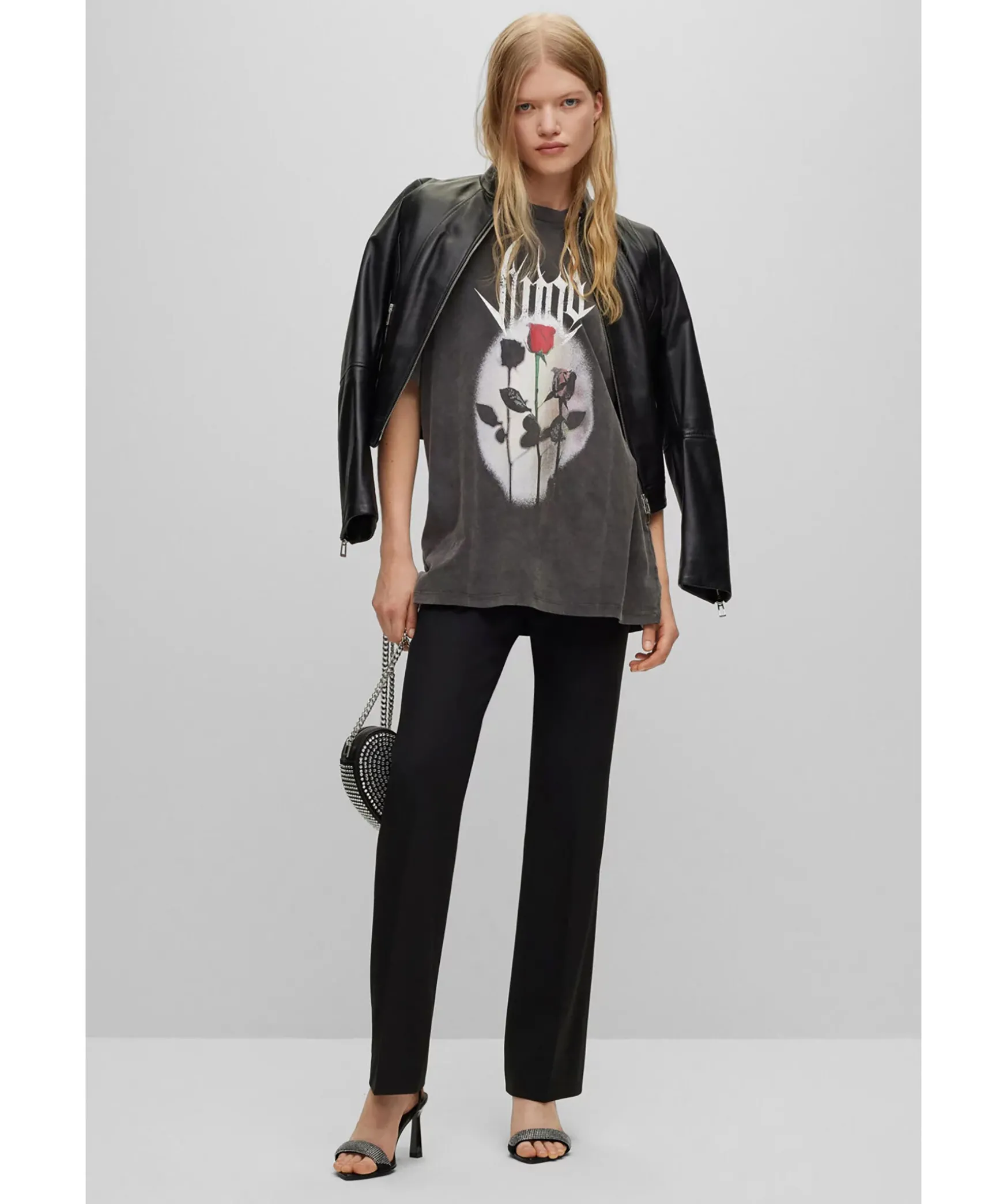 Morkgra T-Shirt Med Stentvattad Finish. Rundad Halsringning. Band Inspirerat Tryck Pa Magen Och Ryggen. Rundad Halsringning Med Ribbstickad Mudd. Oversized Passform. Tillverkad I 100% Bomull.
