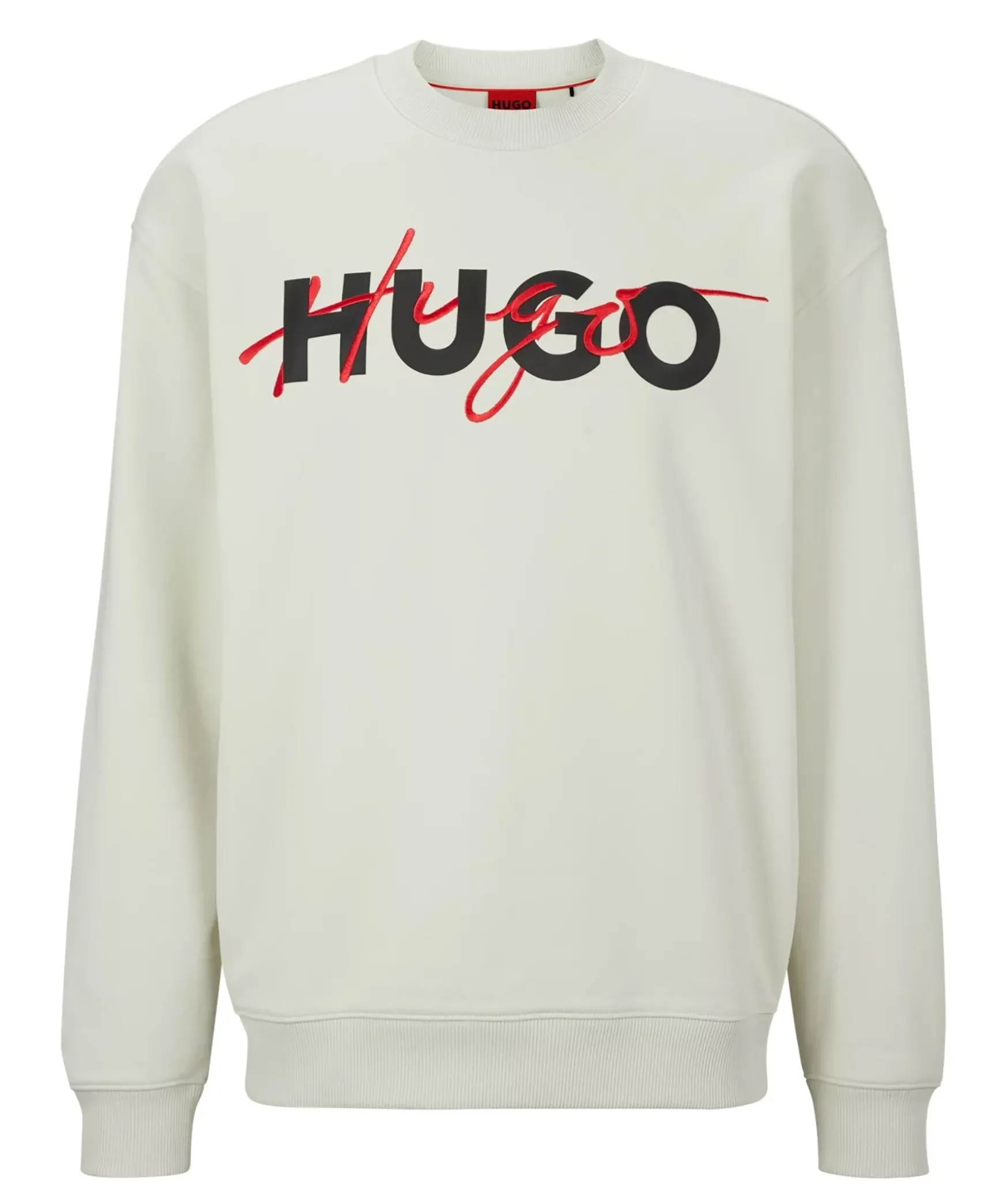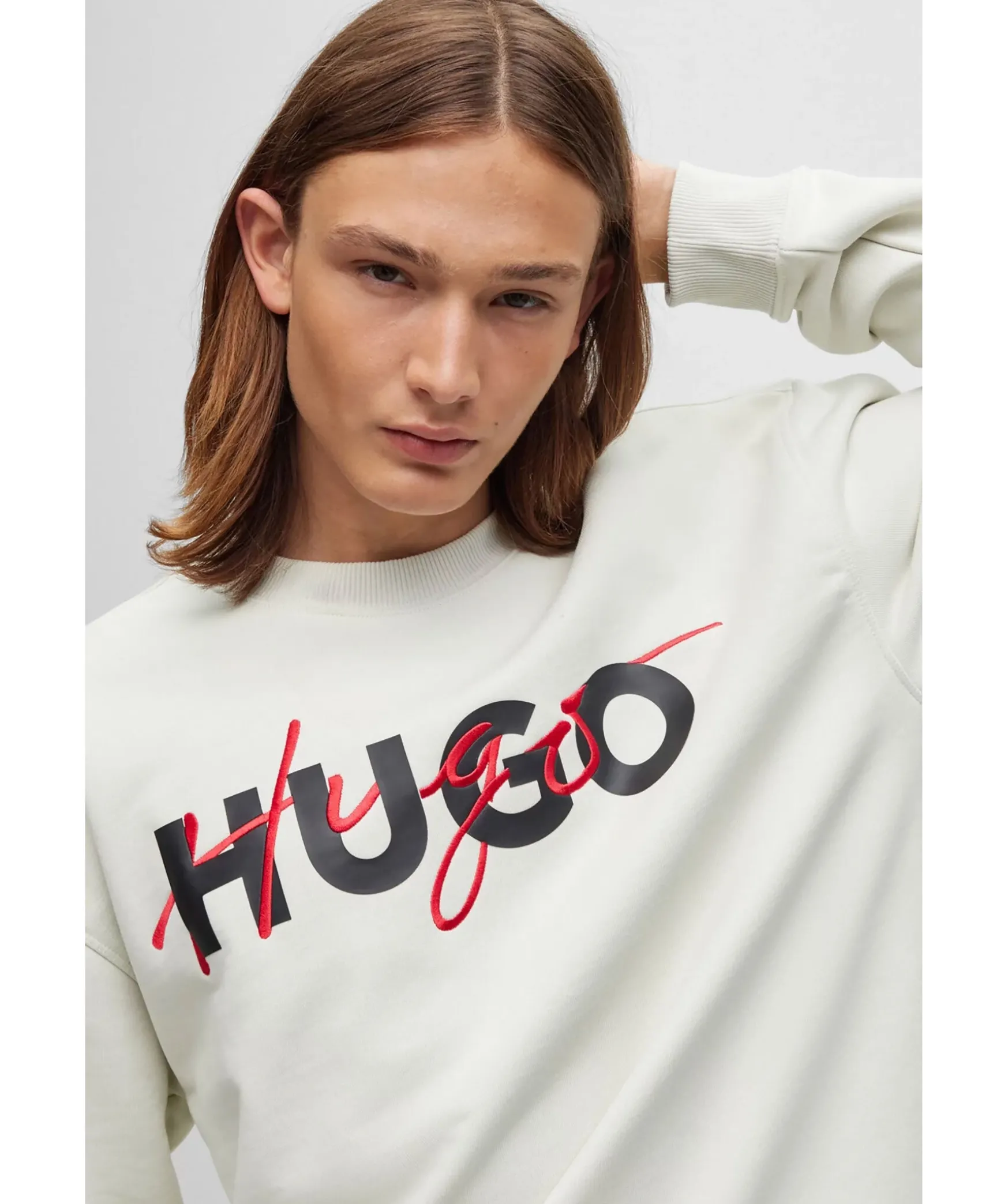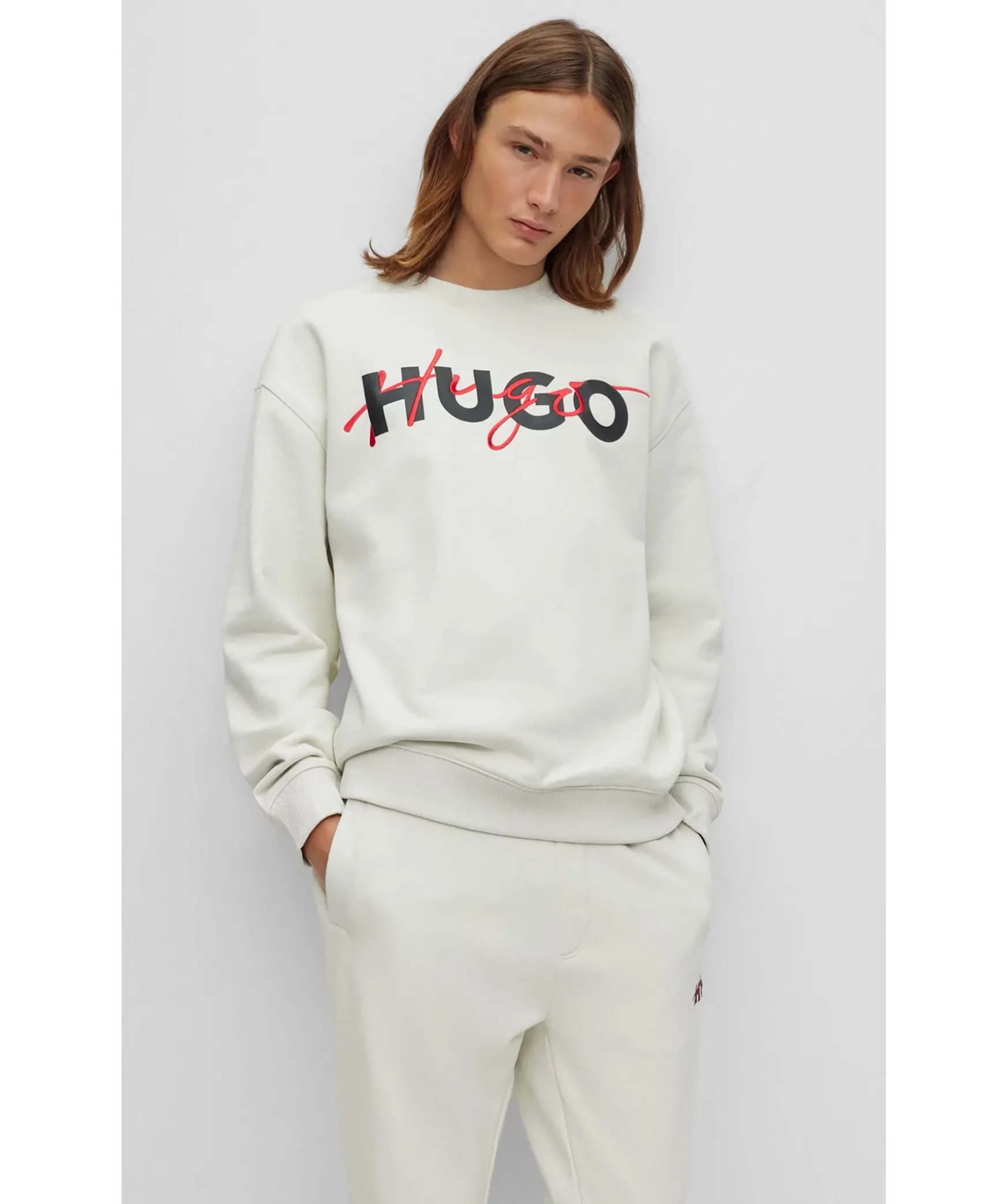 Beige Collegetroja Fran Hugo Men. Tryckt Logotyp I Svart Over Brostet, Broderad Logotyp I Rott. Ribbstickade Muddar Vid Arm- Och Plaggslut. Tillverkad I Bomullsblandning.