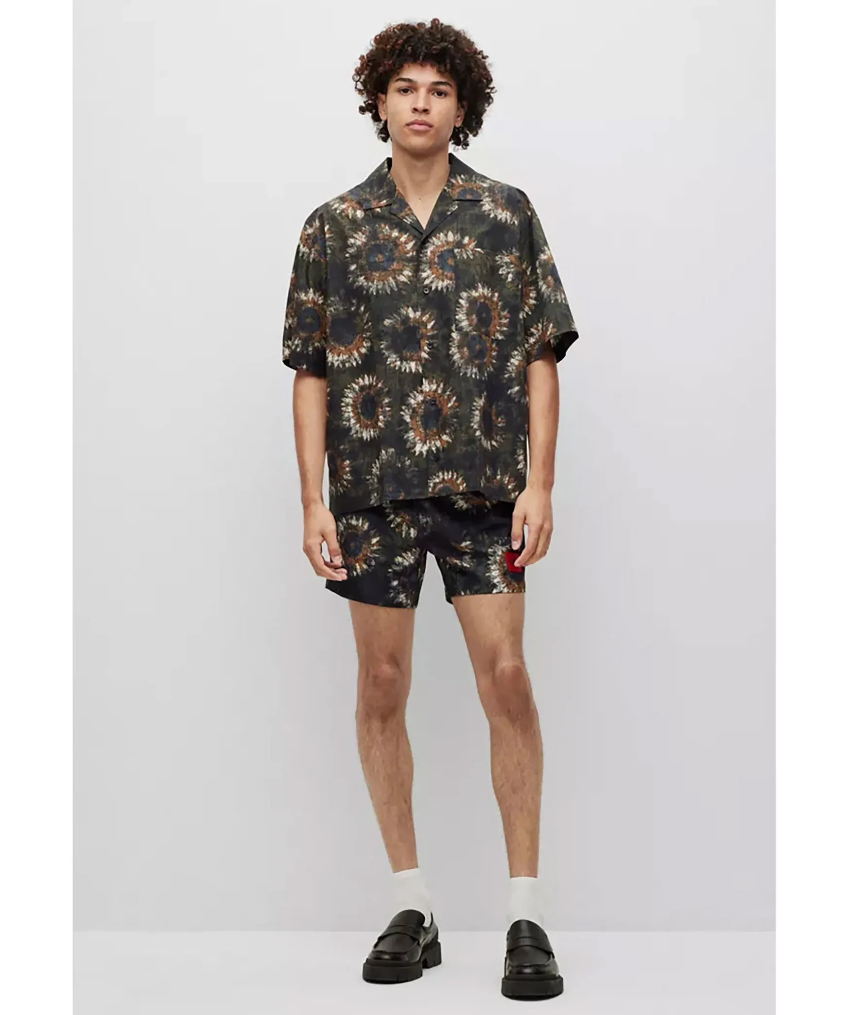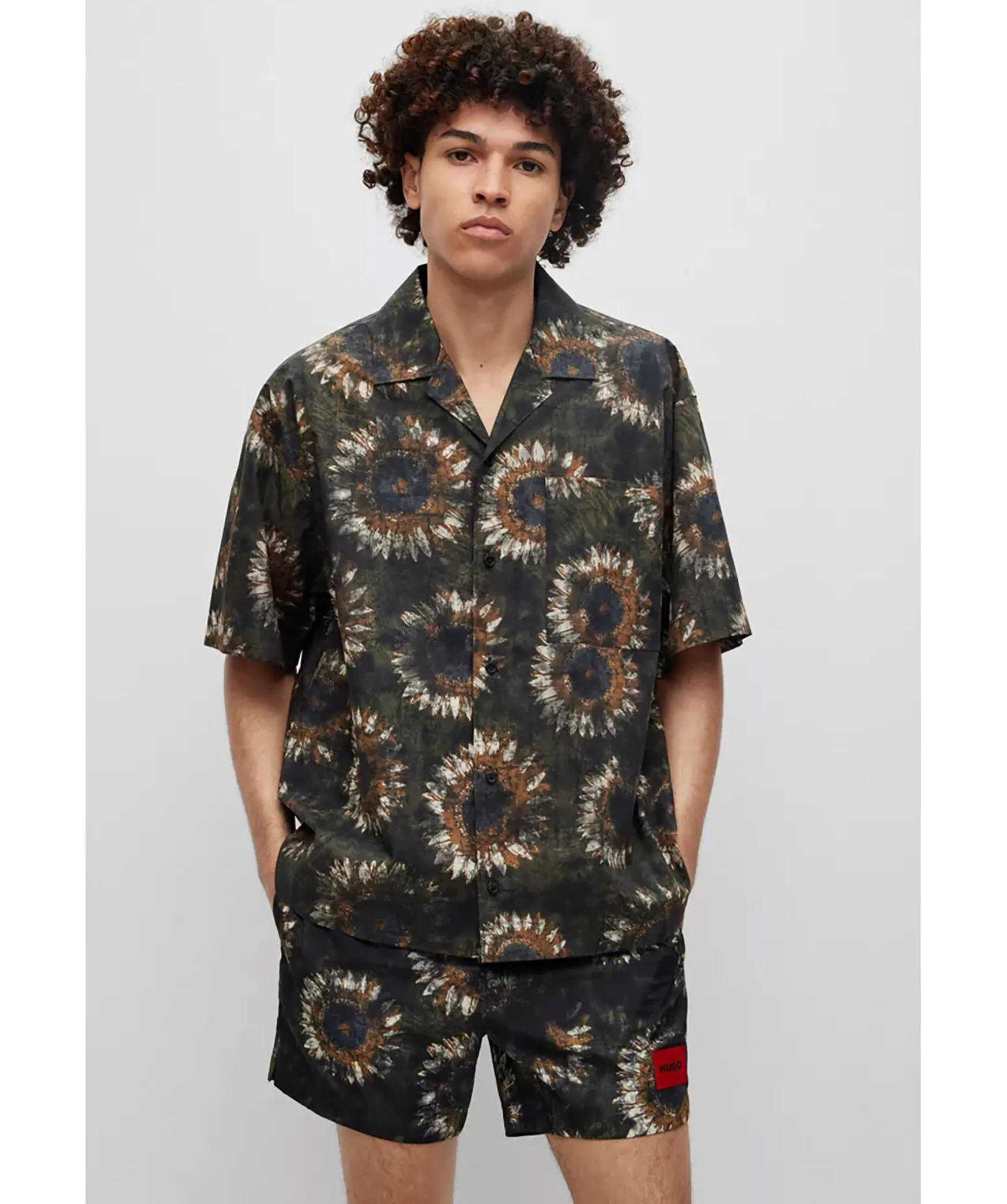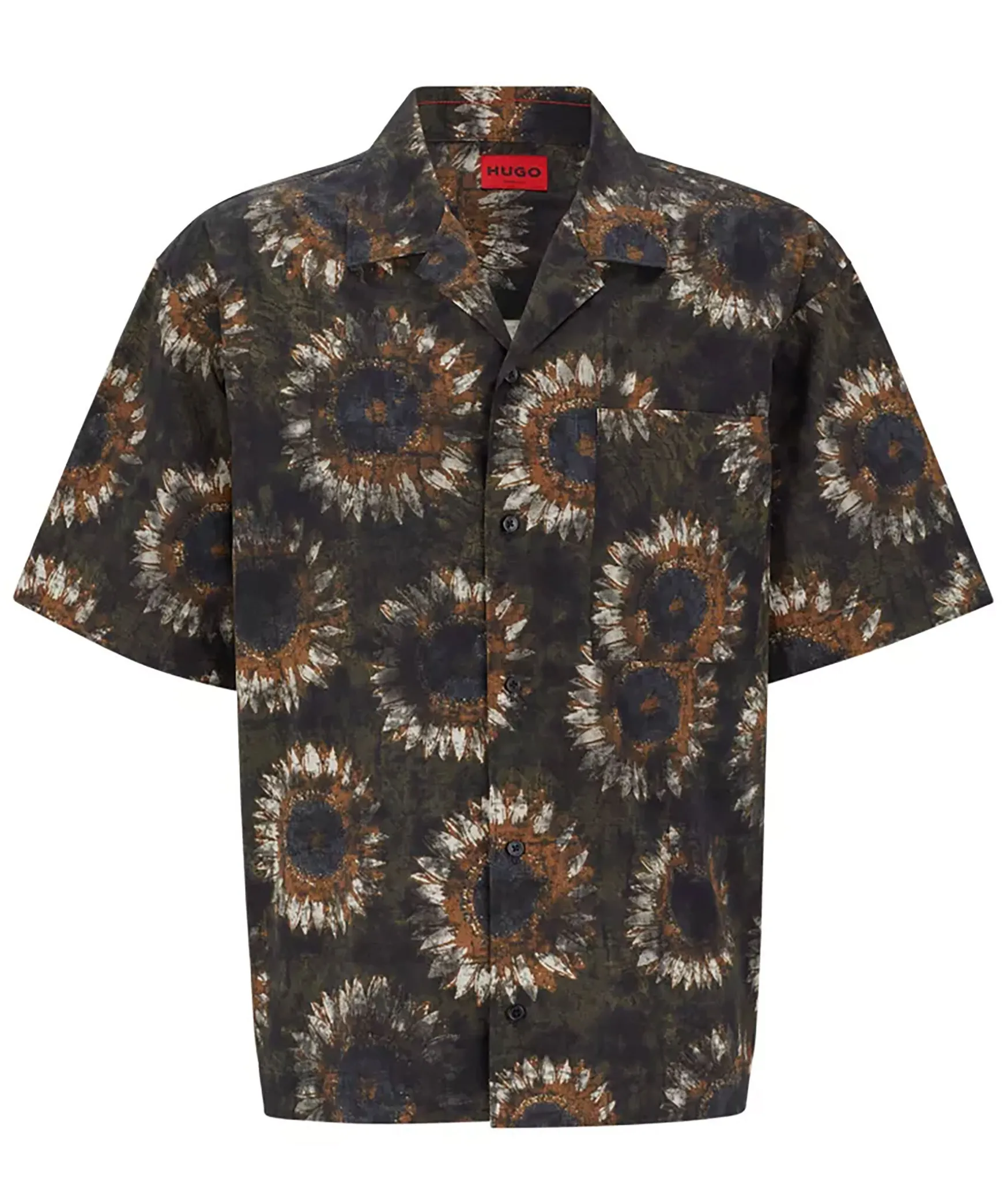 Morkgron Kortarmad Skjorta Fran Hugo. Skjortan Har En Overdimensionerad Passform Och Ett Abstrakt Blommonster. Brostficka.