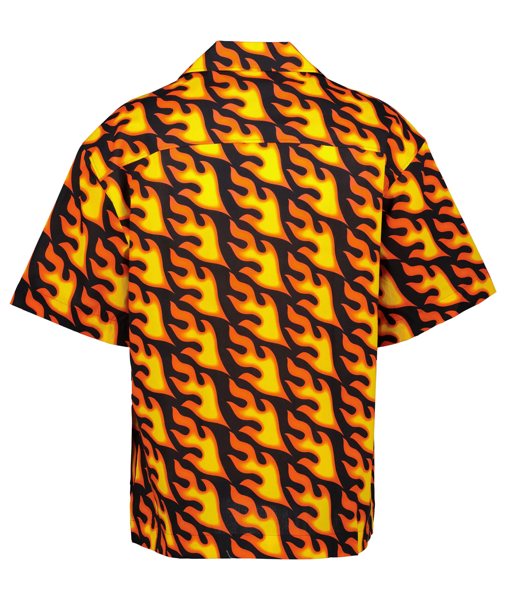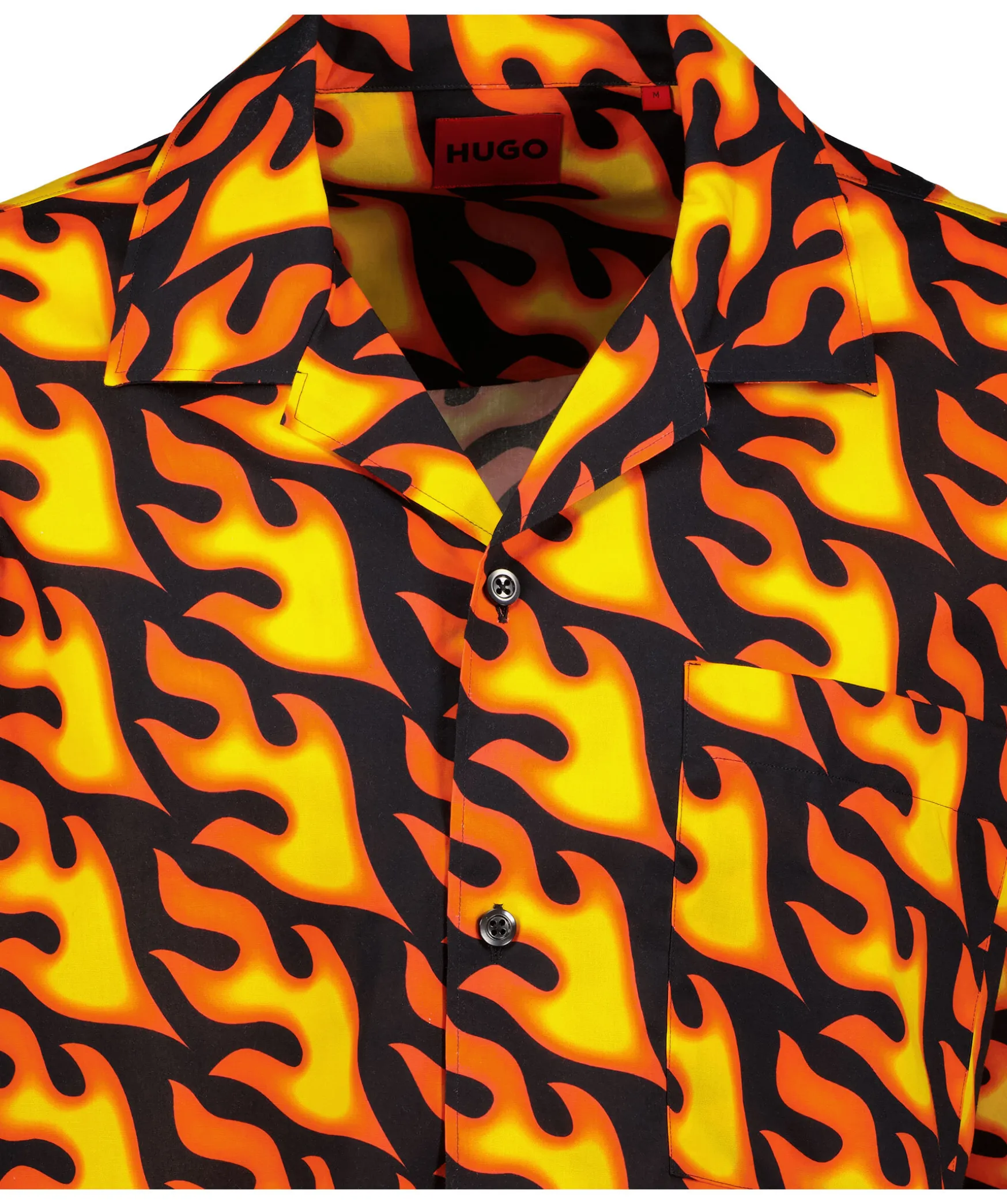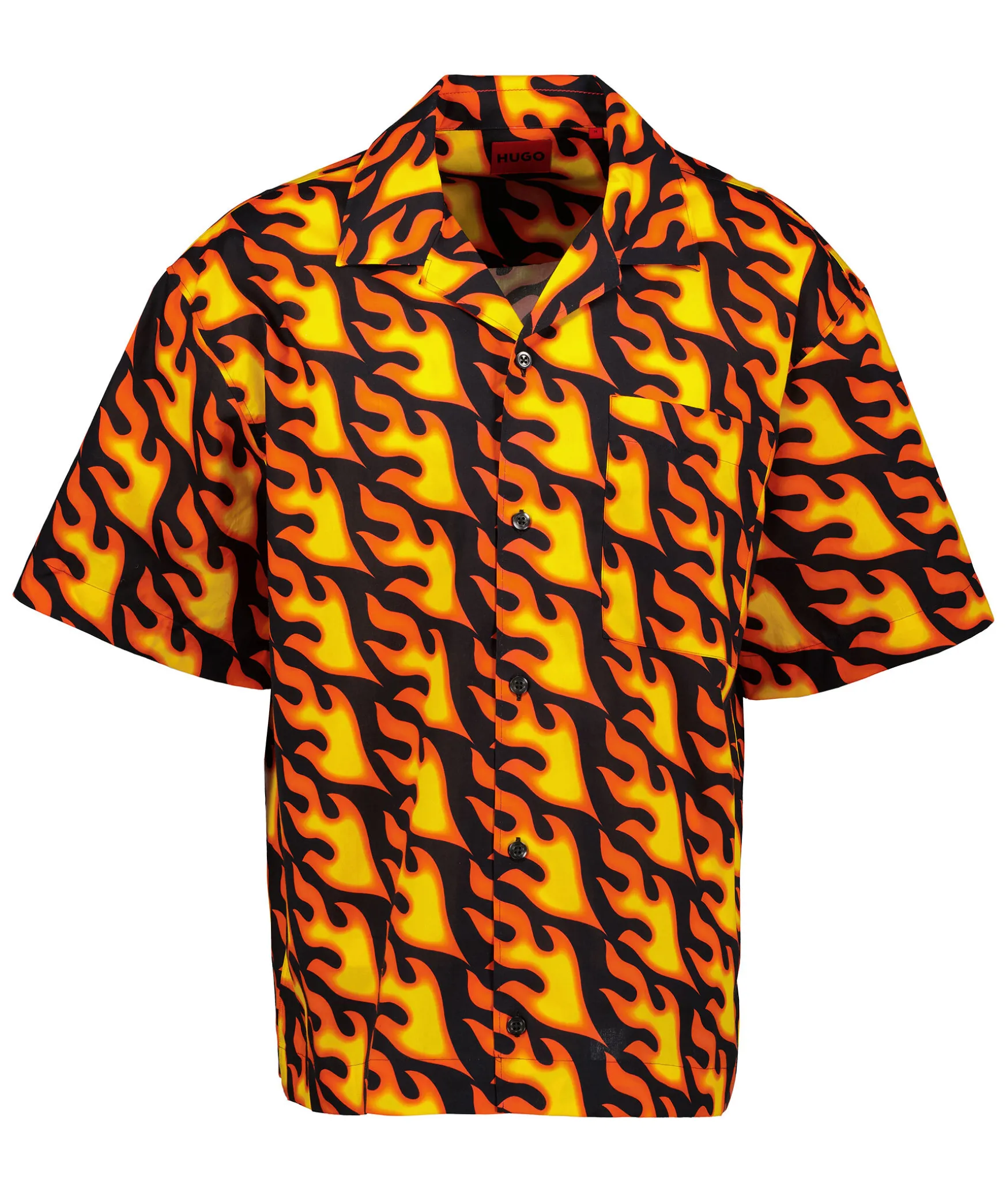 En Svart Kortarmad Skjorta Fran Hugo Herr. Designad I Oversize Fit Av Mjuk Poplin Med Ett Sasongsmotiv Av Eldflammor Over Hela Skjortan. Omvanda Kavajslag, Brostficka, Stangs Med Knappar. Tillverkad I 100% Bomull.