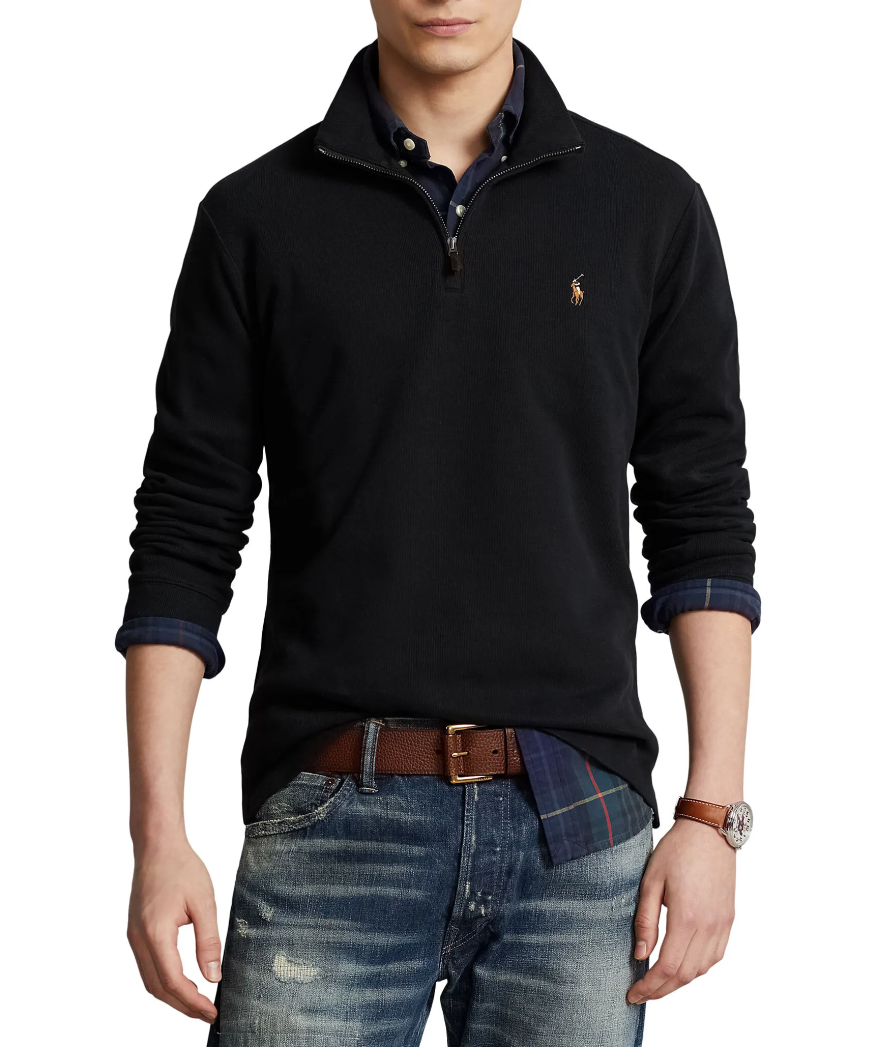Svart Stickad Troja Fran Polo Ralph Lauren I Bomullskvalitet. Krage Med Dragkedja, Ribbstickade Muddar Samt Broderad Logotyp Pa Vanster Brost.