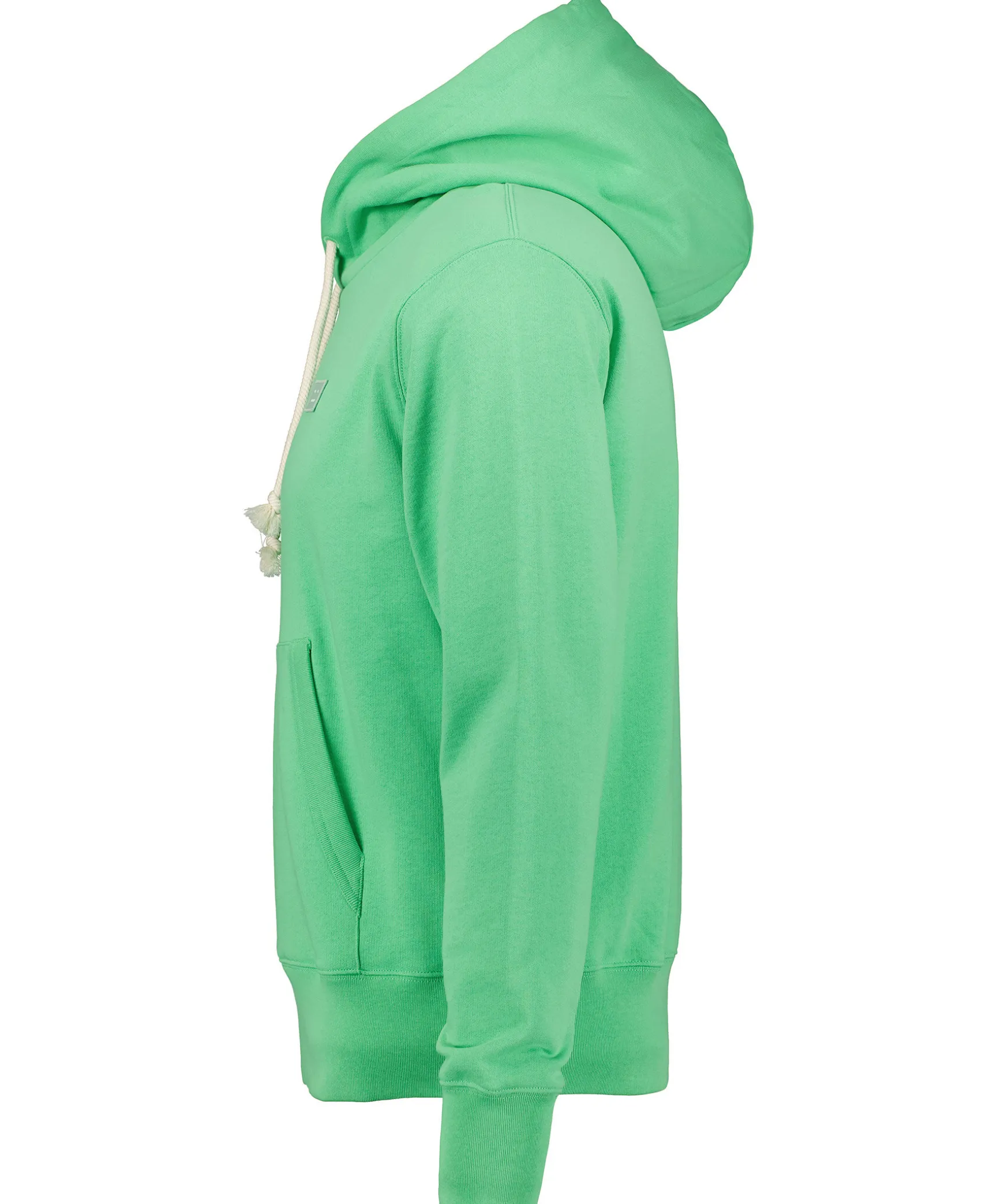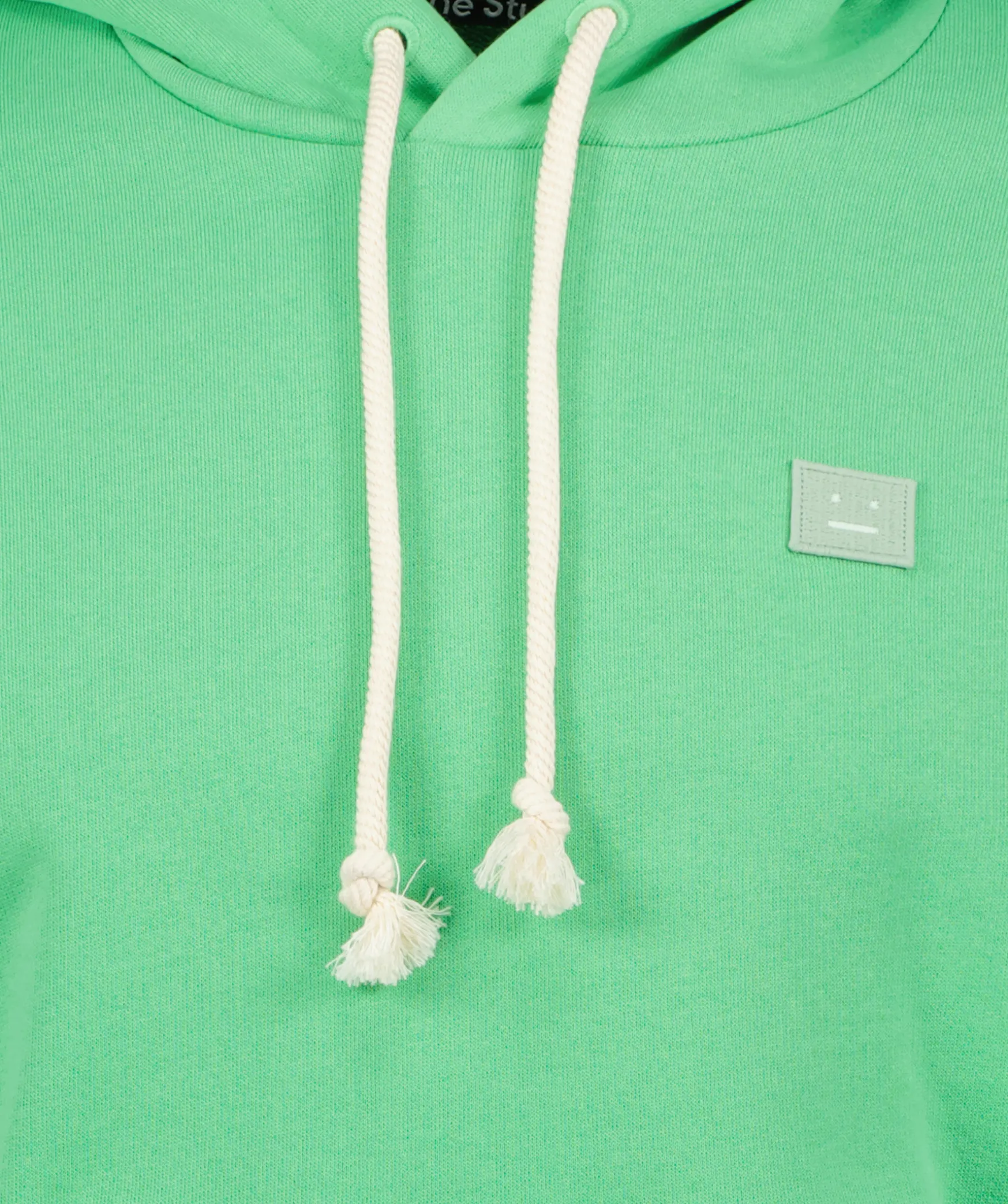 Gron Hoodie Fran Acne Studios Face Kollektion. Luva Med Dragsko. Kanguru Ficka Pa Magen. Broderad Patch Med Face Logotyp Pa Vanster Brost. Ribbstickade Muddar I Arm- Och Plaggslut.