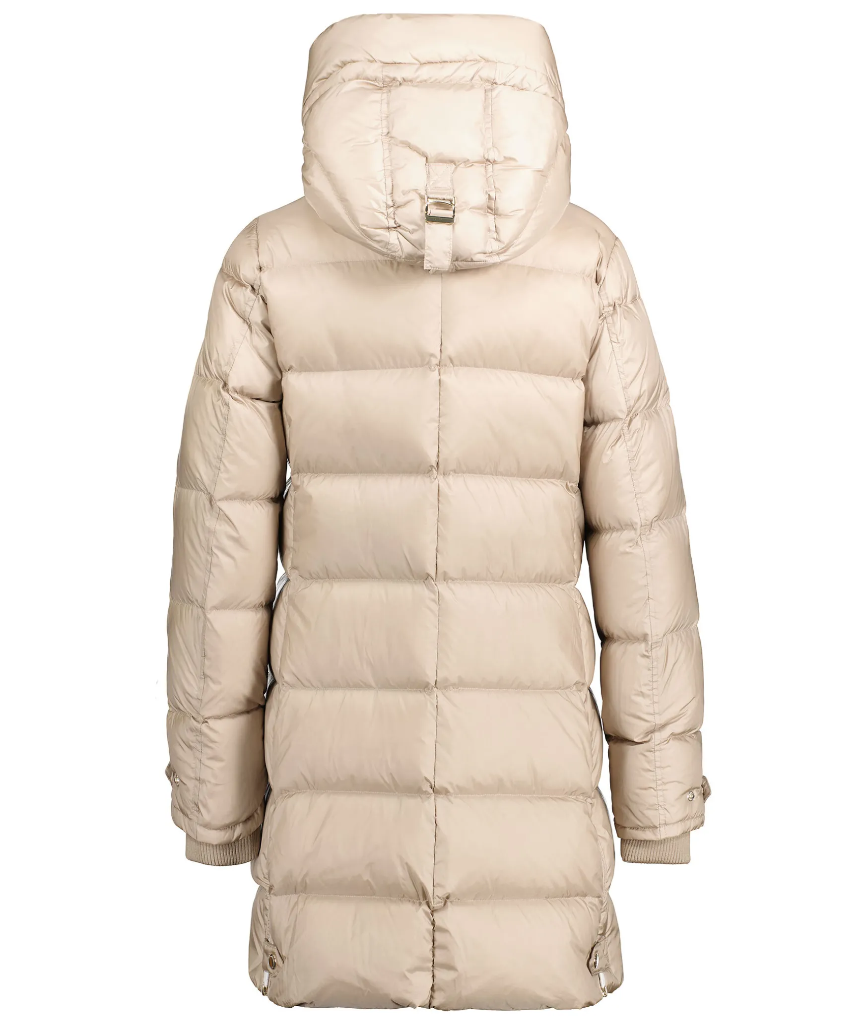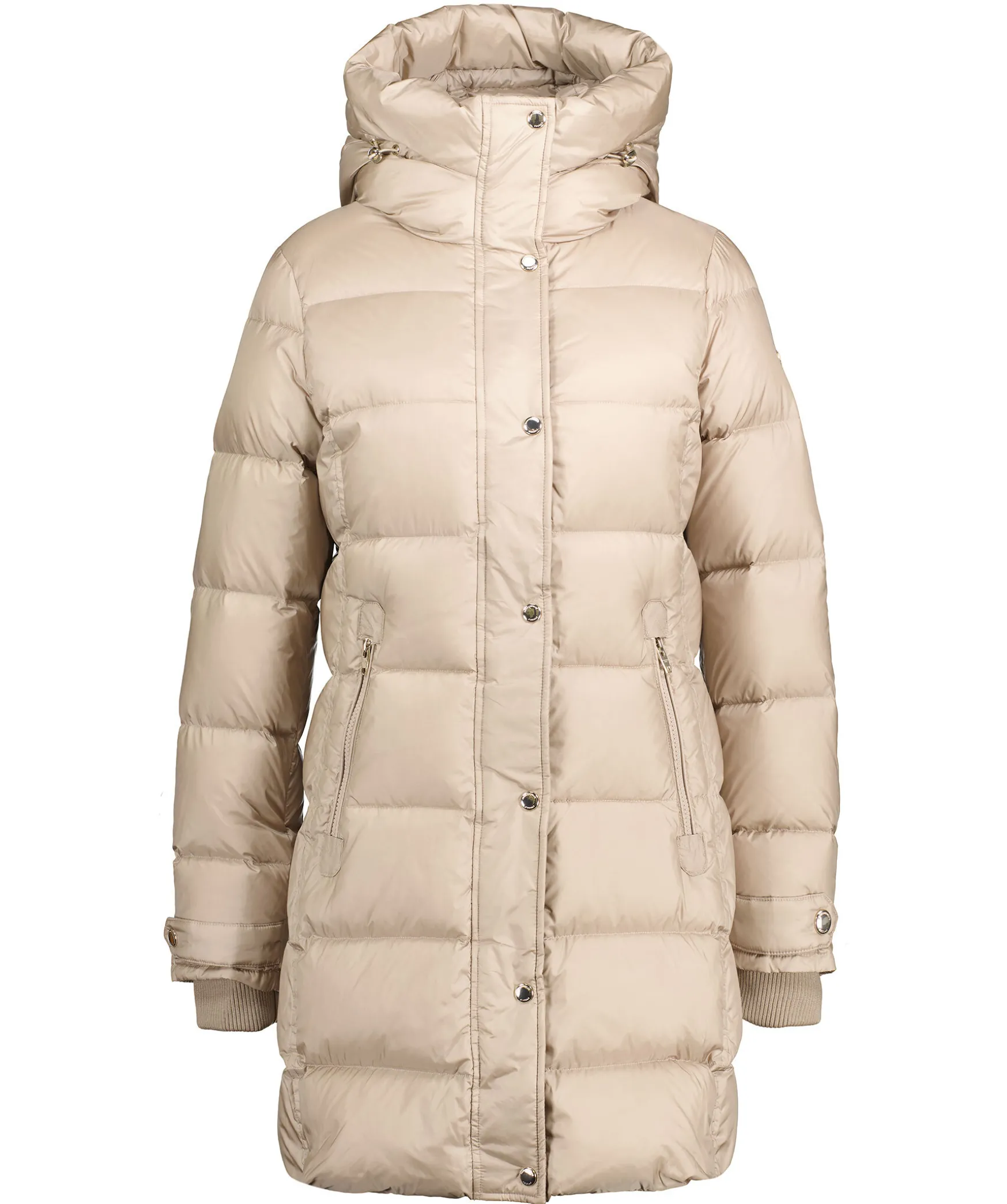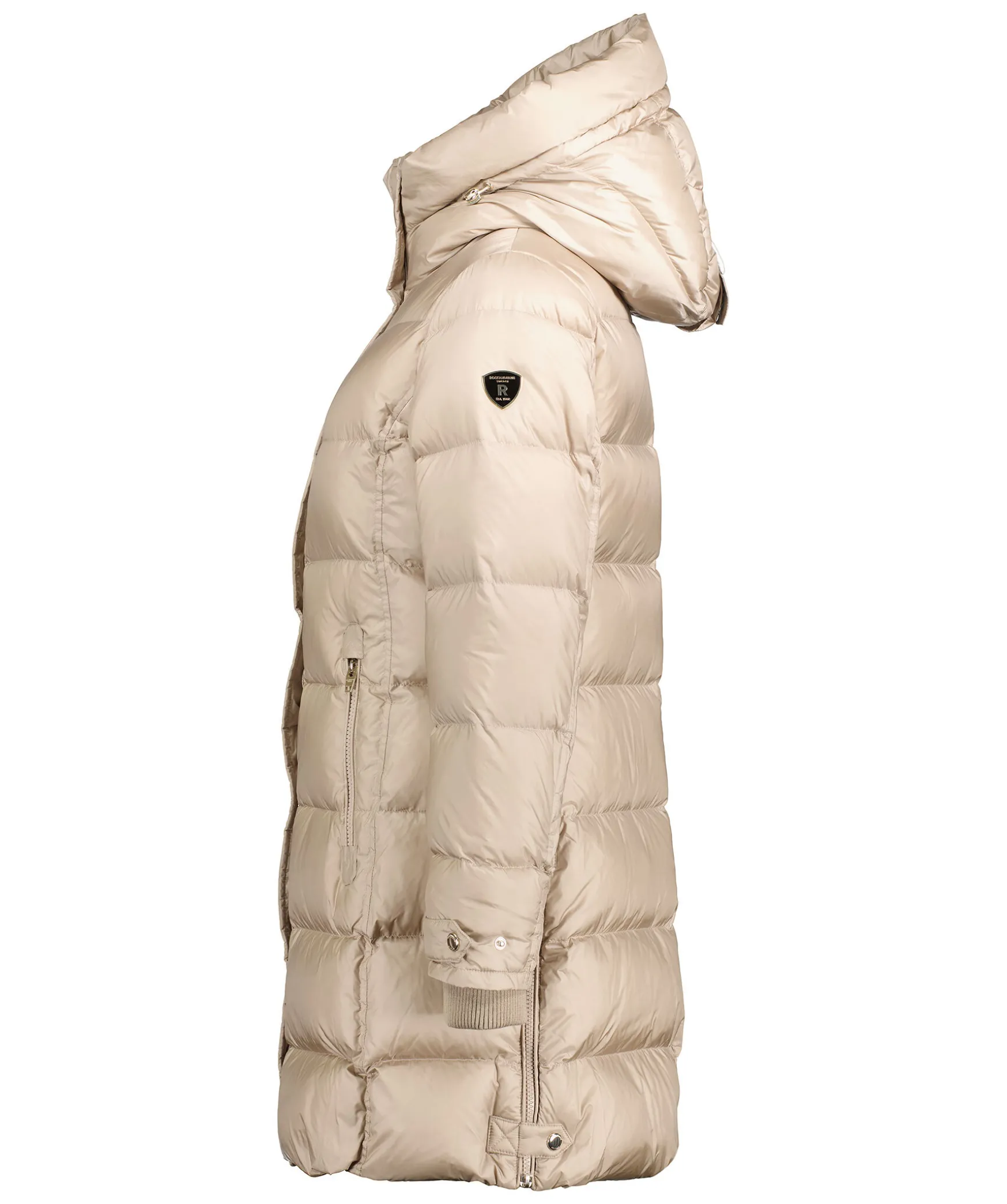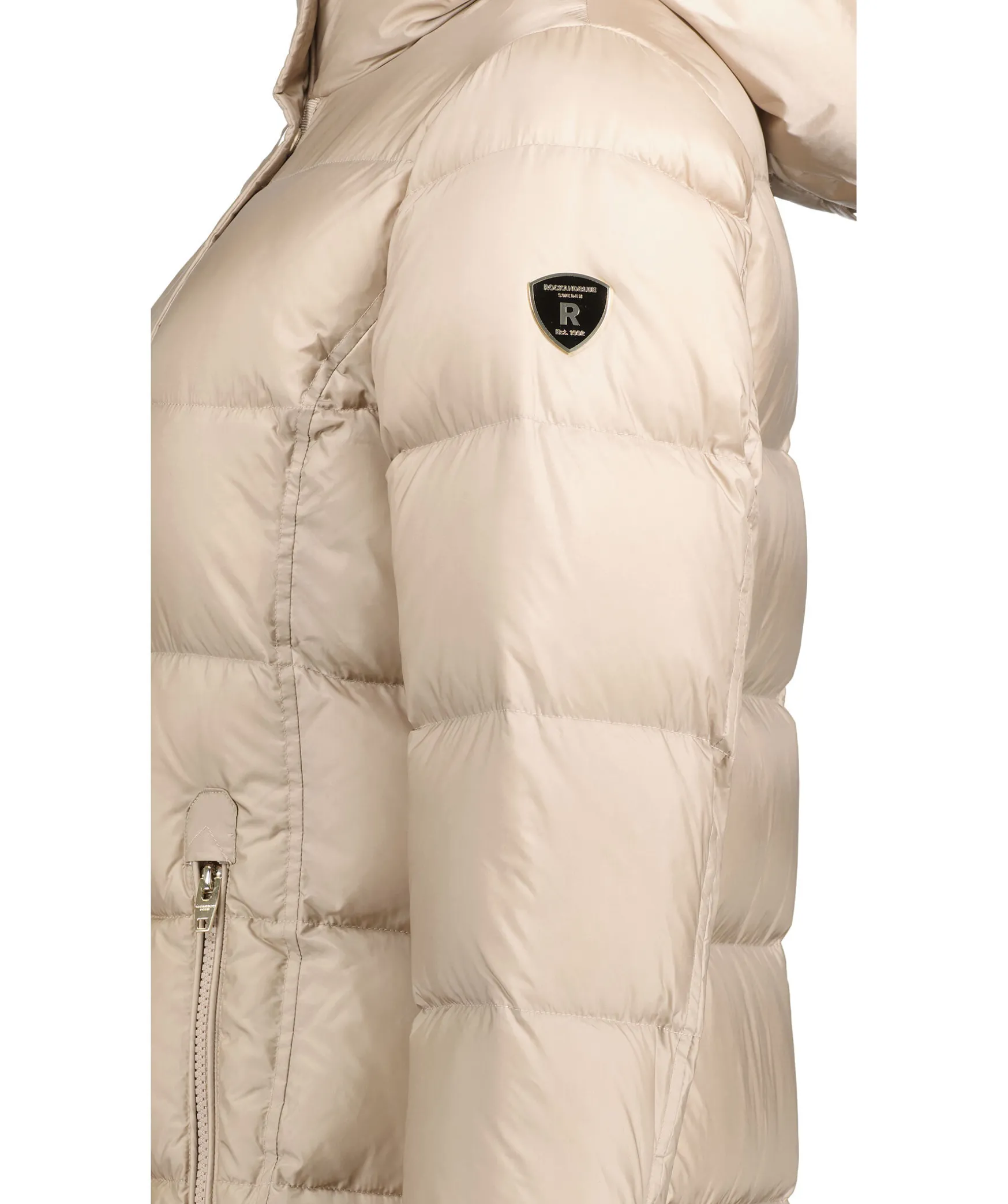 Beige Quiltad Dunkappa Fran Rockandblue. Stangs Framtill Med Guldfargade Knappar. Bricka Med Logotyp Pa Vanster. Tva Fickor Framtill Som Stangs Med Dragkedja. Innerficka Som Stangs Med Dragkedja.