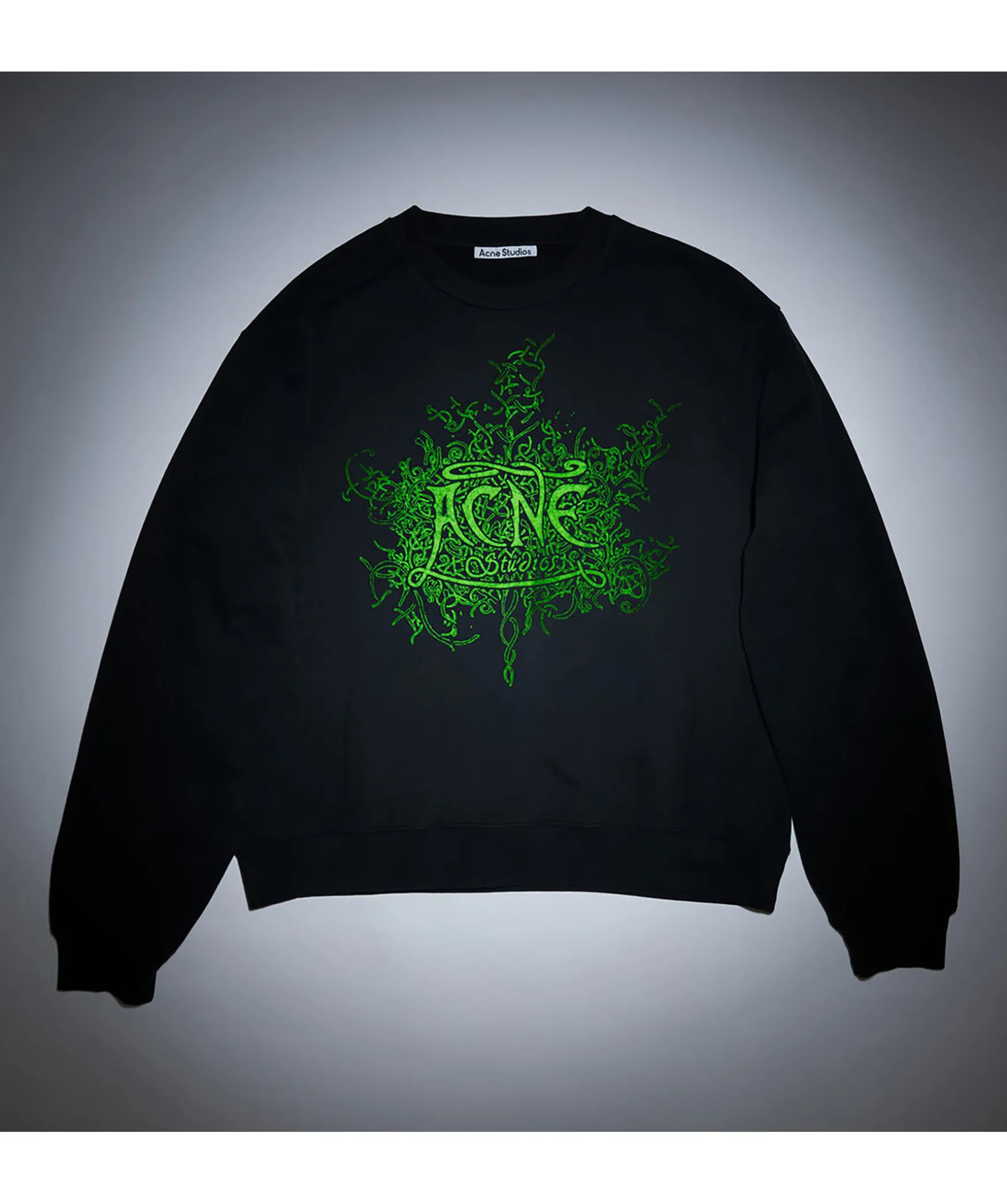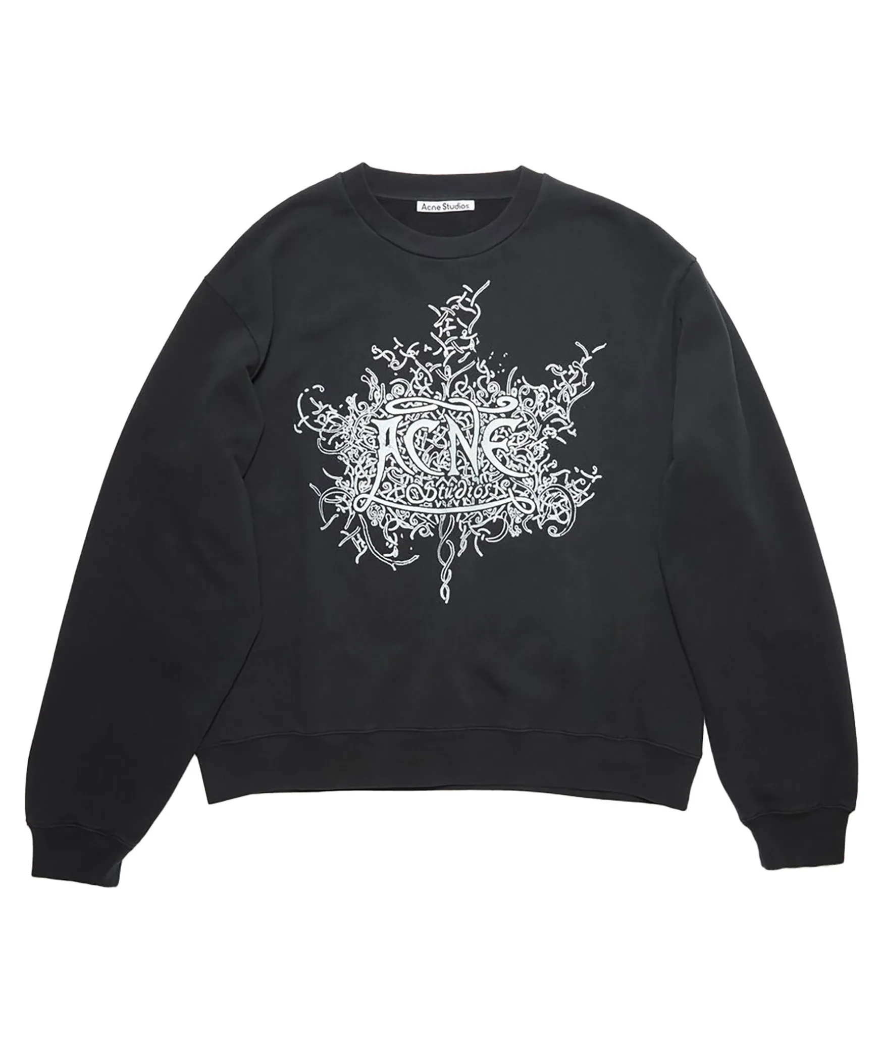 Svart, Blekt Troja Fran Acne Studios. Tillverkad Av Atervunnen Bomull. Rundad Halsring Med En Stor Logotyp Pa Brostet Som Lyser I Morkret. Komplett Med Ribbad Halsringning Och Muddar, Och Klippt Till En Avslappnad Passform.