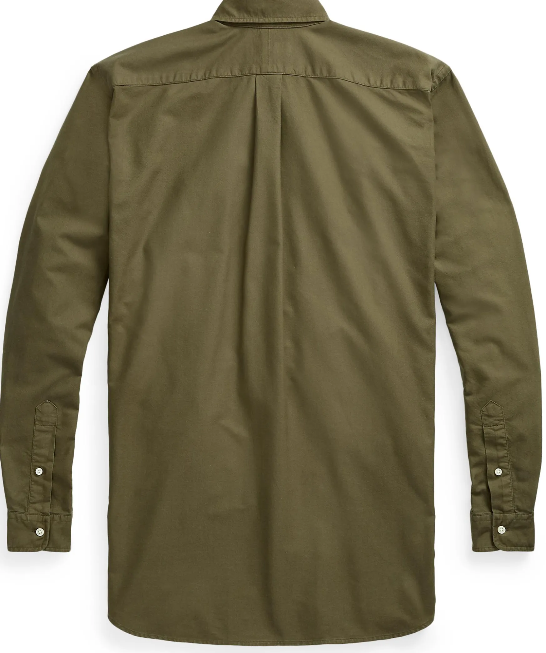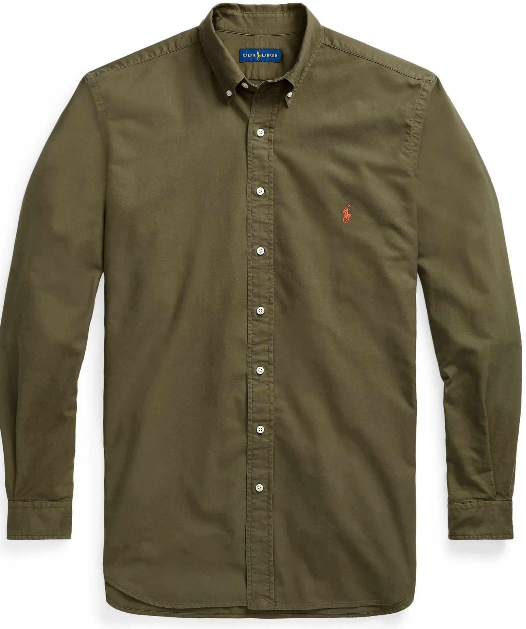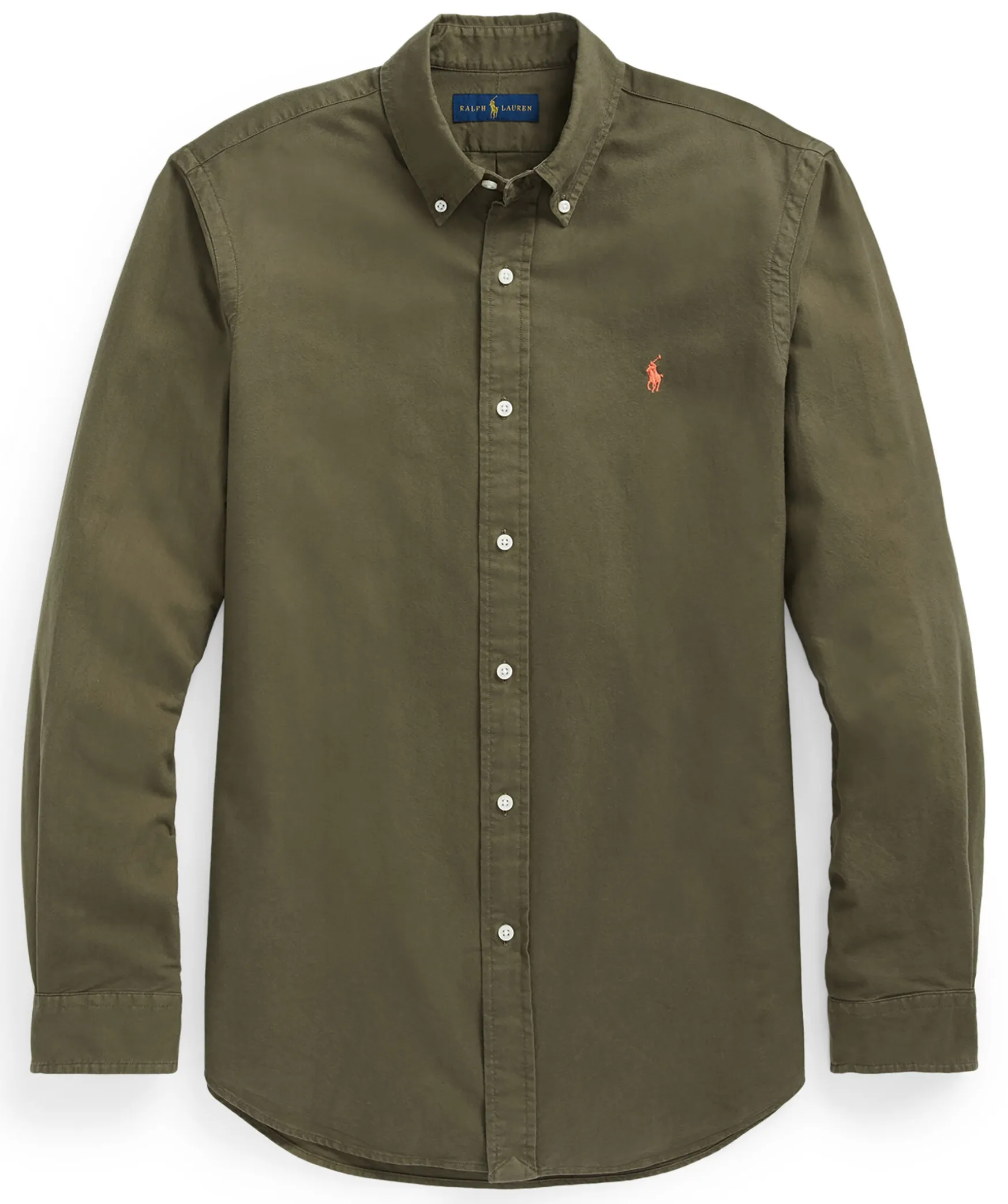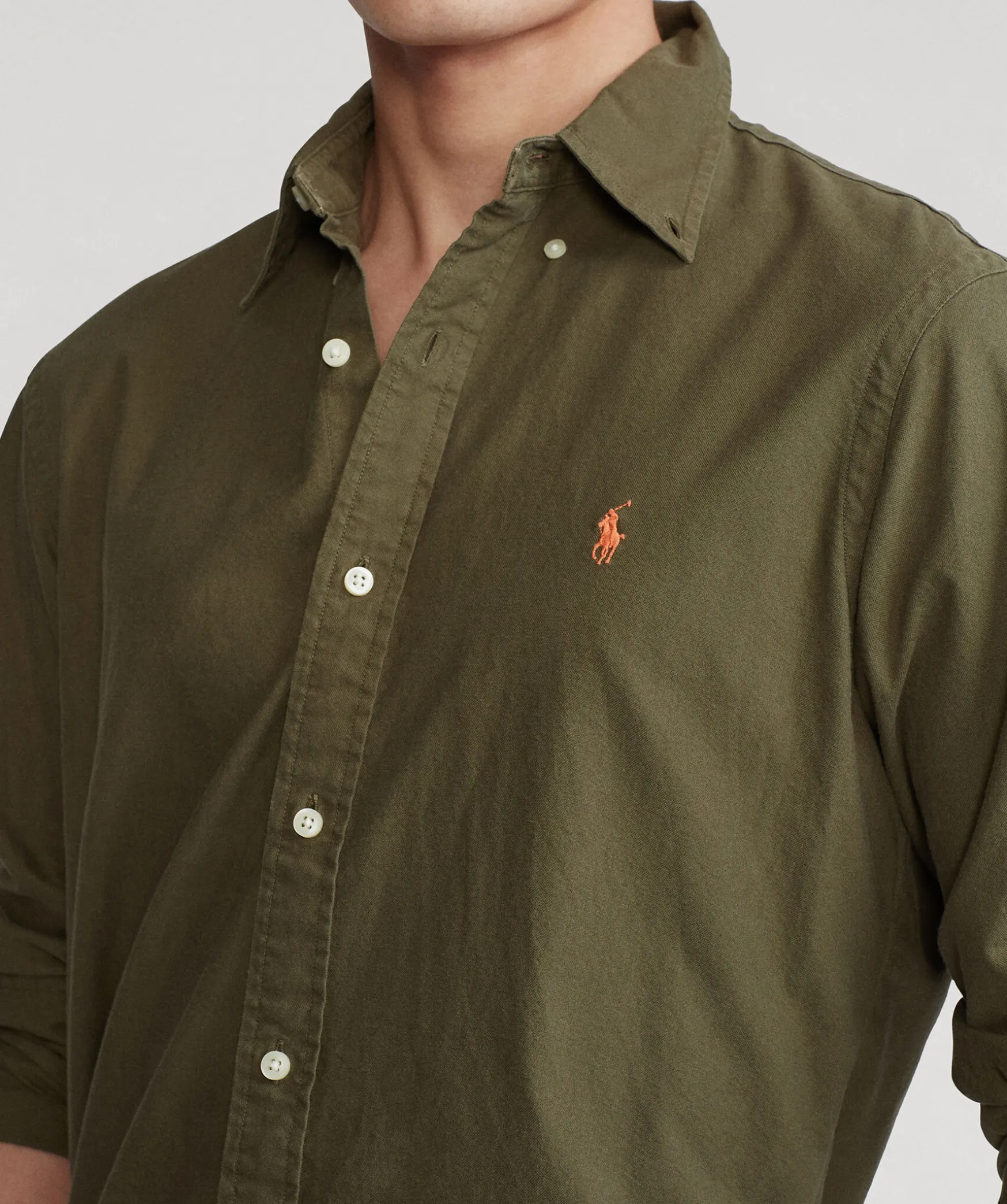 Gron Oxfordskjorta Fran Polo Ralph Lauren. Orange Broderad Logga Pa Brostet, Button Down Krage, Slim Fit. Tillverkad I 100% Bomull.