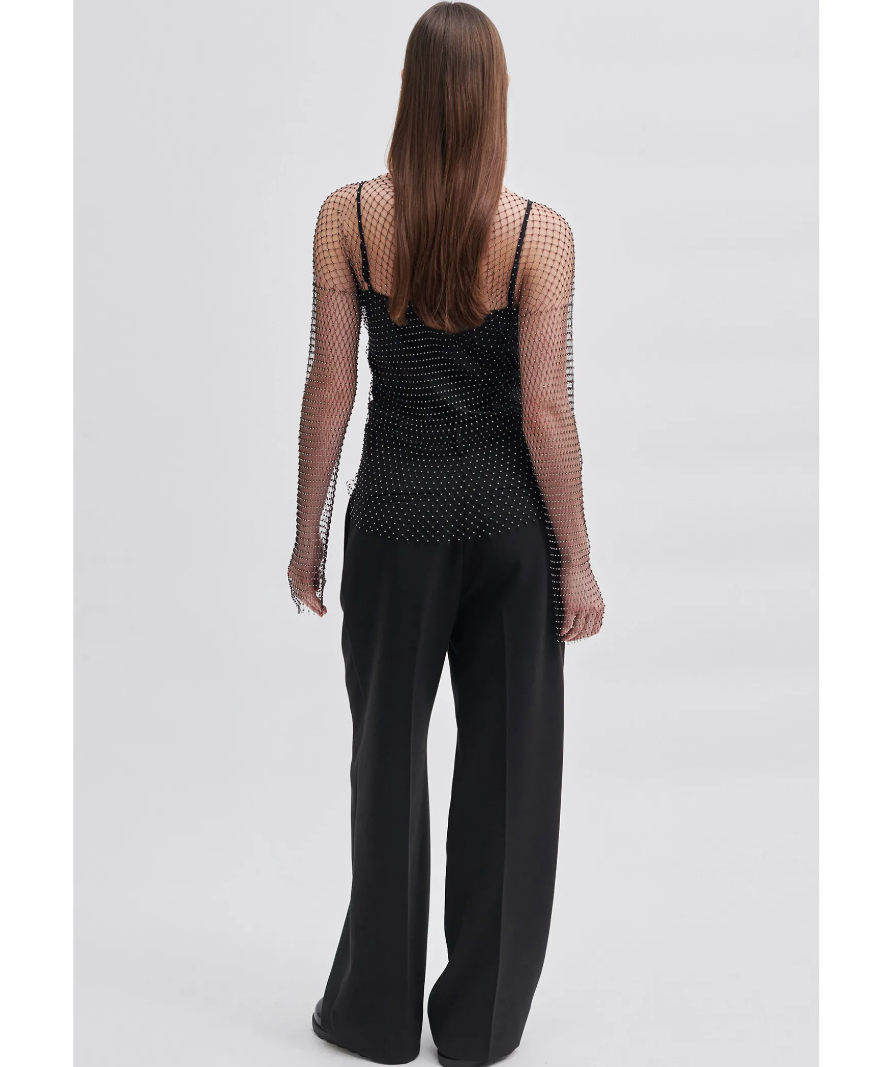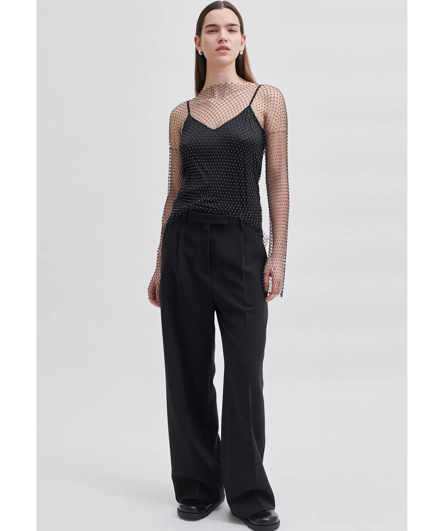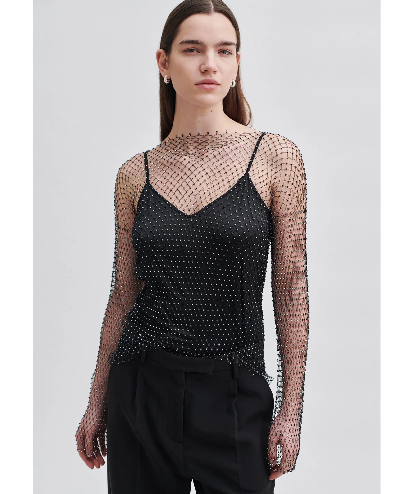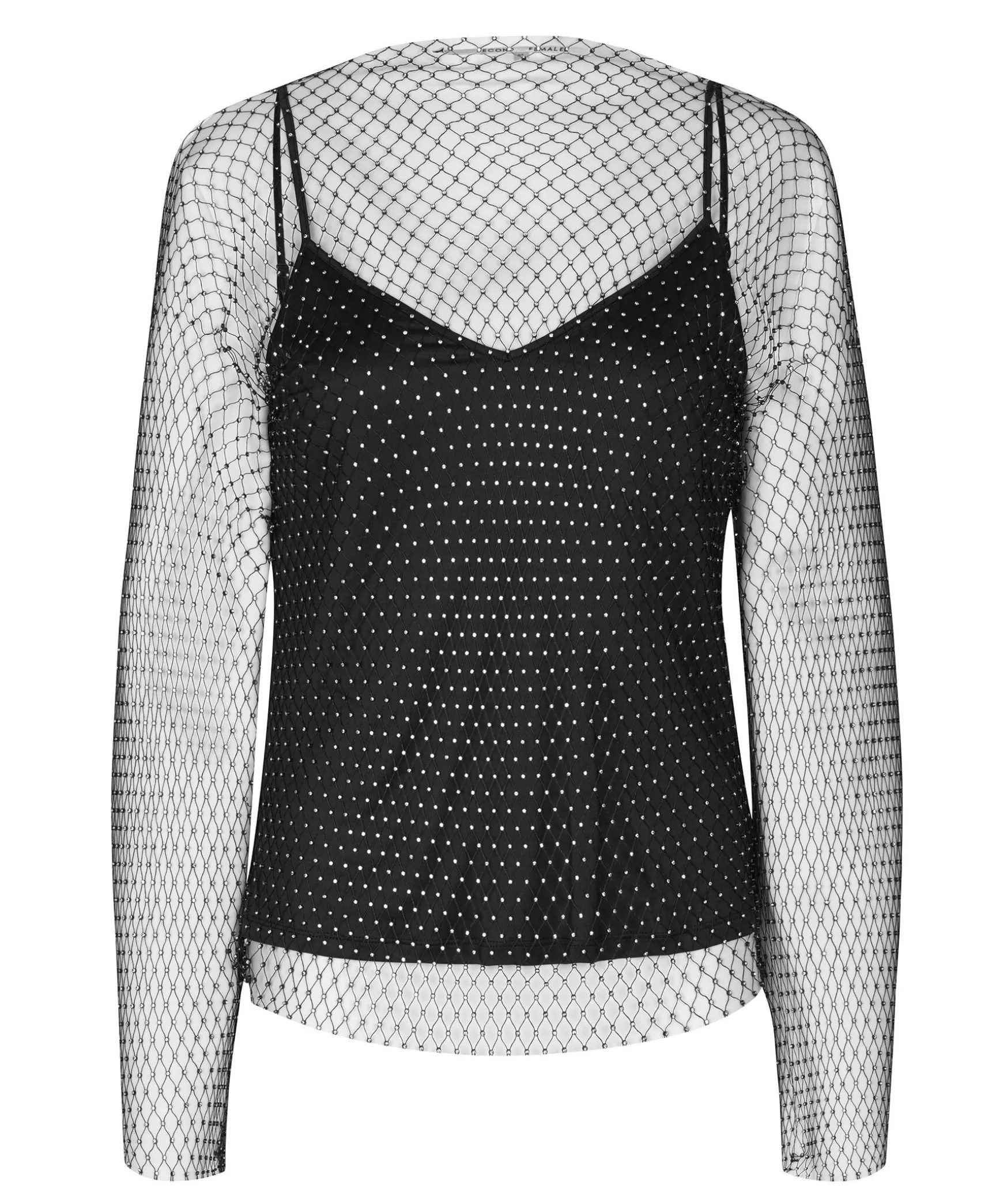Svart Rhinestone Mesh-Topp Fran Second Female. Med Ett Lost Natskikt Med Gnistrande Strassparlor I Miniatyr. Kortare Avtagbar Vasttopp Med Justerbara Axelband. Rund Hals Och Nedsankta Axlar Med Extra Langa Armar. Tight Passform.