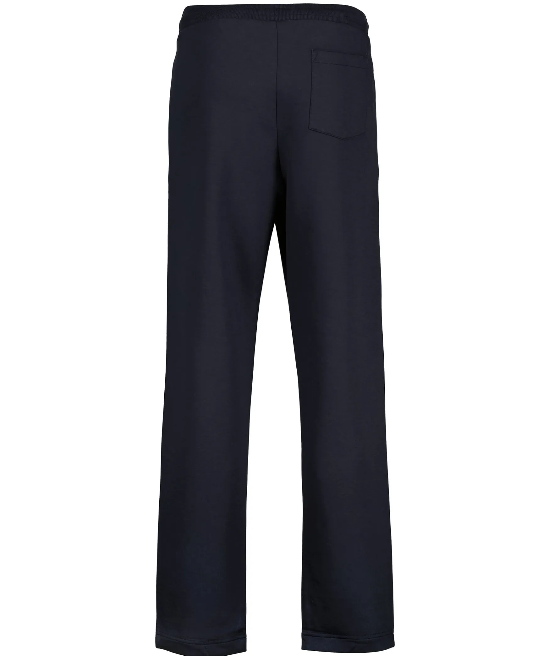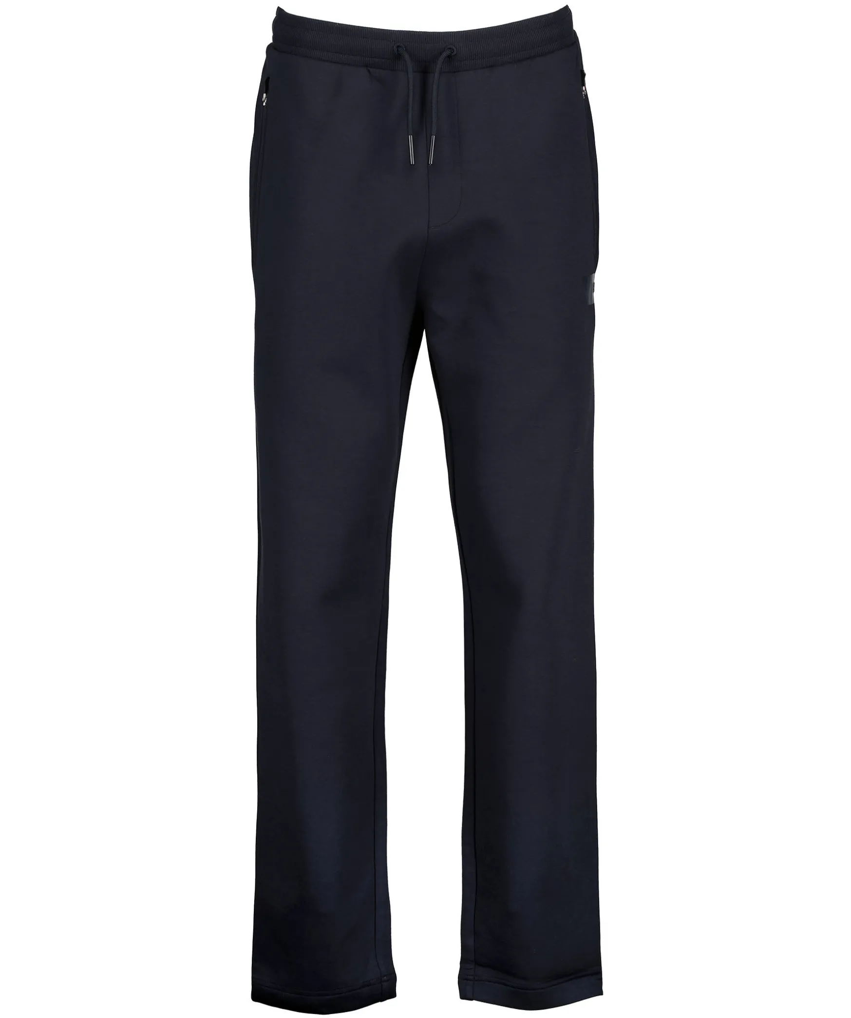 Morkbla Mjukisbyxor Fran Boss Green. Dragsko I Midjan. Tva Fickor Framtill Som Stangs Med Dragkedjor I Svart. Bakficka Pa Hoger Sida. Gummerad Logotyp Pa Vanster Lar Med Vit Bakgrund. Vita Detaljer.