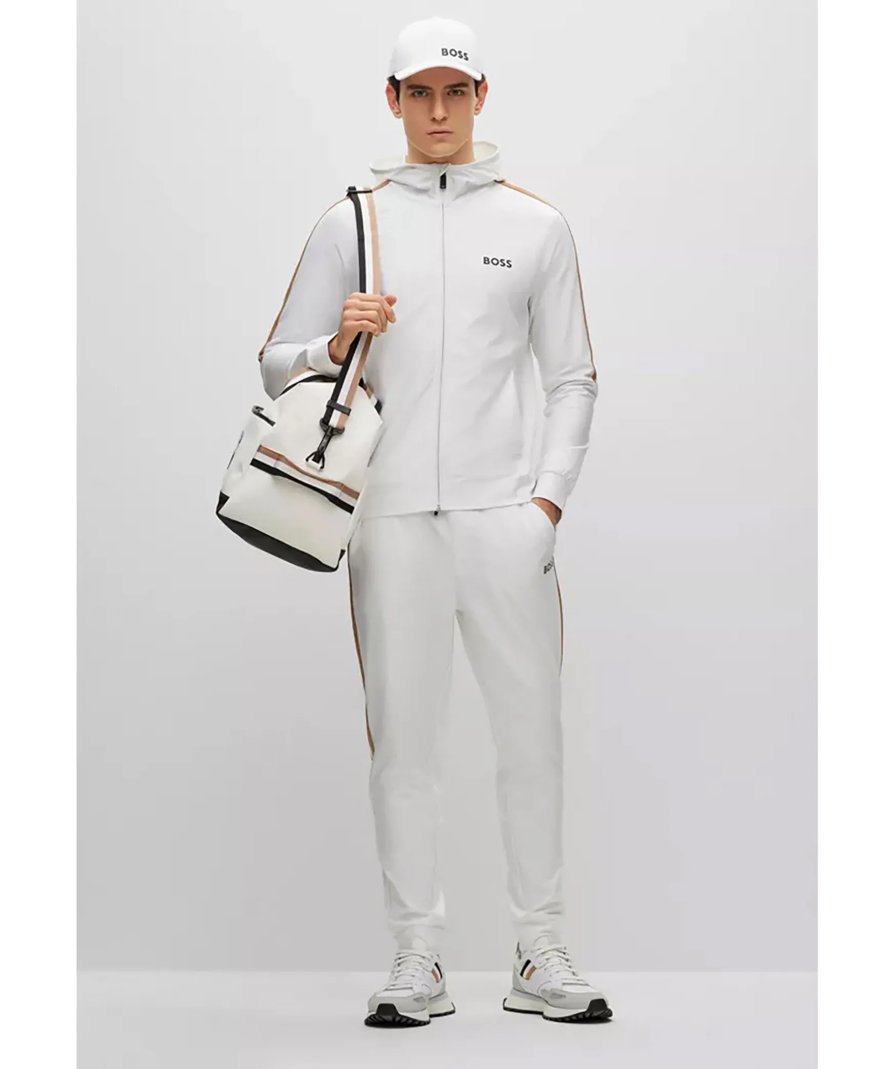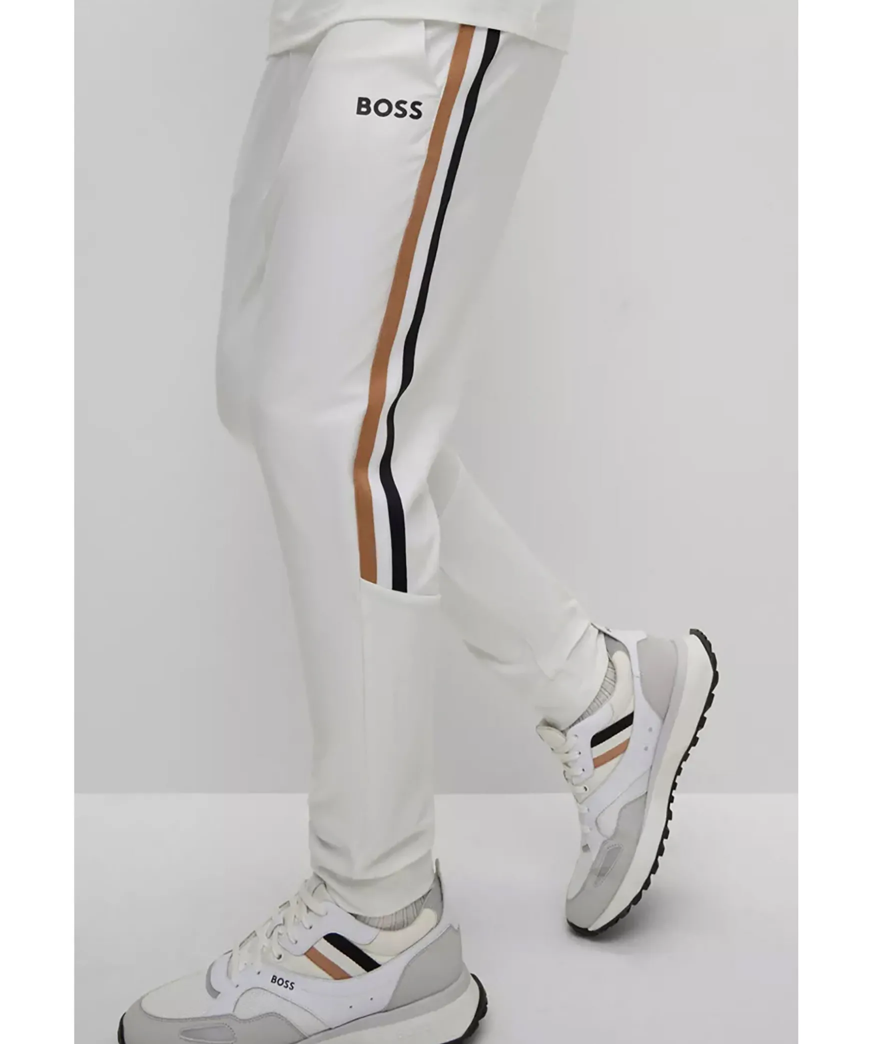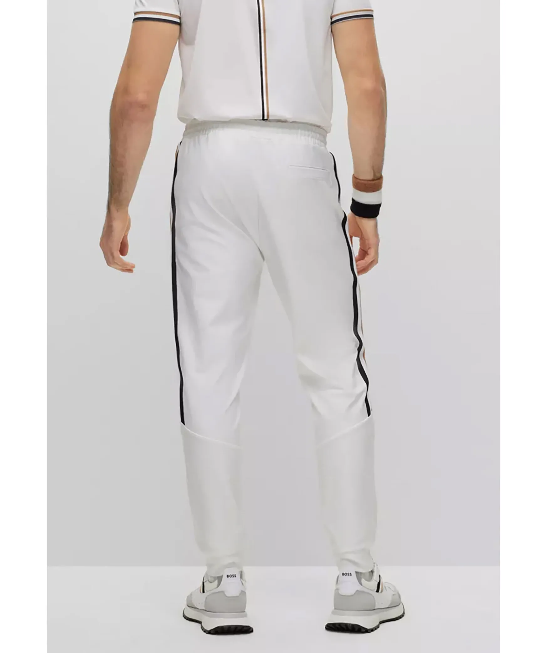 Vita Tracksuitbyxor Fran Boss Green. Vit, Liten Boss-Logotyp Under Den Vanstra Fickan Och Detaljerade Med Signaturrander Vid Varje Sidosom. Dragsko I Midjan Med Snorning, Fickor I Sidorna. Prestandastretchtyget Ger Enkel Komfort Pa Aktiva Dagar. En Del Av Den Dynamiska Kapselkollektionen Boss X Matteo Berrettini, Skapad Av Den Italienska Professionella Tennisspelaren.