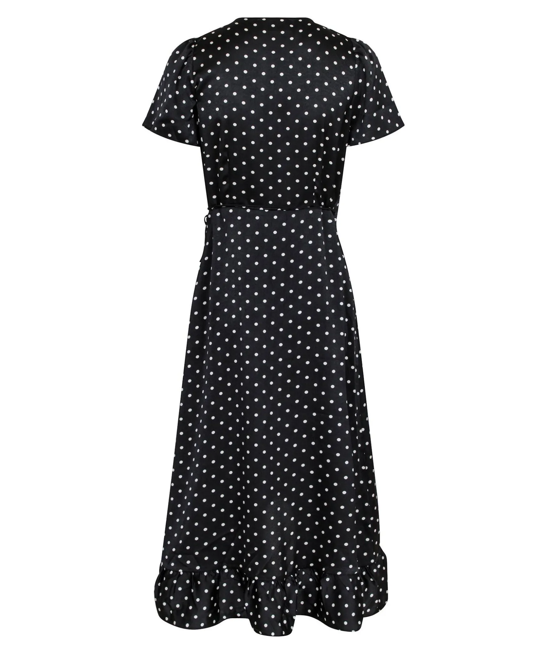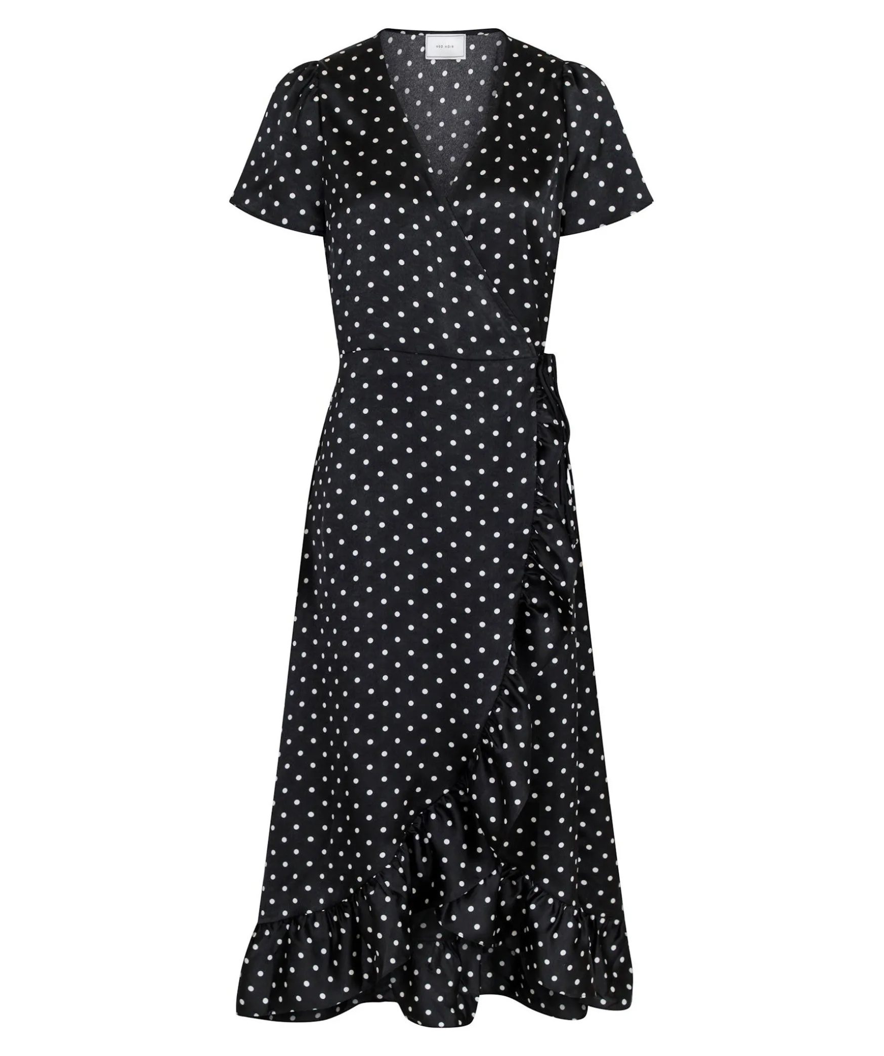 Svart Och Vit Prickig Klanning I Omlott-Modell Fran Neo Noir. V-Ringad. Kjol Med Volanger. Snorning I Midjan. Korta Armar. Klanningen Slutar Strax Nedanfor Knana.